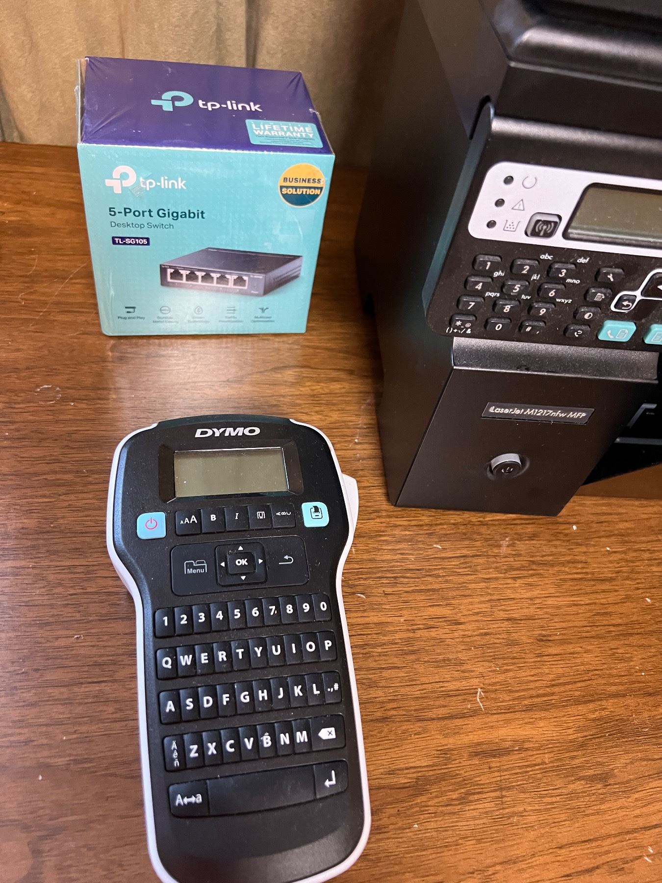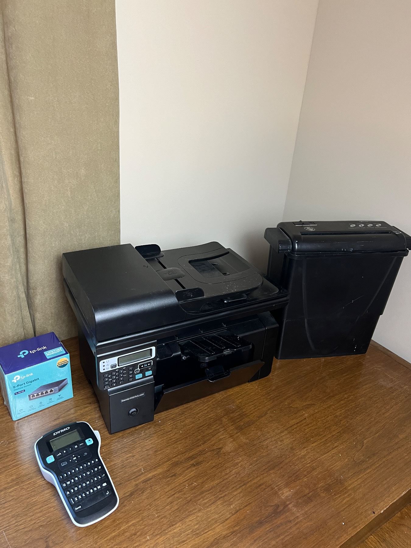 Includes, 5 Port Gigabit Desktop Switch (new in packaging), Dymo Label Printer, Paper Shredder, LaserJet M1217 Printer, all in working condition