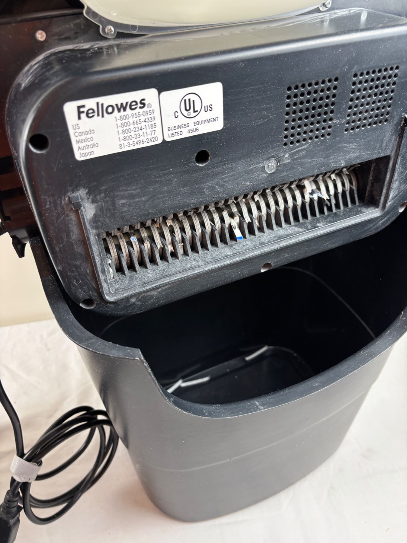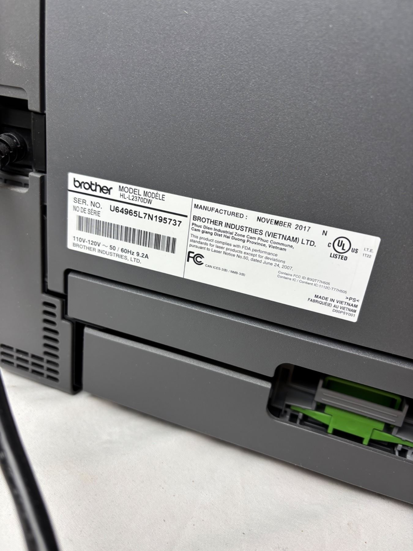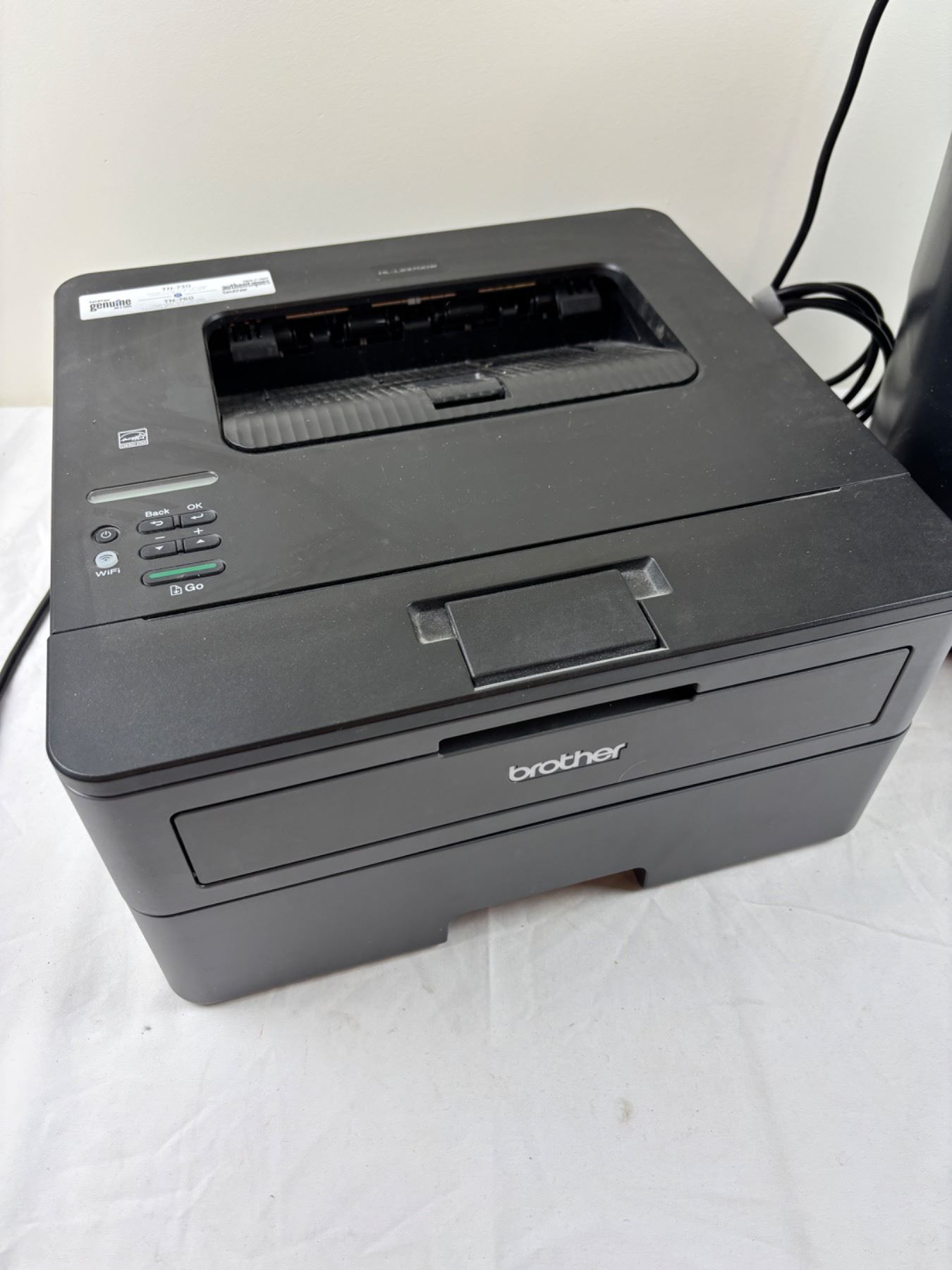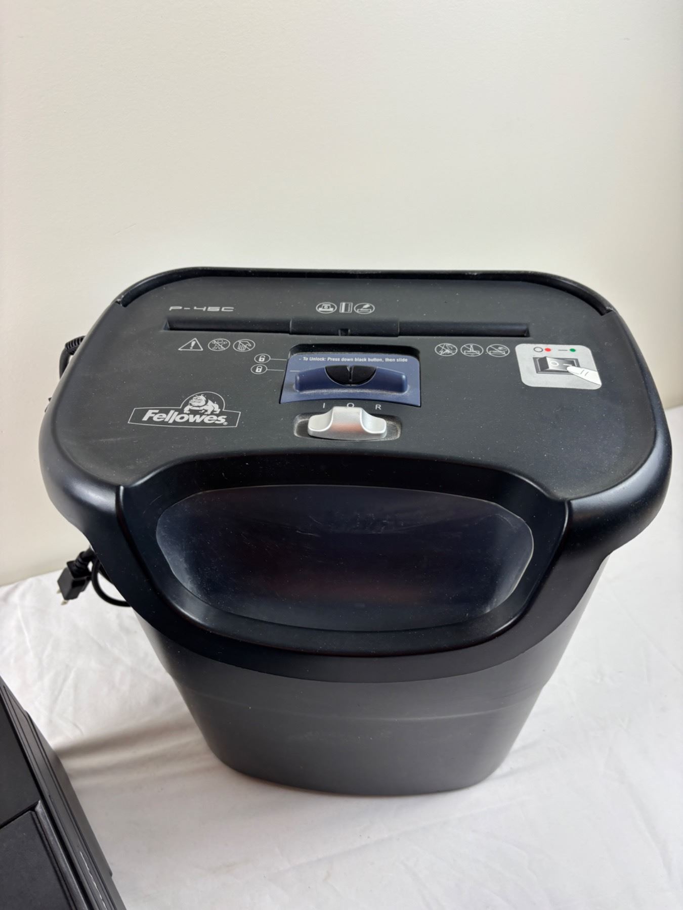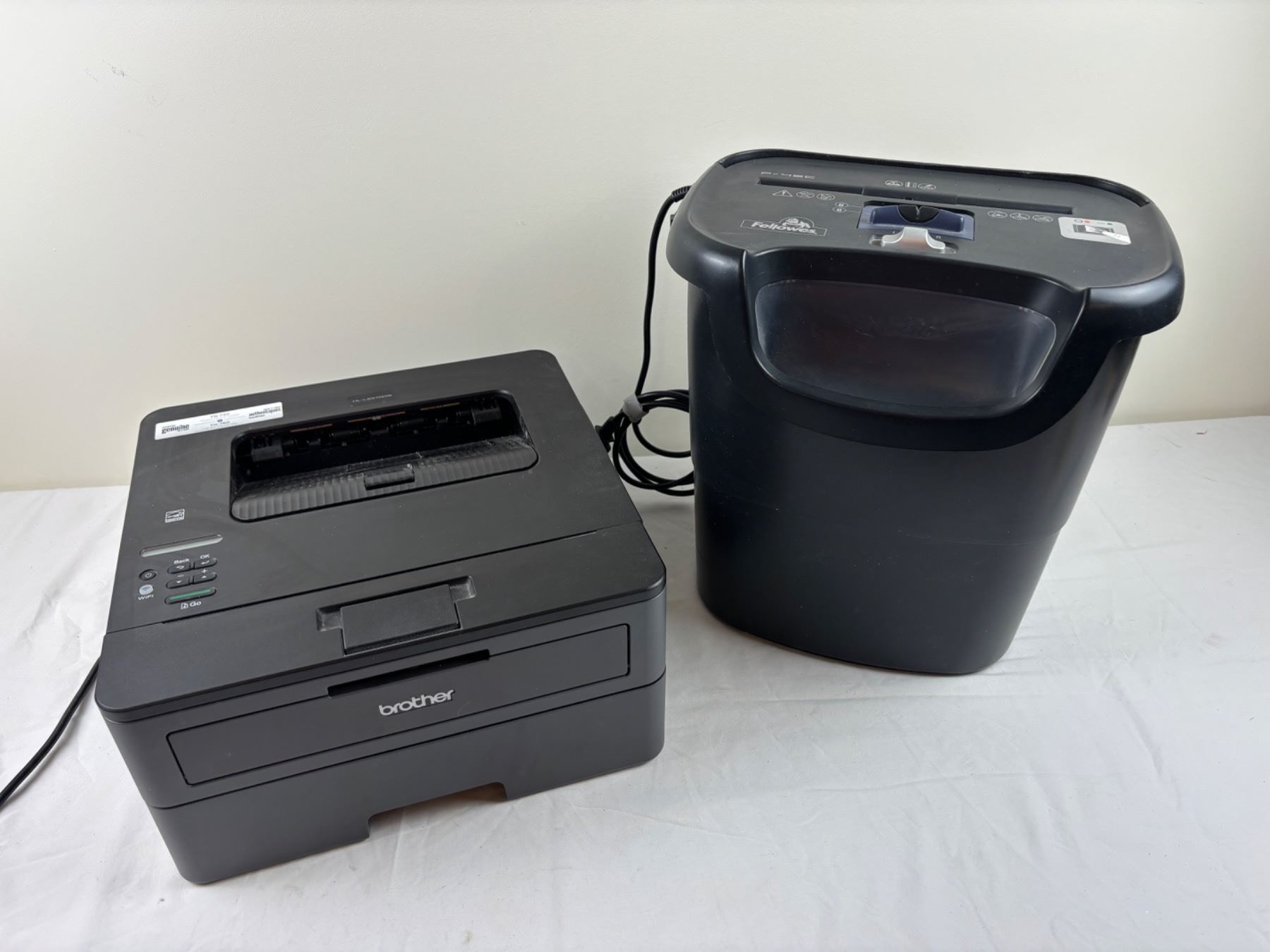 Includes a Brother printer Model No. HL-L2370DW, Fellowes P-45C paper shredder, both turn on