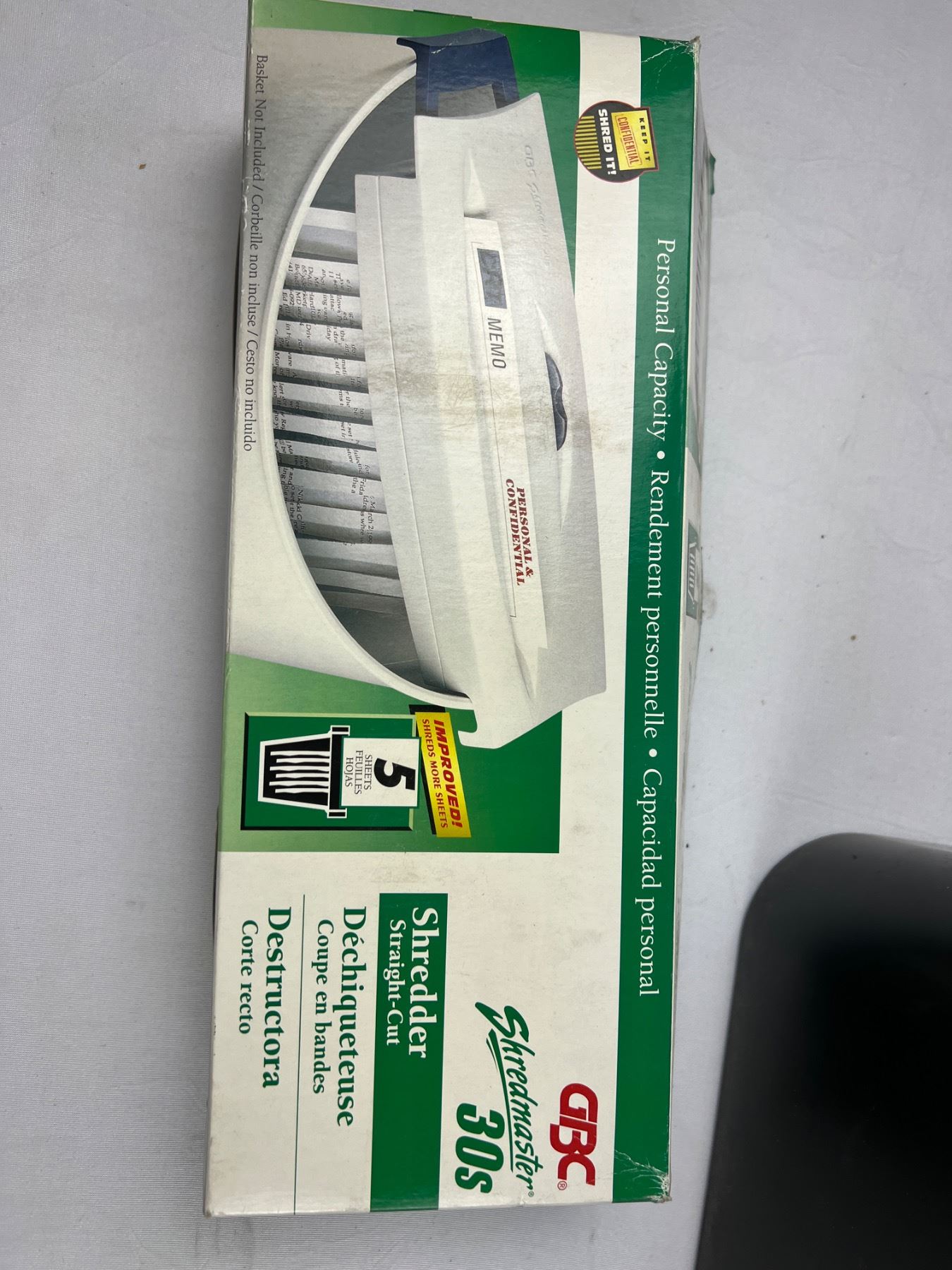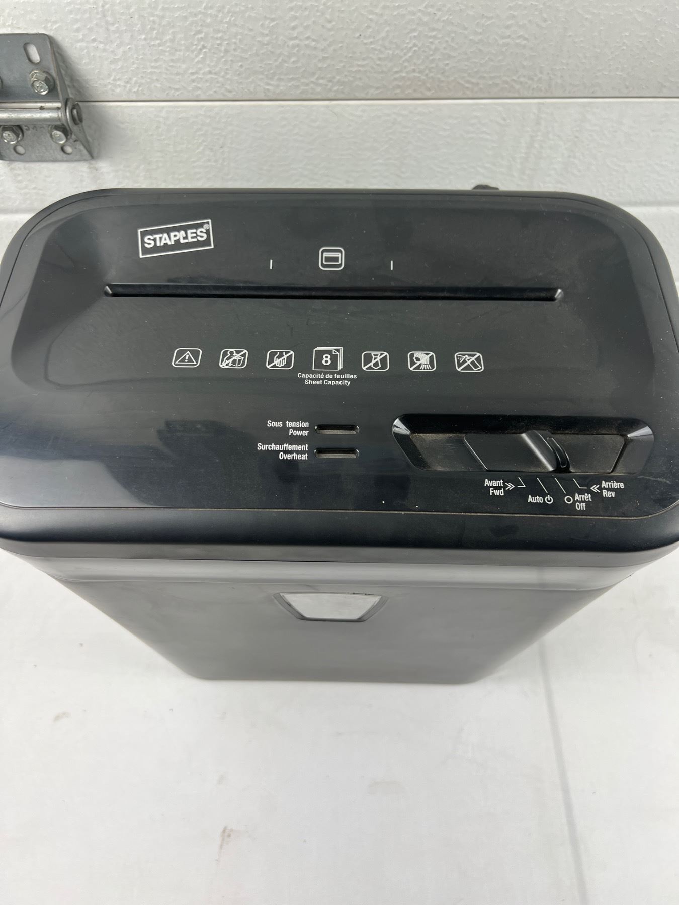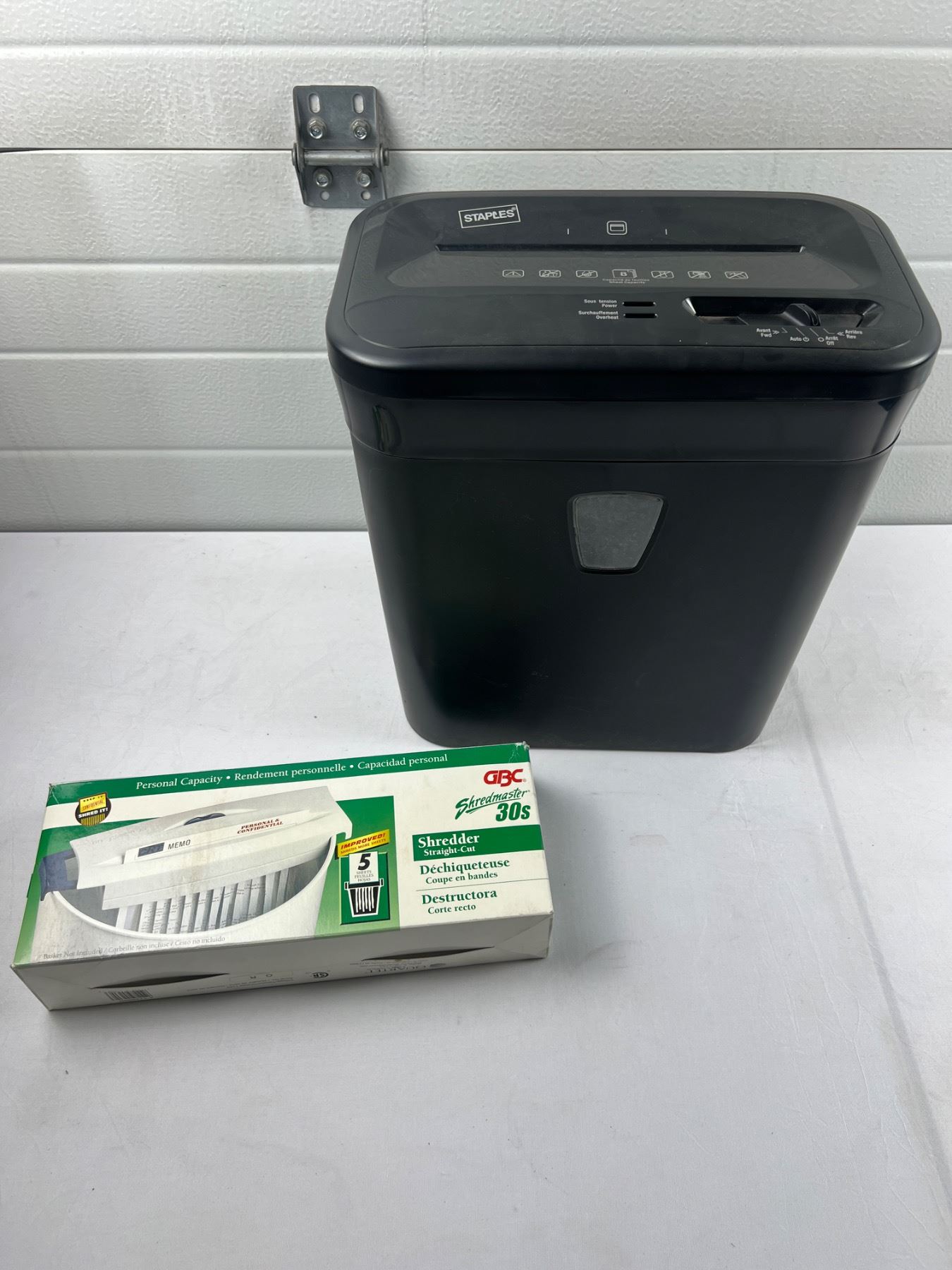 Both in working condition, the Staples shredder is 13"L x 8"W x 15"H