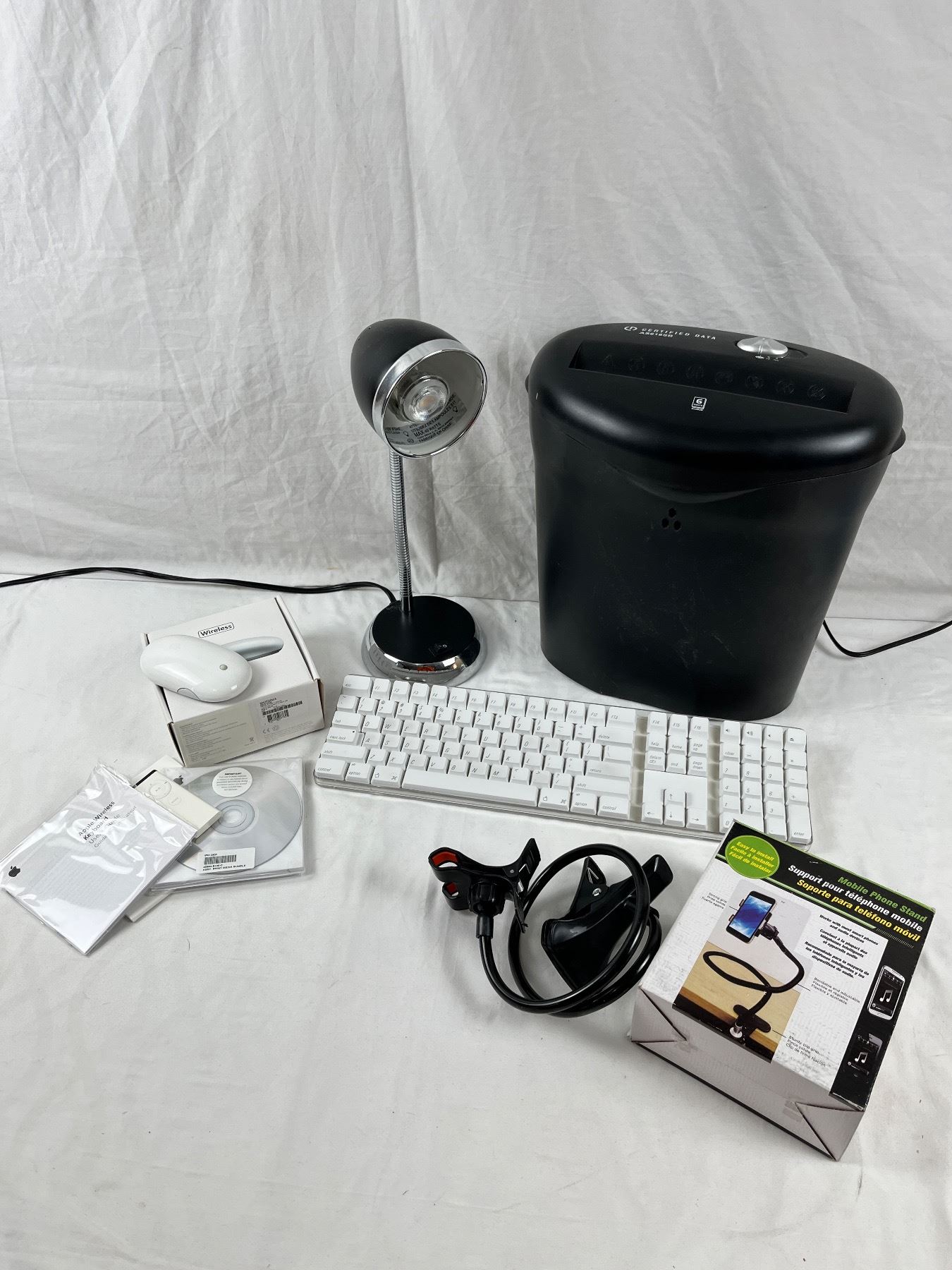 Includes, Brother Printer (turns on), Paper shredder (works), Lamp (works), Apple wireless mouse and keyboard (not tested), etc.