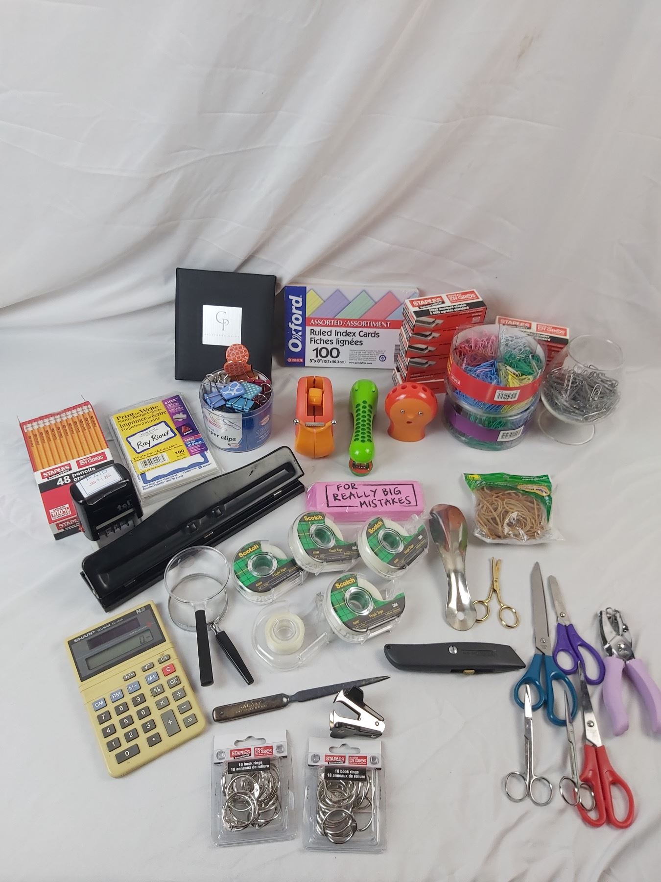 Includes an assortment of staples, tape, pencils, paper clips, etc.