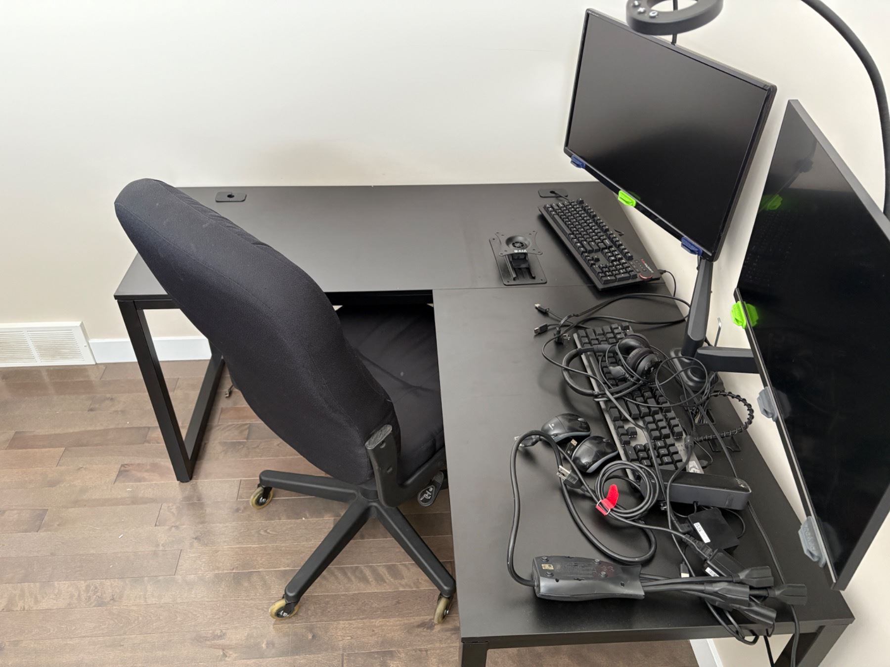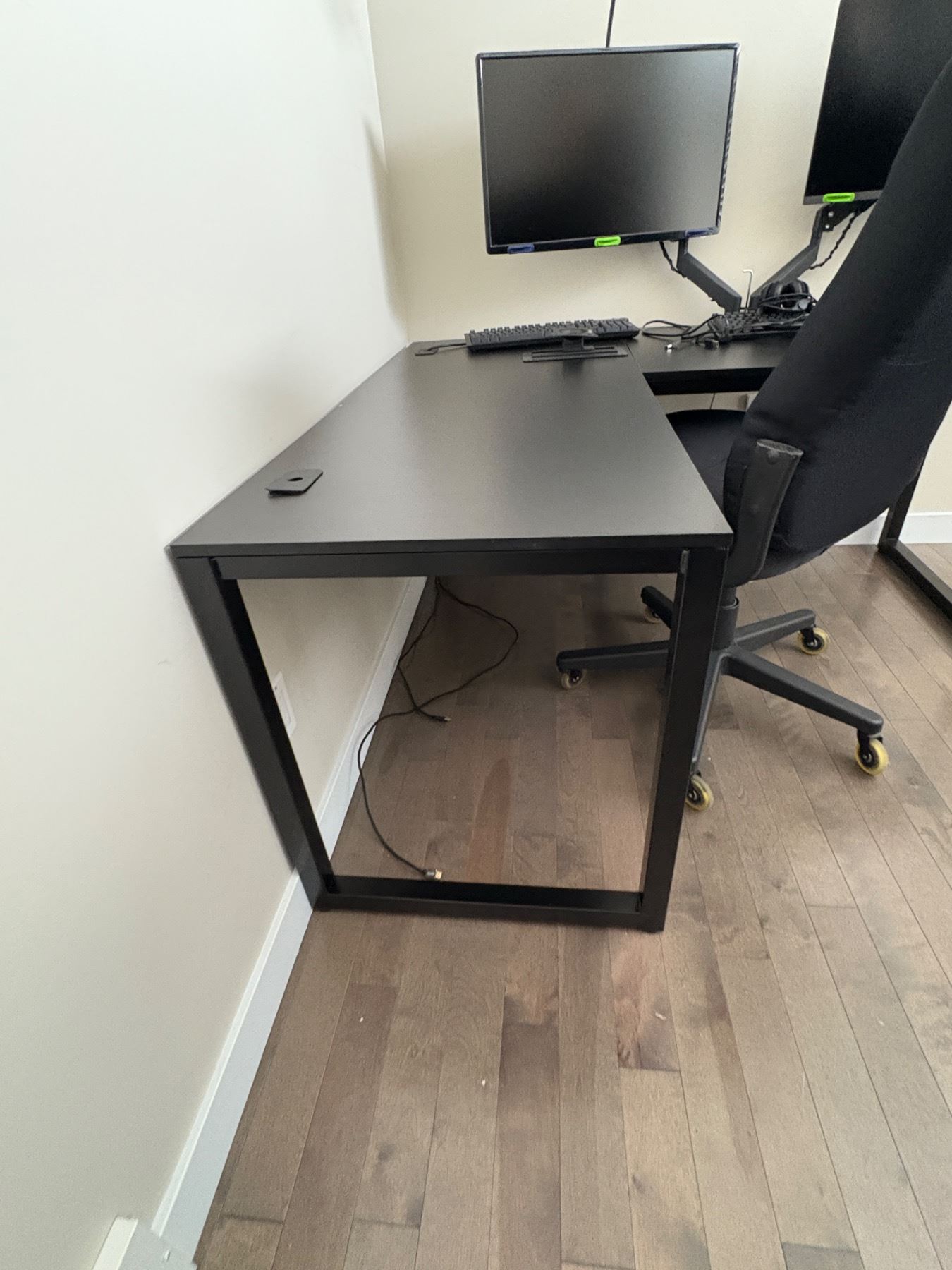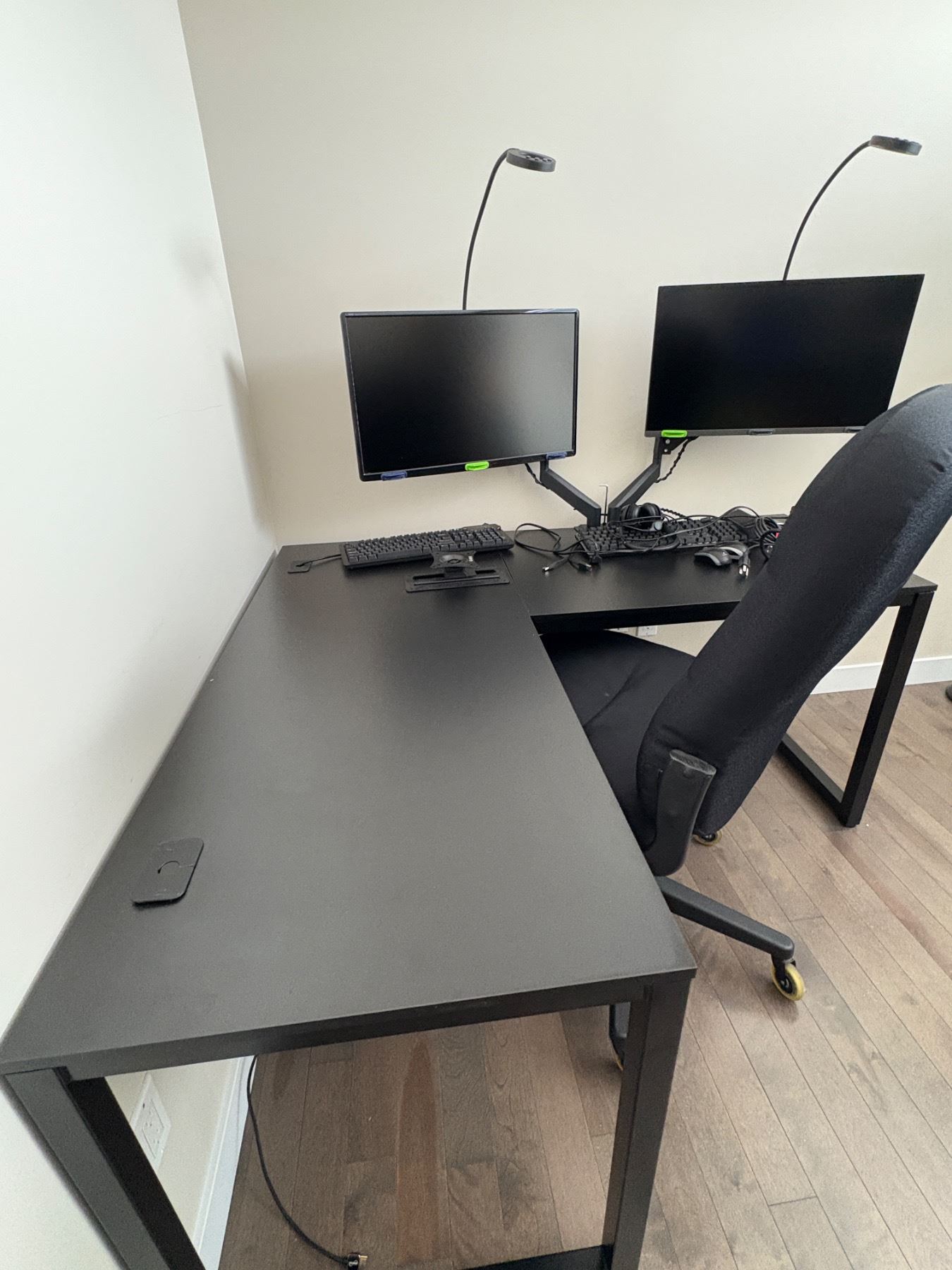 Corner desk measures 28" x 55"x 60" x 24". includes dual Samsung and acer monitors, keyboards, headphones and two circle lamps