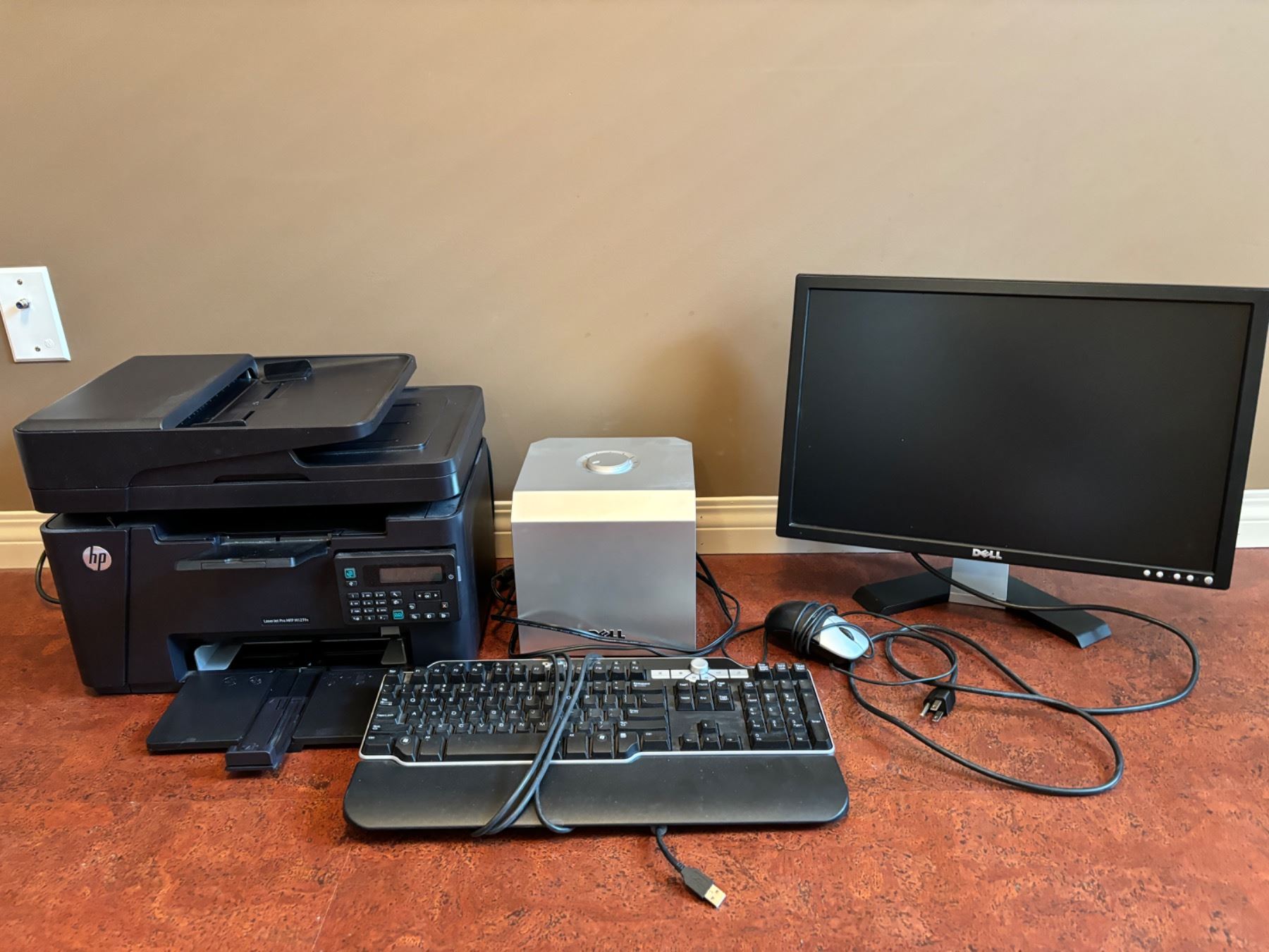 HP has power, dell speaker keyboard and mouse, dell monitor 20", monitor is model: E207WFPc
