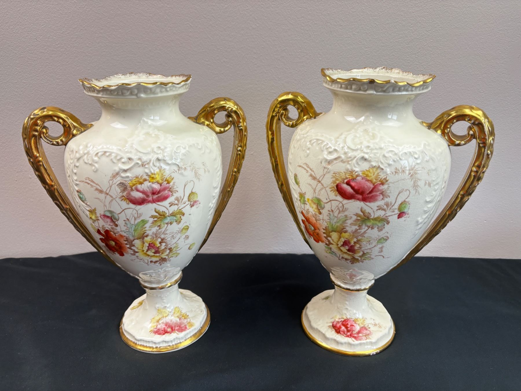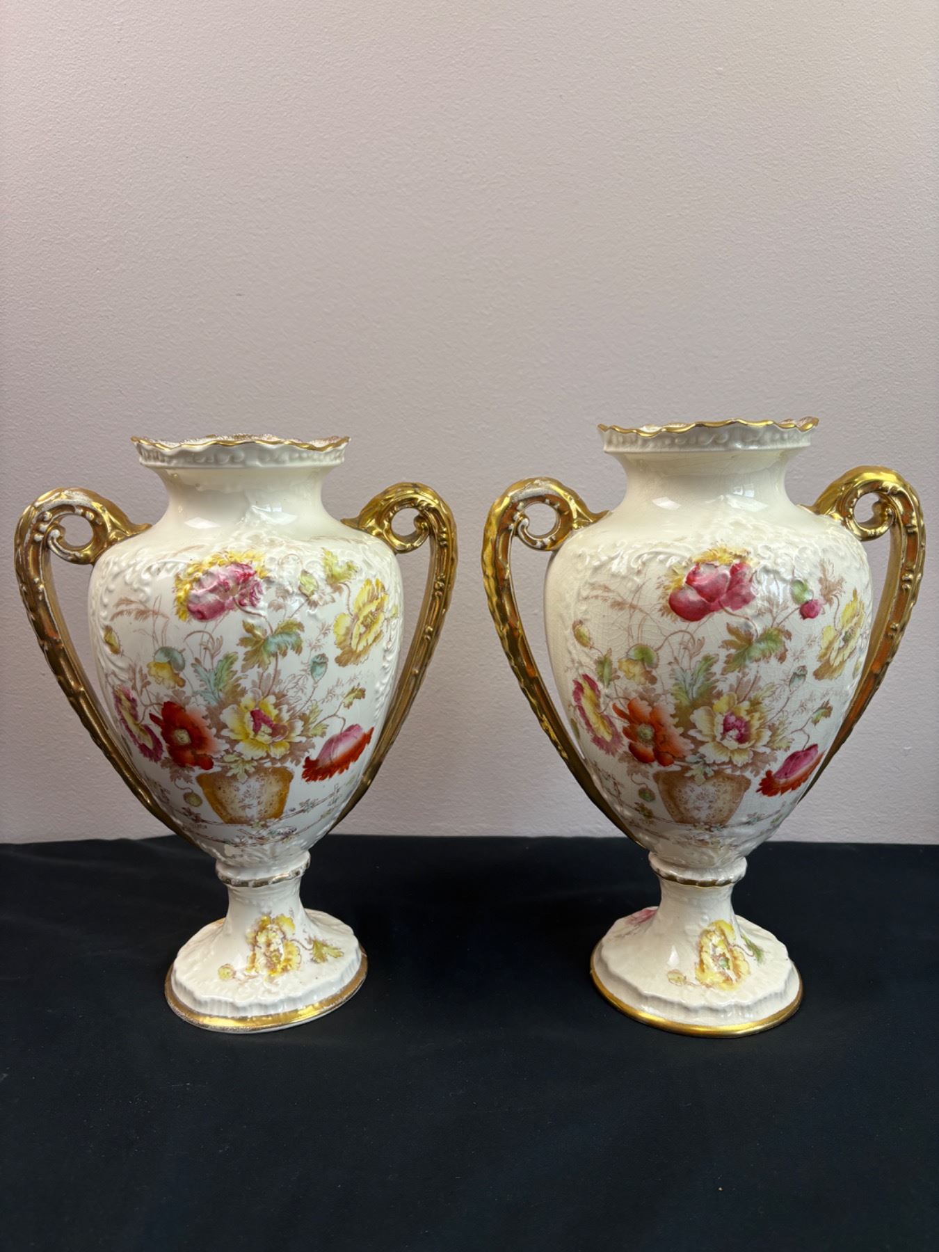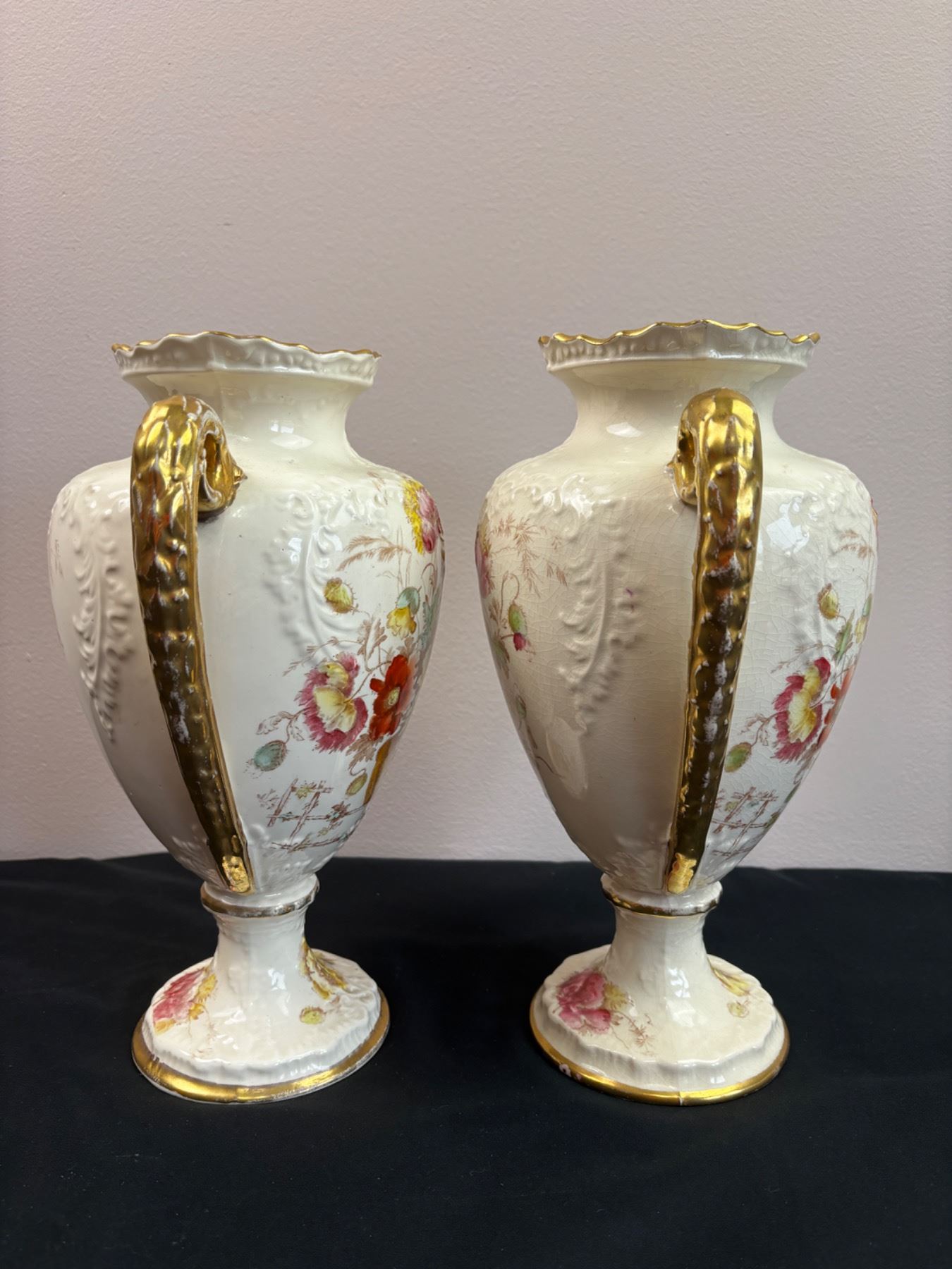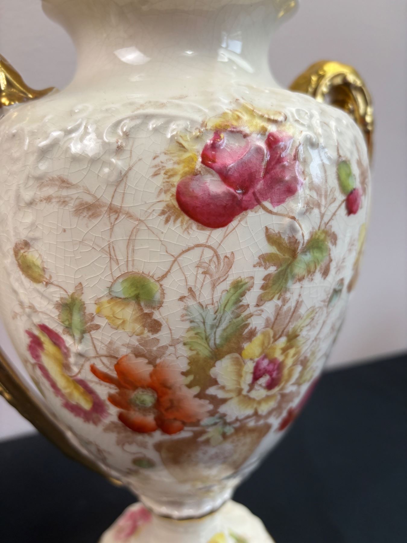 Approximately 11.5" tall and 8.5" wide. Victorian Style. Some of the painter glaze has begun to wear