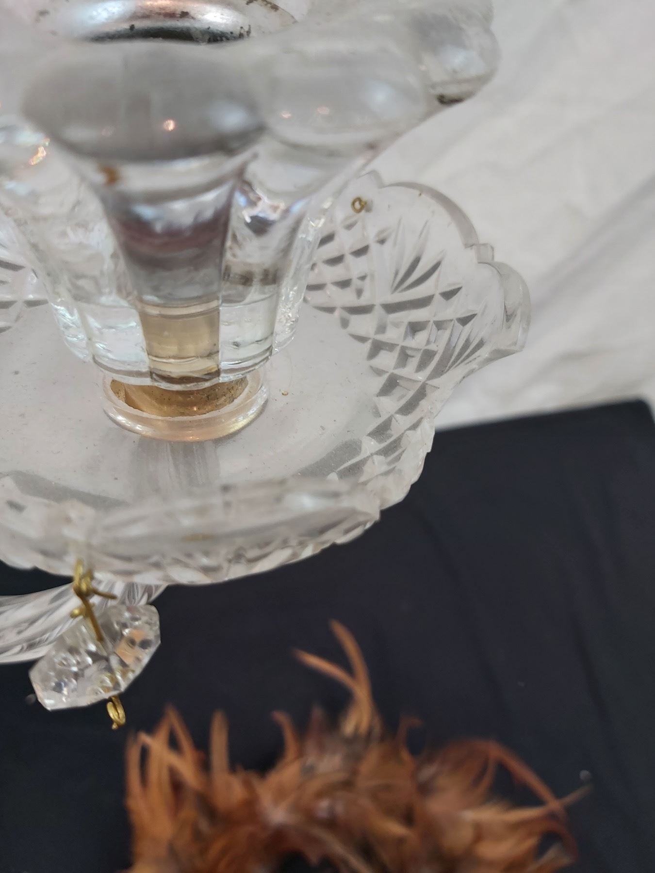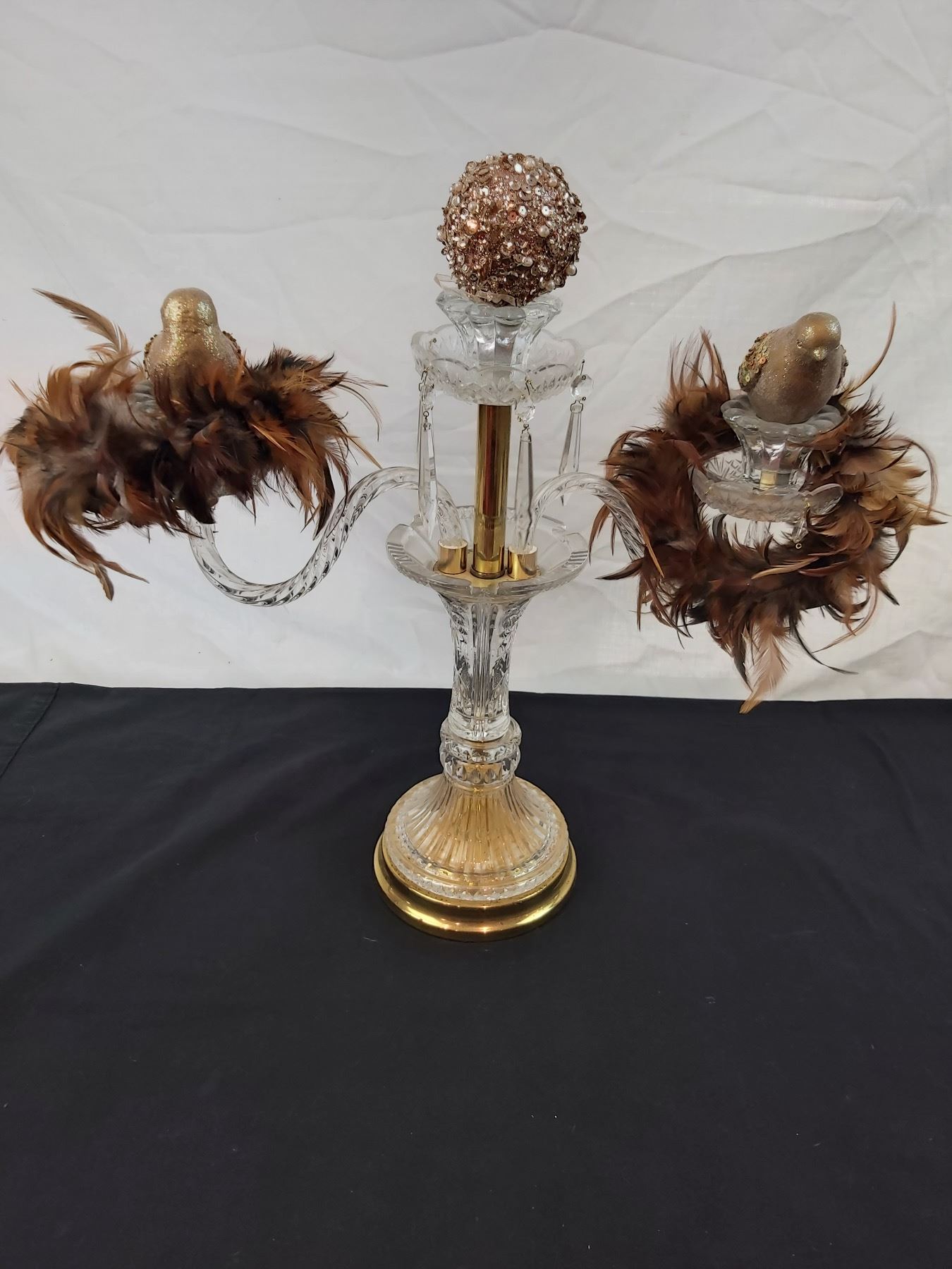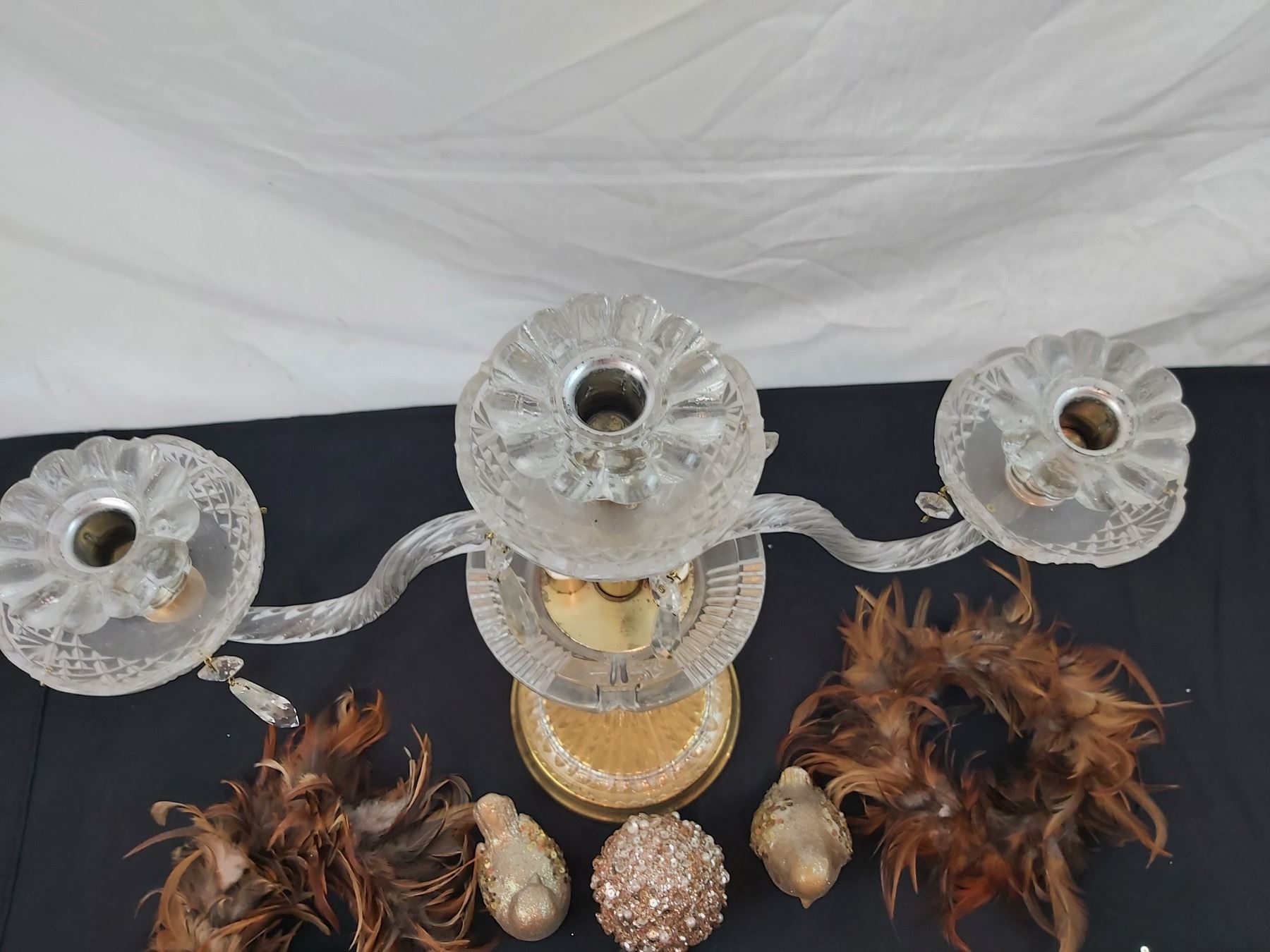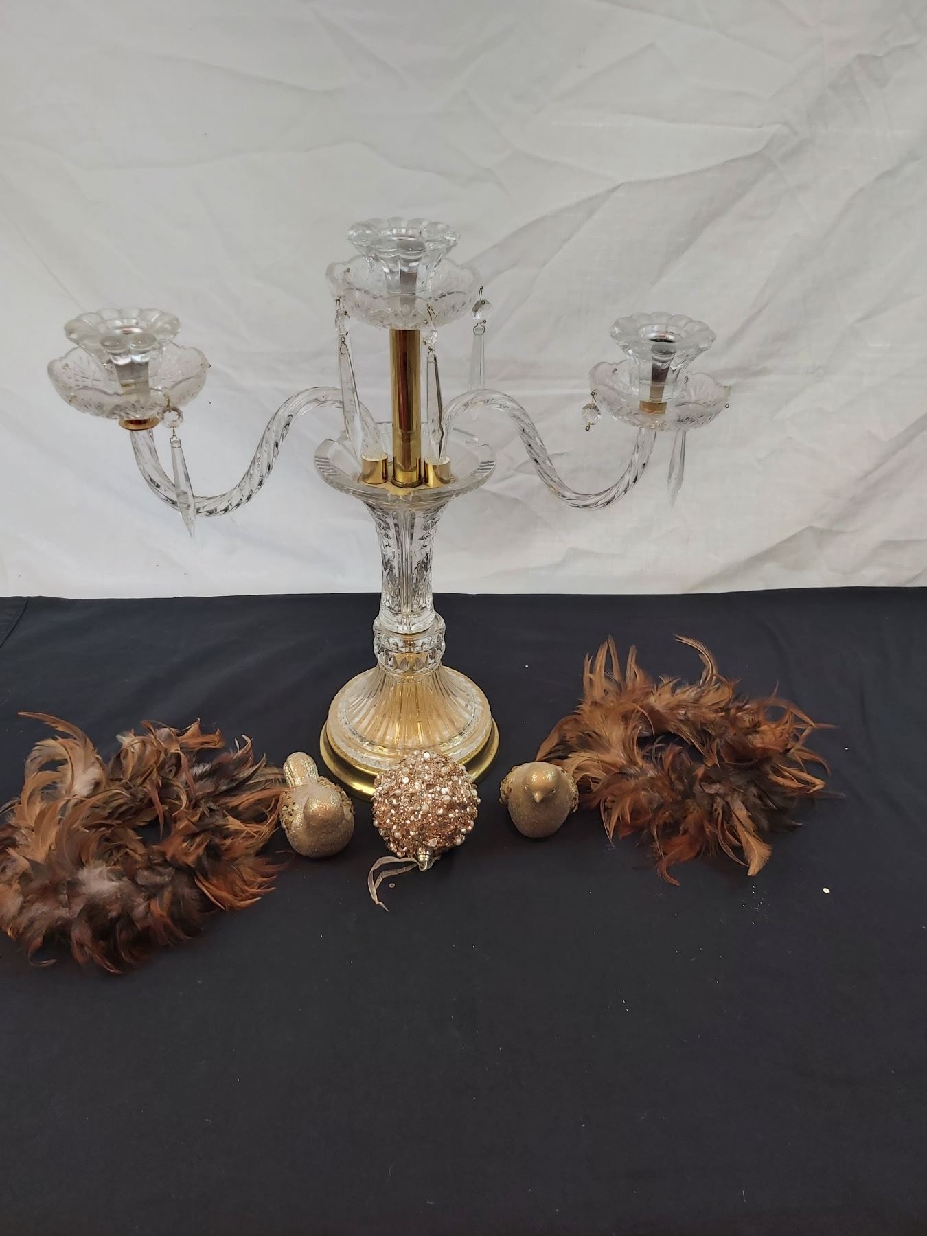 Missing some crystal charms, one dish is chipped, 20"L x 18"H