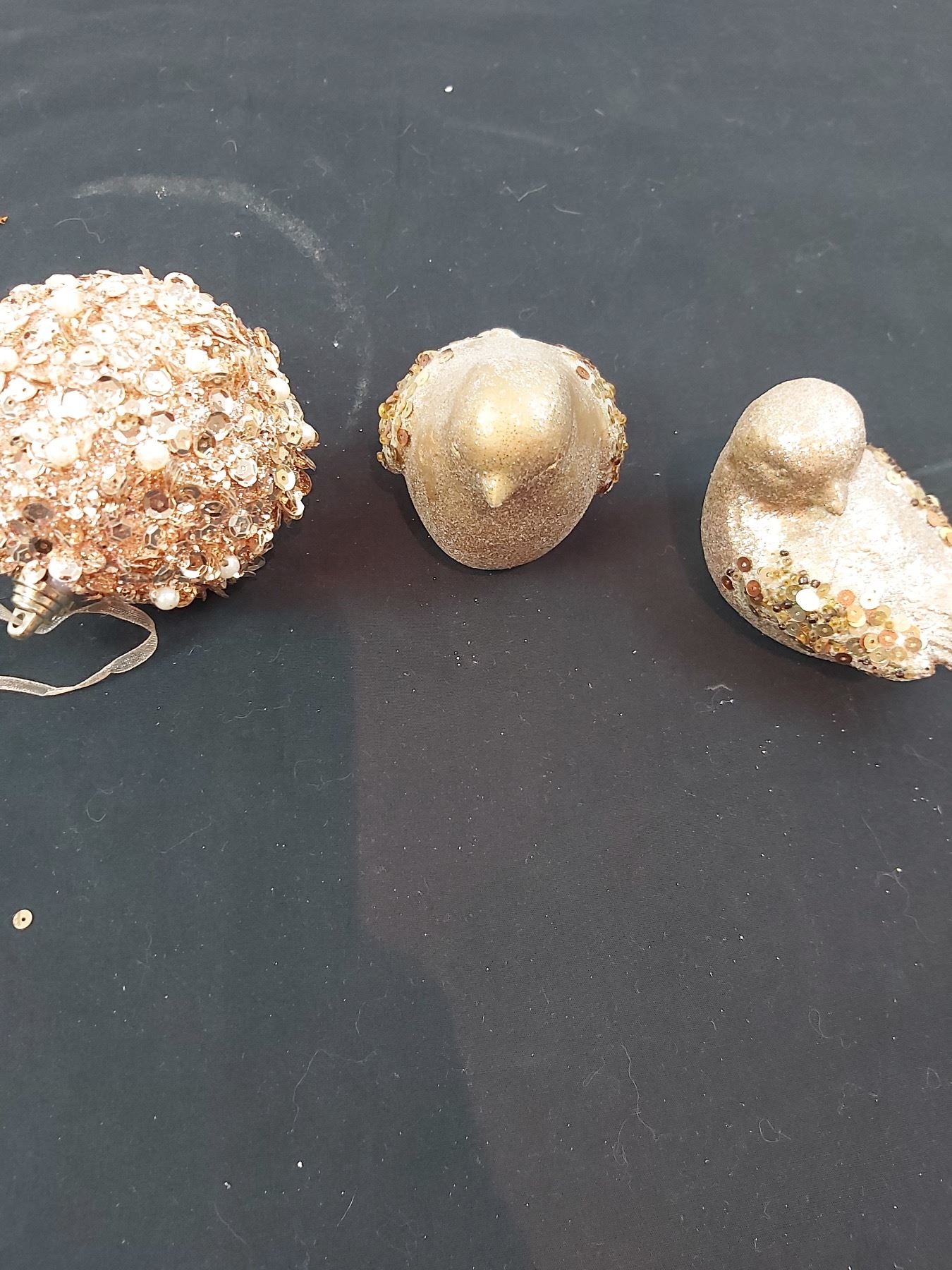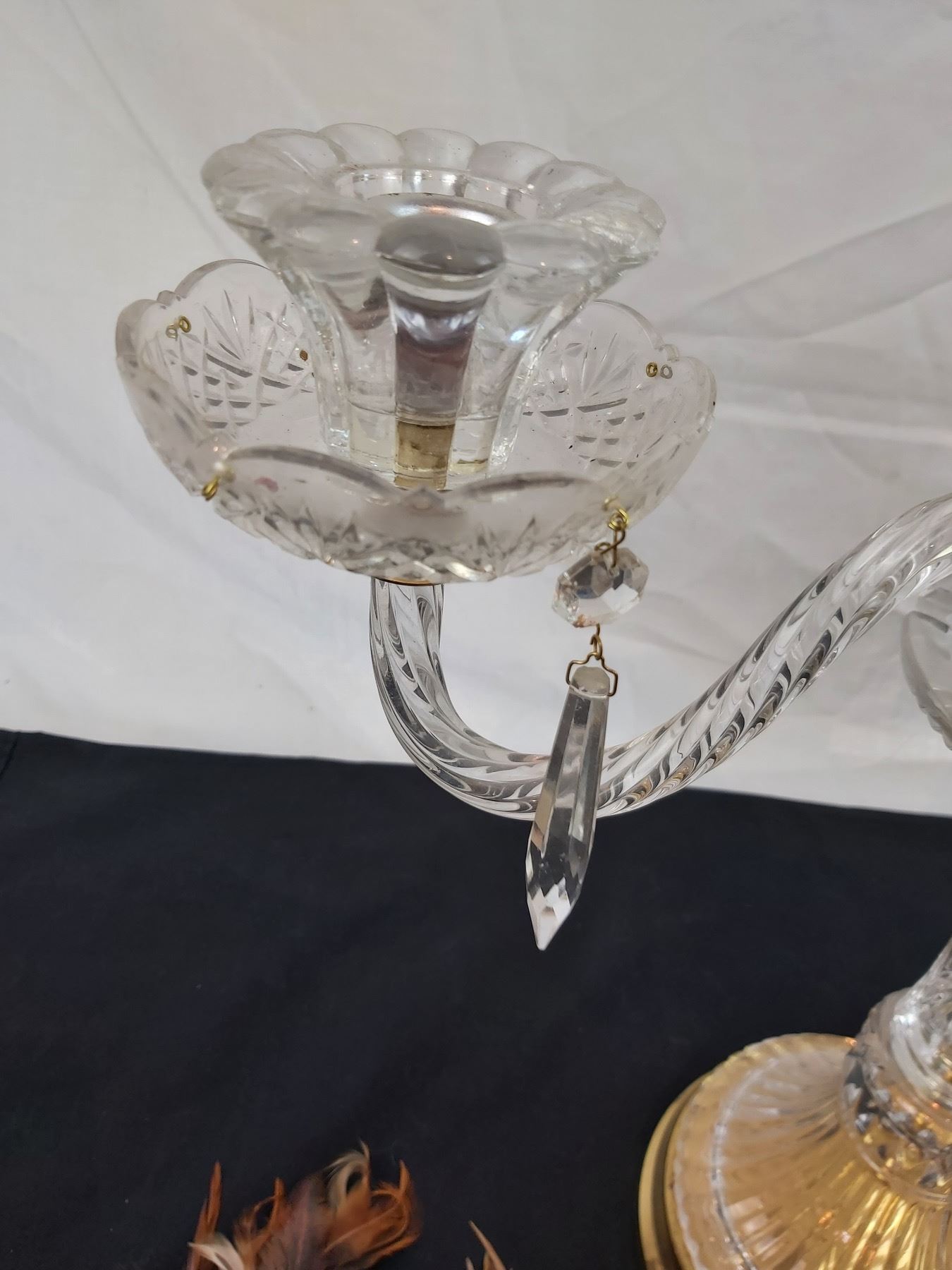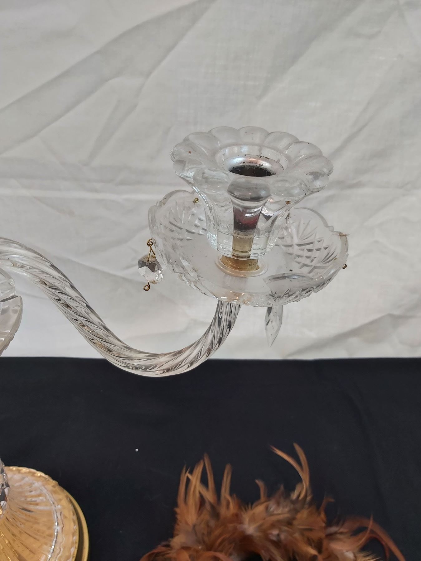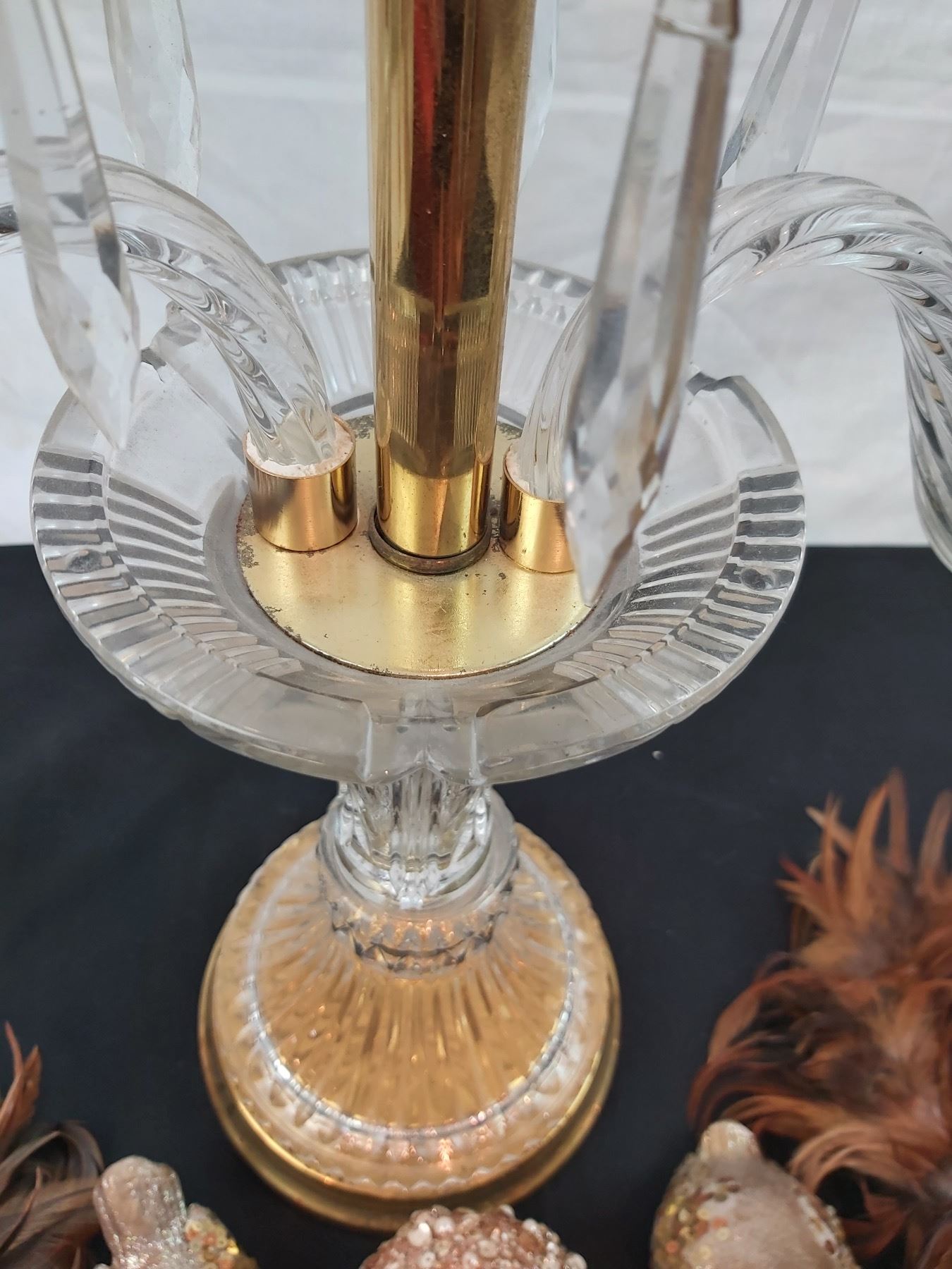 Missing some crystal charms, one dish is chipped, 20"L x 18"H