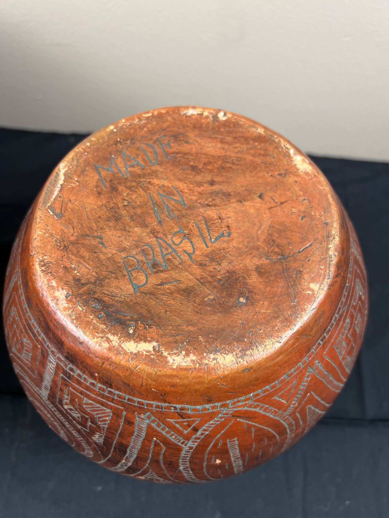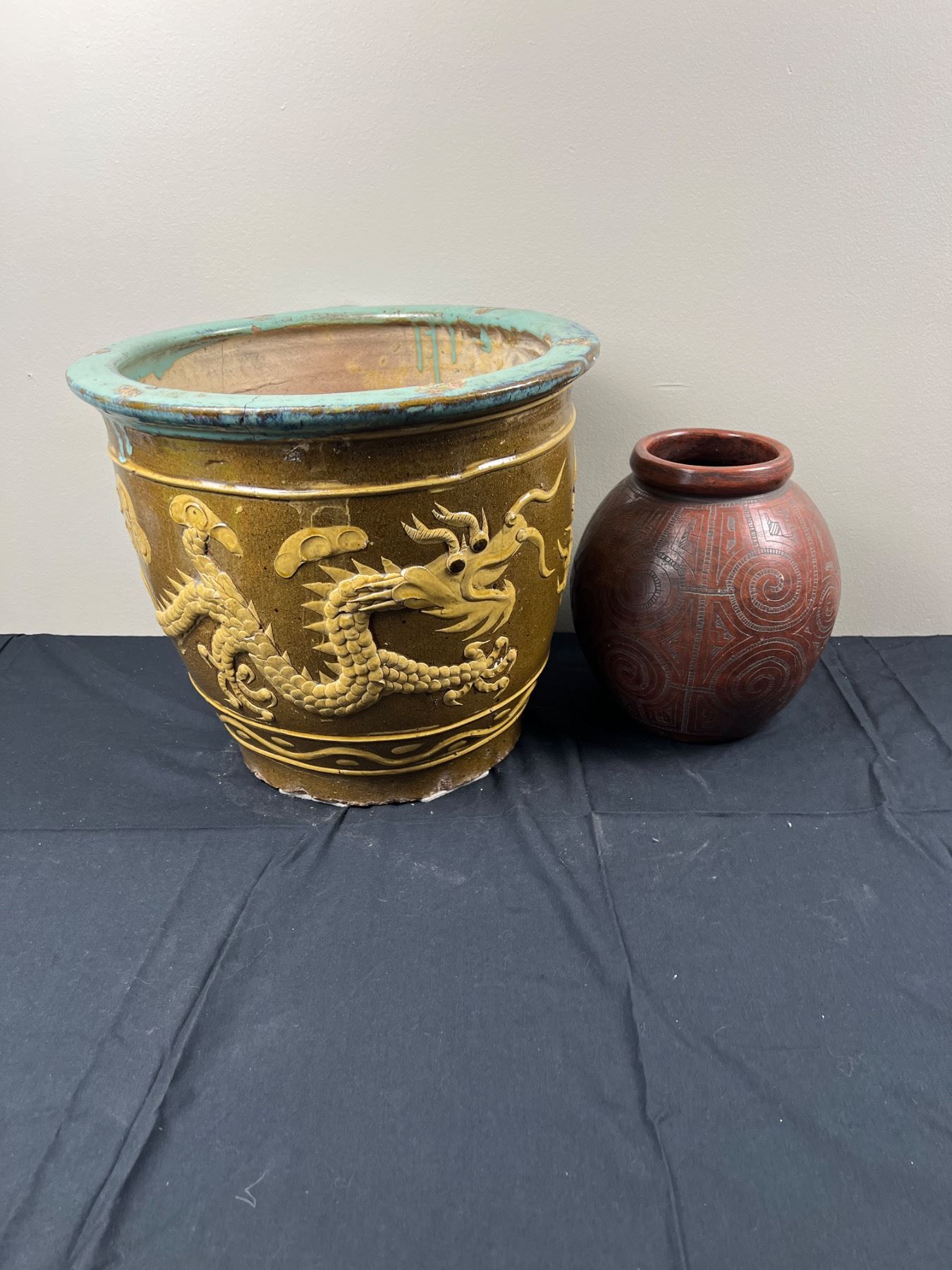 Larger piece measures 15" in diameter and 13" tall. Some cracks shown on this piece. Smaller piece has design etched into it.