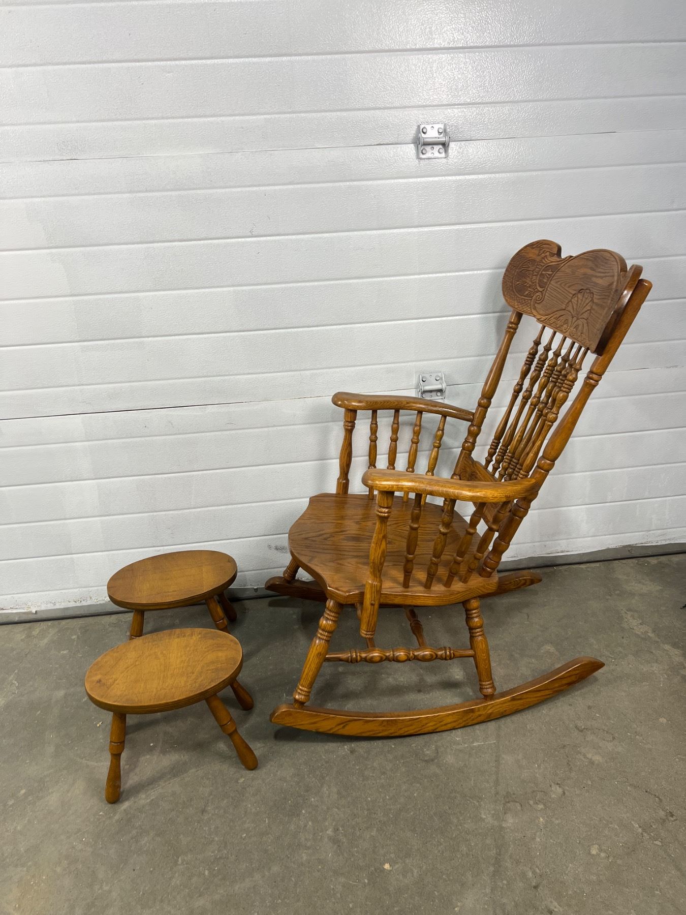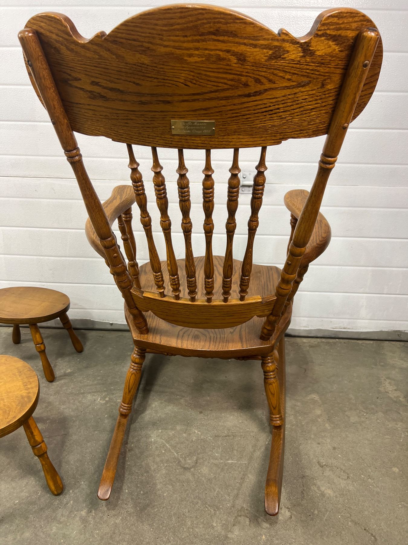 Measures 40" tall by 24" wide by 32". Includes a pair of footstools as well. Some marks to stools. Chair has plaque on rear that can be removed.