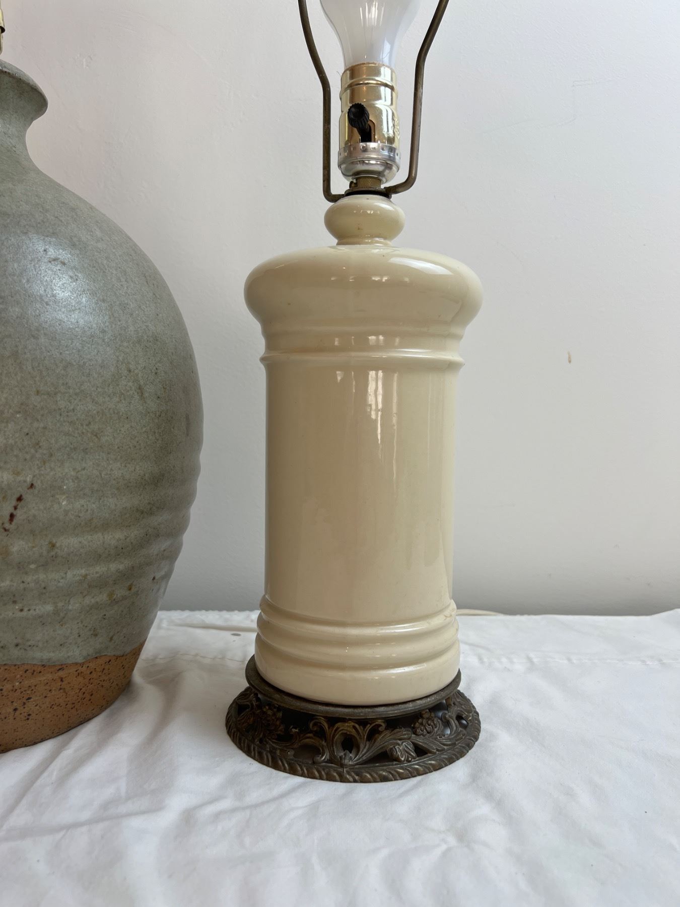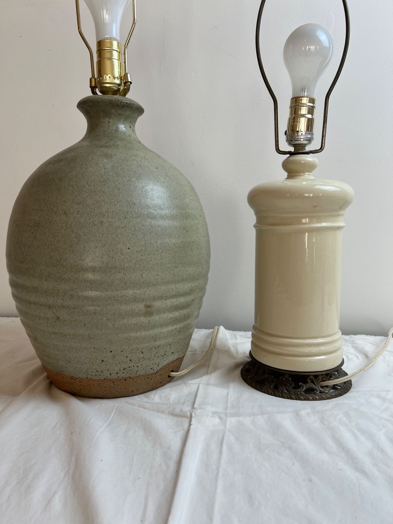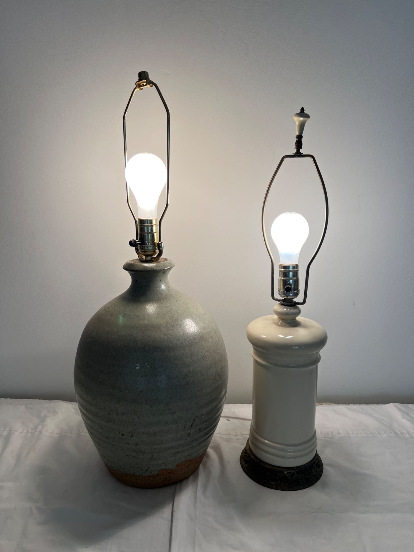 Urn style of lamp has 3 brightness levels that all work. Some tarnishing to base of white lamp. Urn measures 27" in height and approximately 10" in diameter at its widest point.