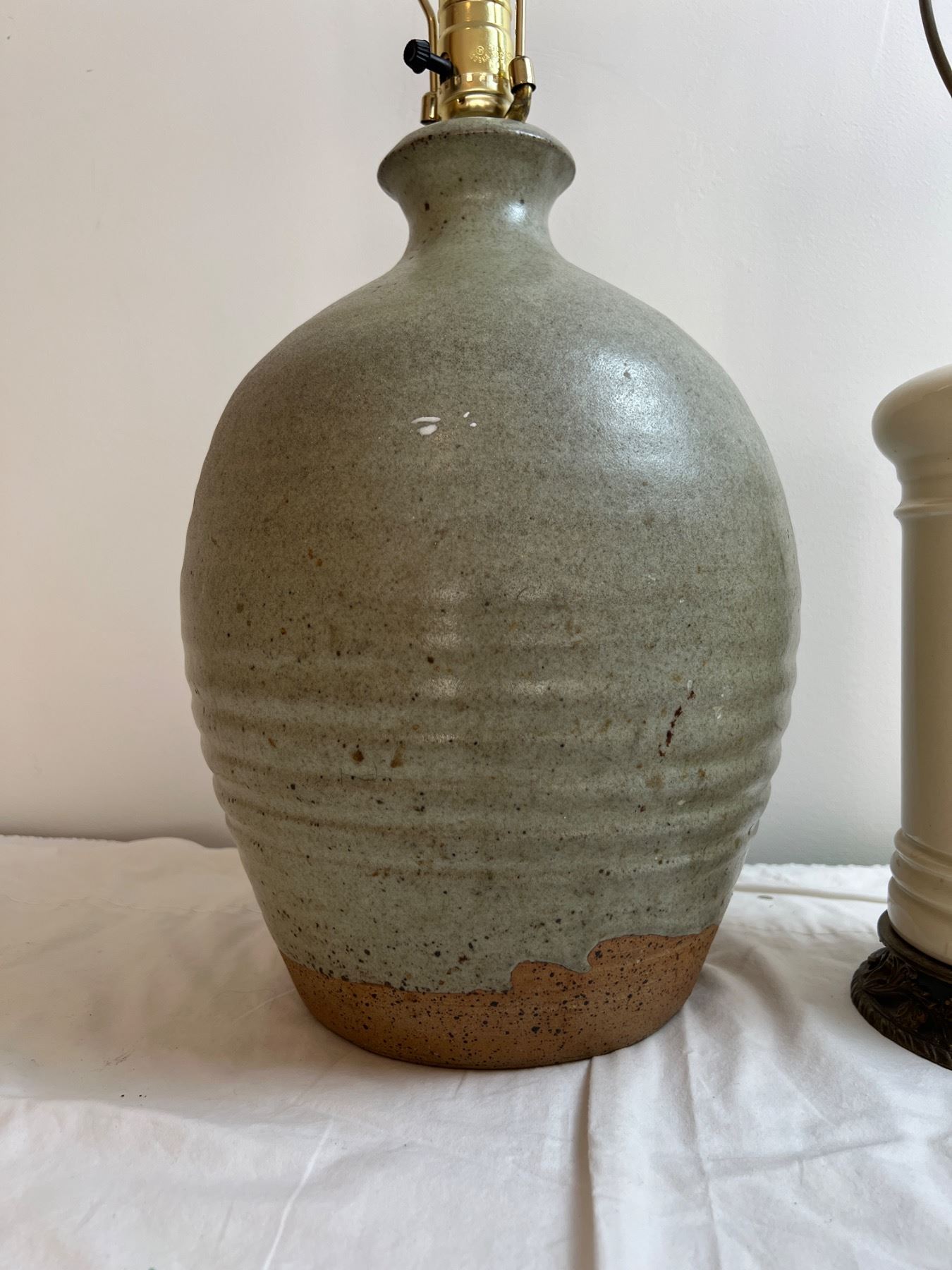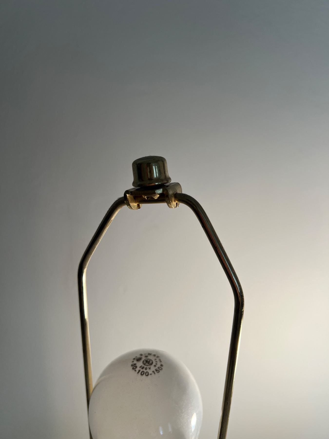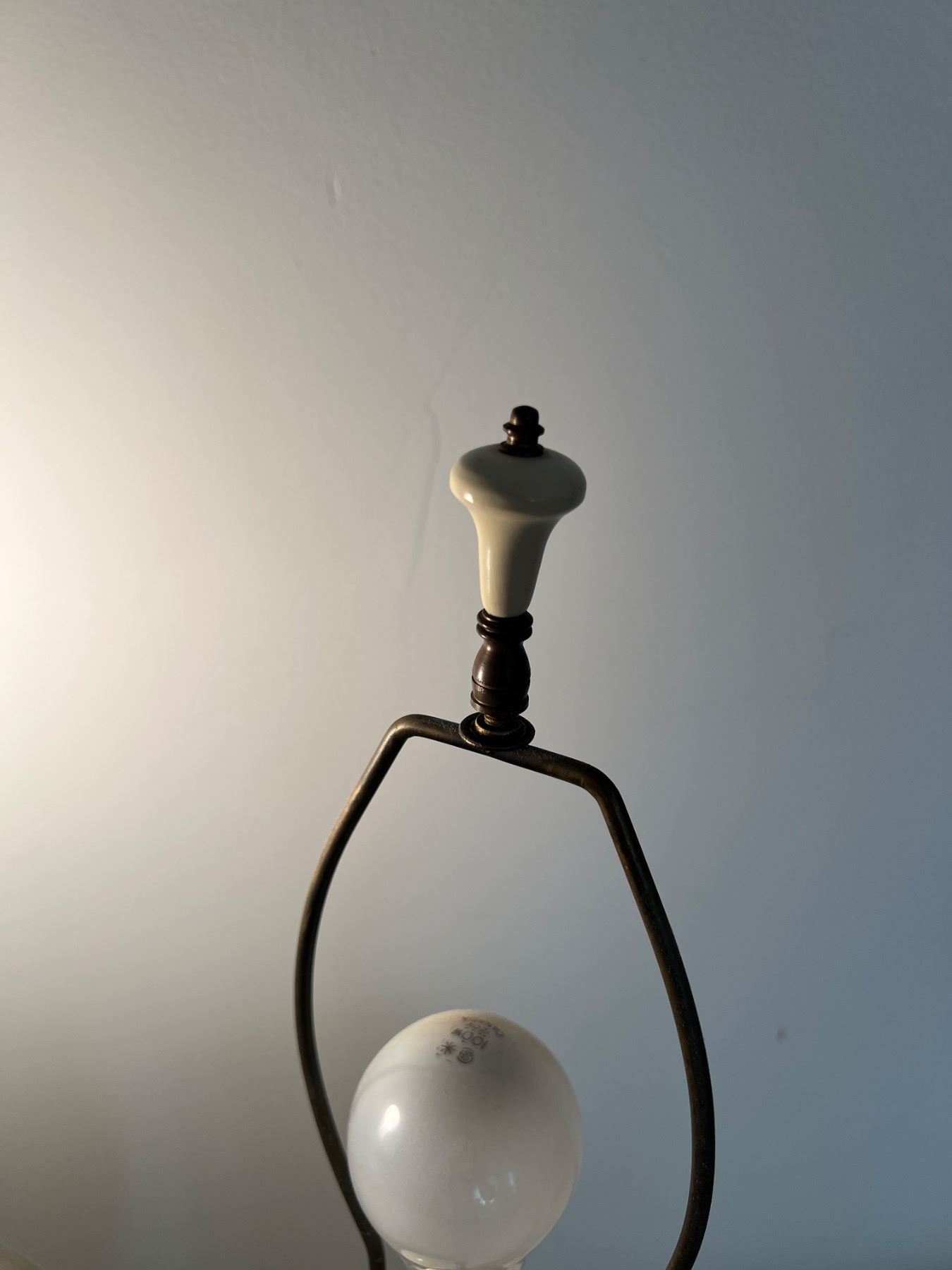 Urn style of lamp has 3 brightness levels that all work. Some tarnishing to base of white lamp. Urn measures 27" in height and approximately 10" in diameter at its widest point.