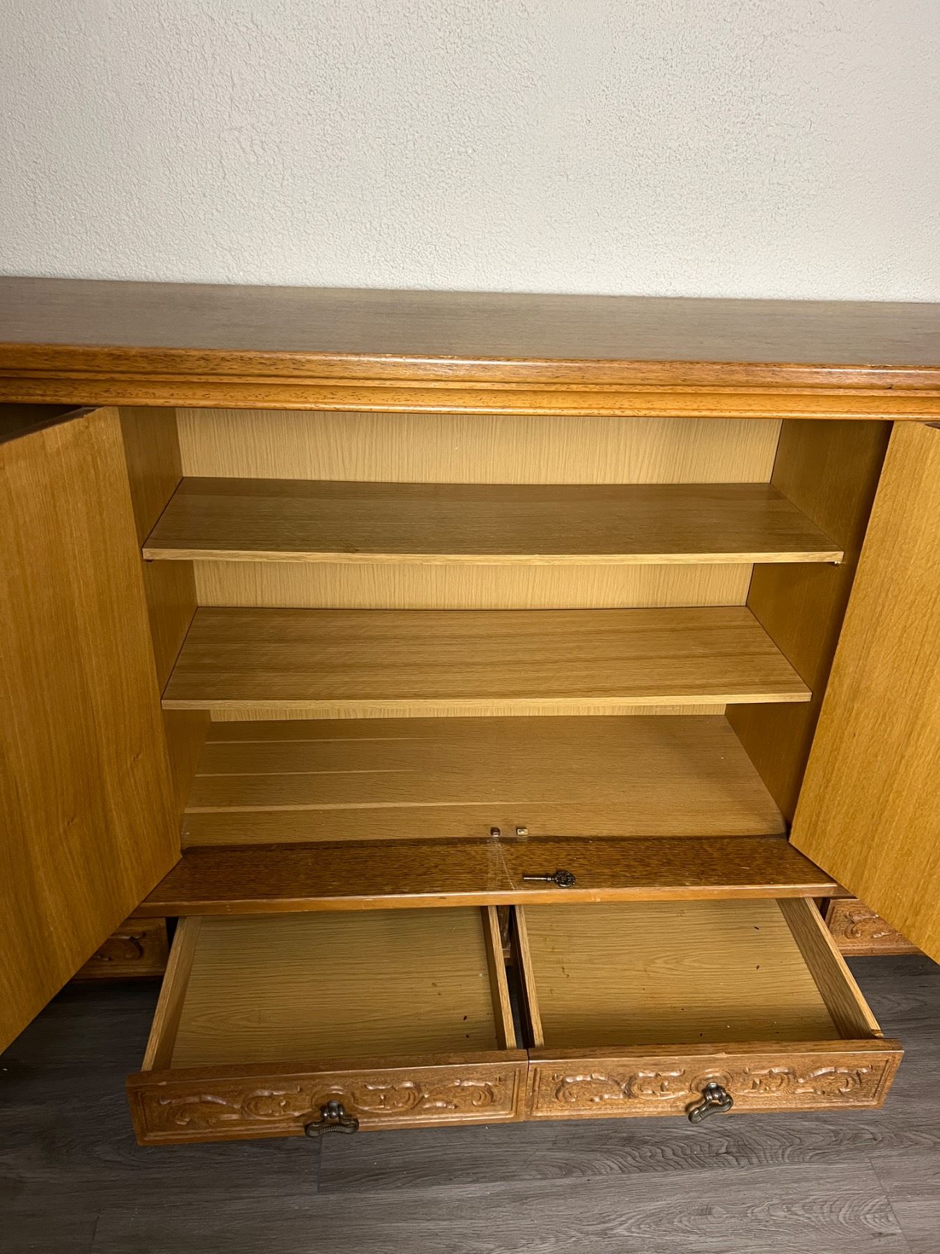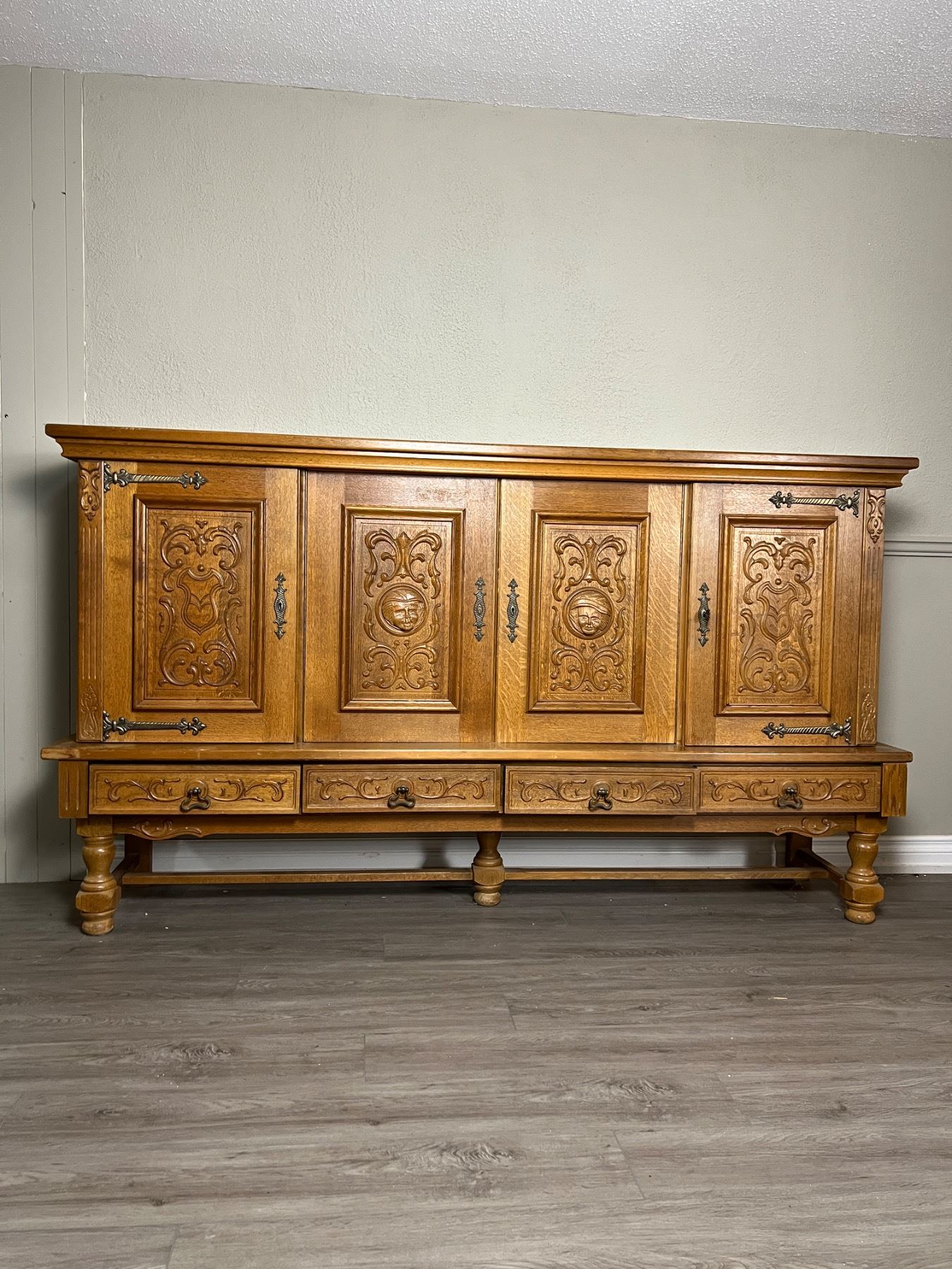 Measures 86" by 21" by 49" tall total. Top piece is 32". Scuffs and damage to front and top. Please bring help to move located in basement.