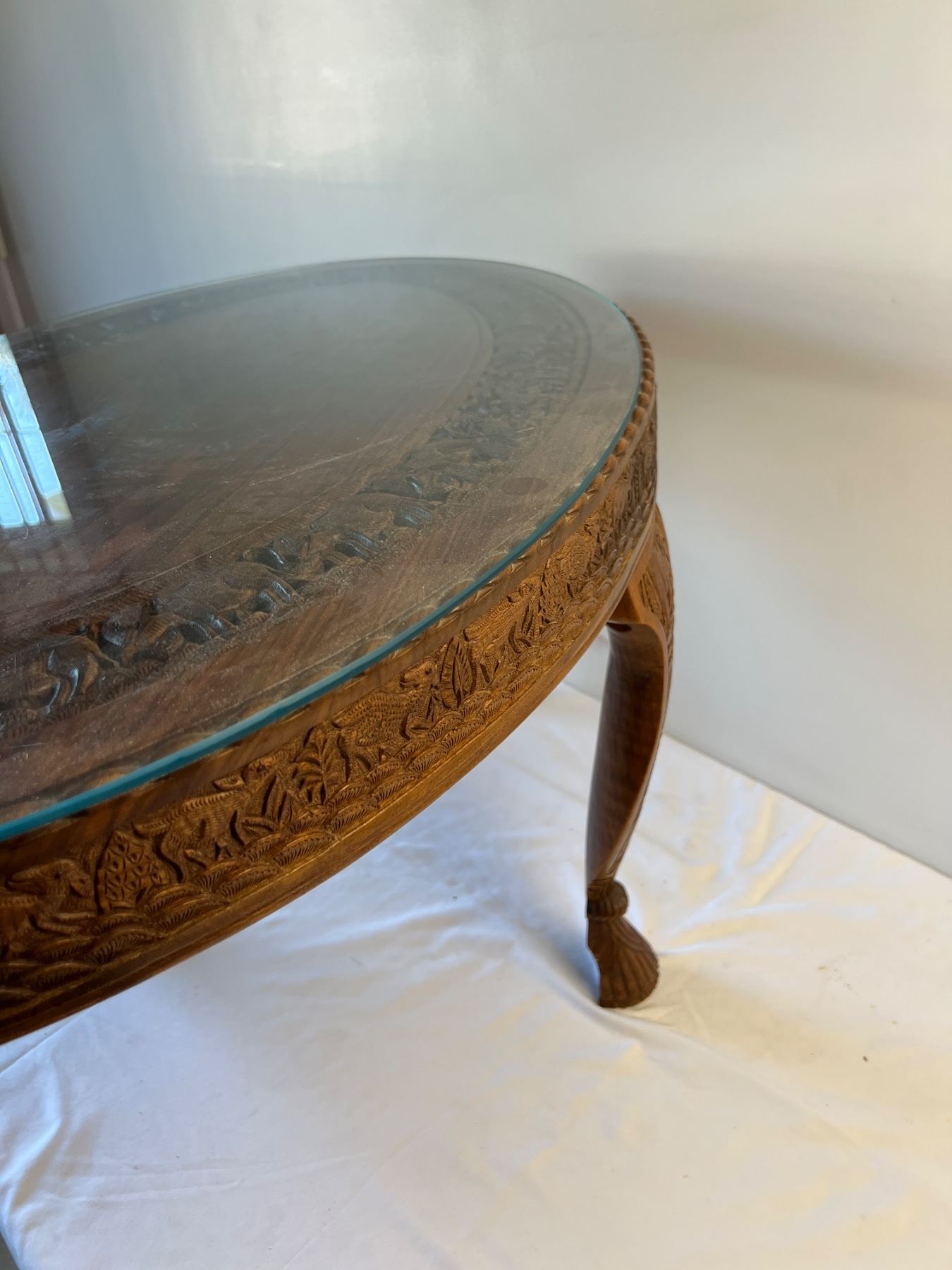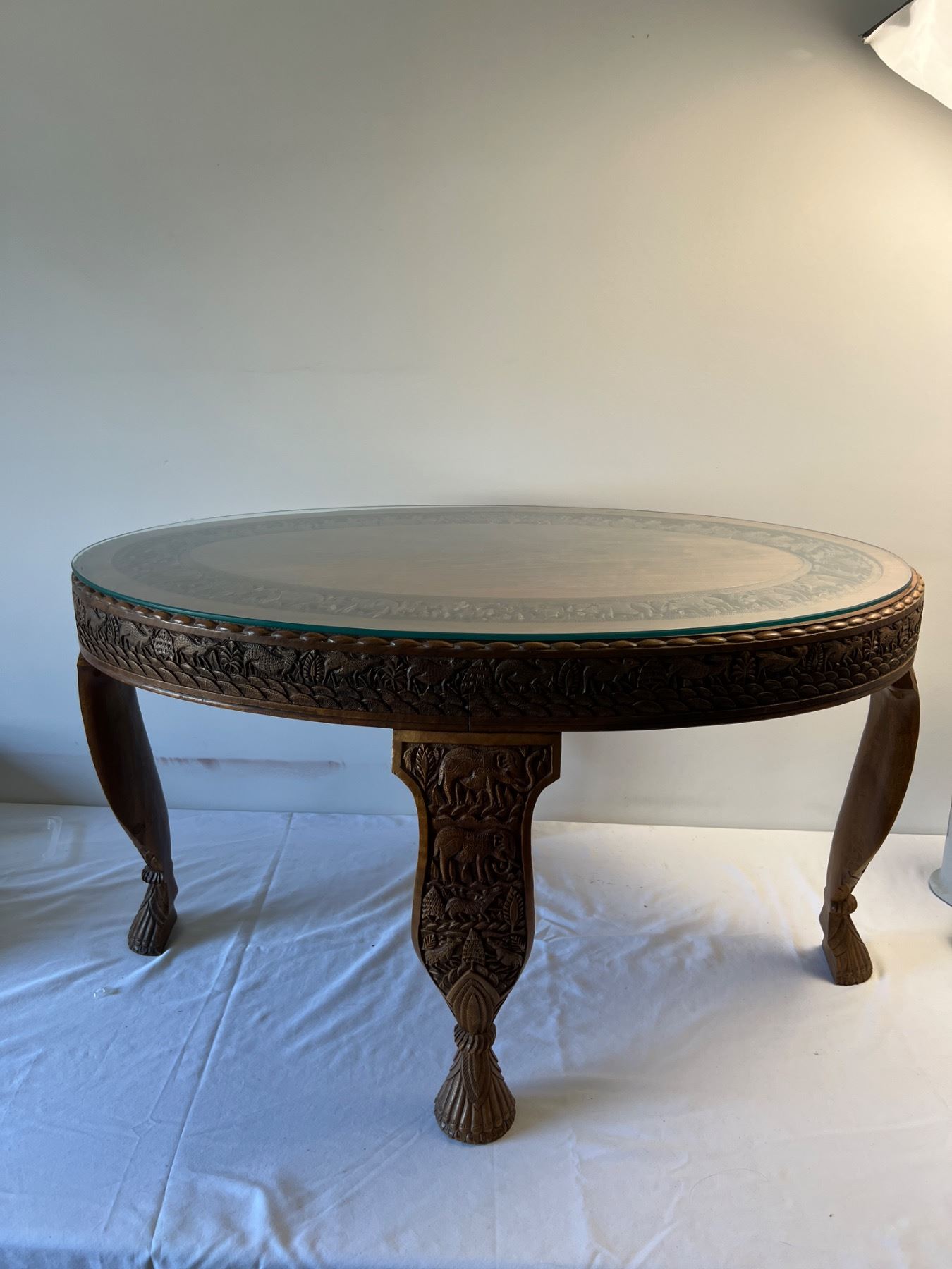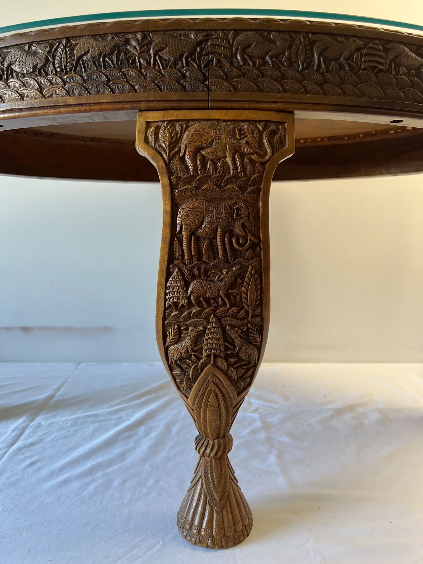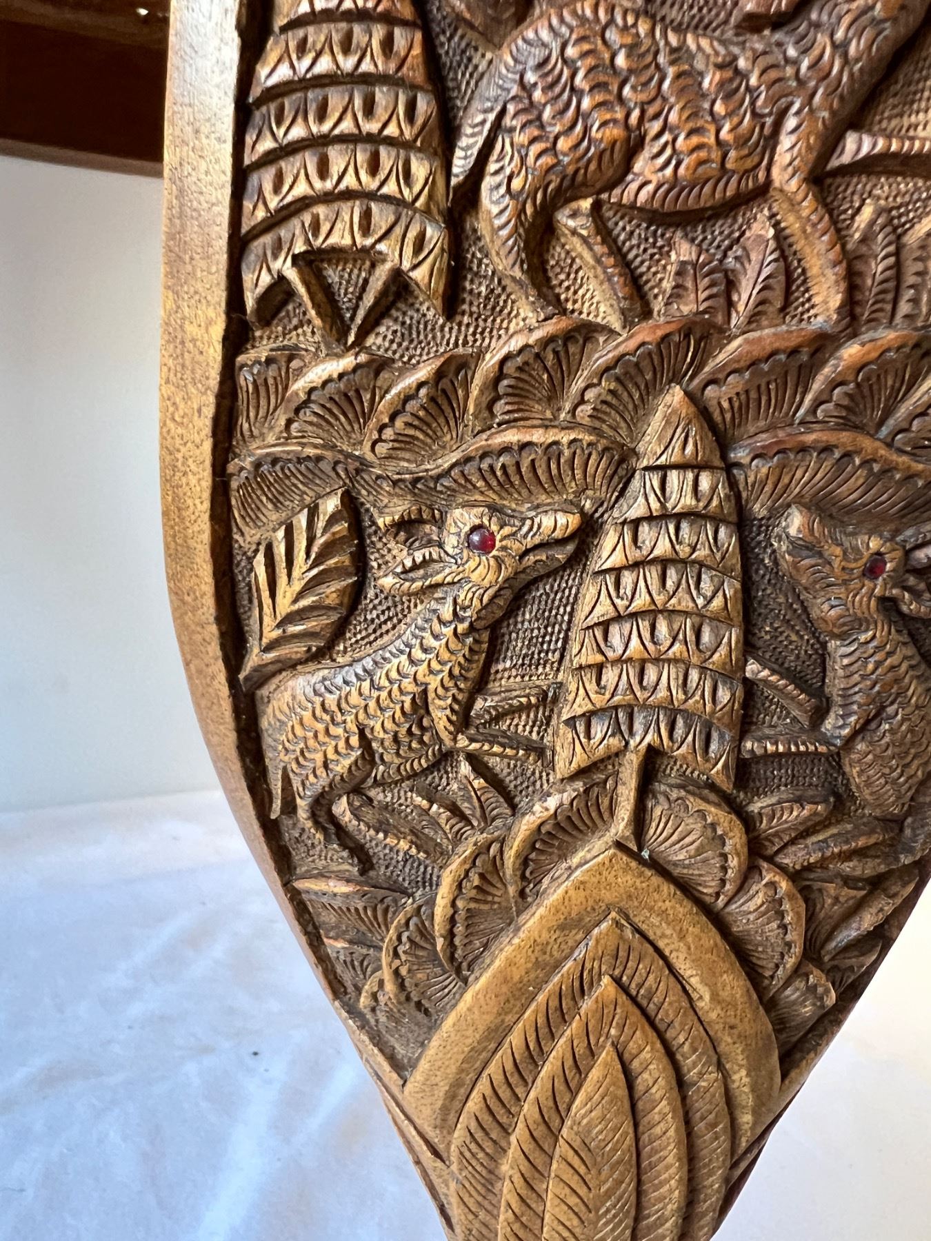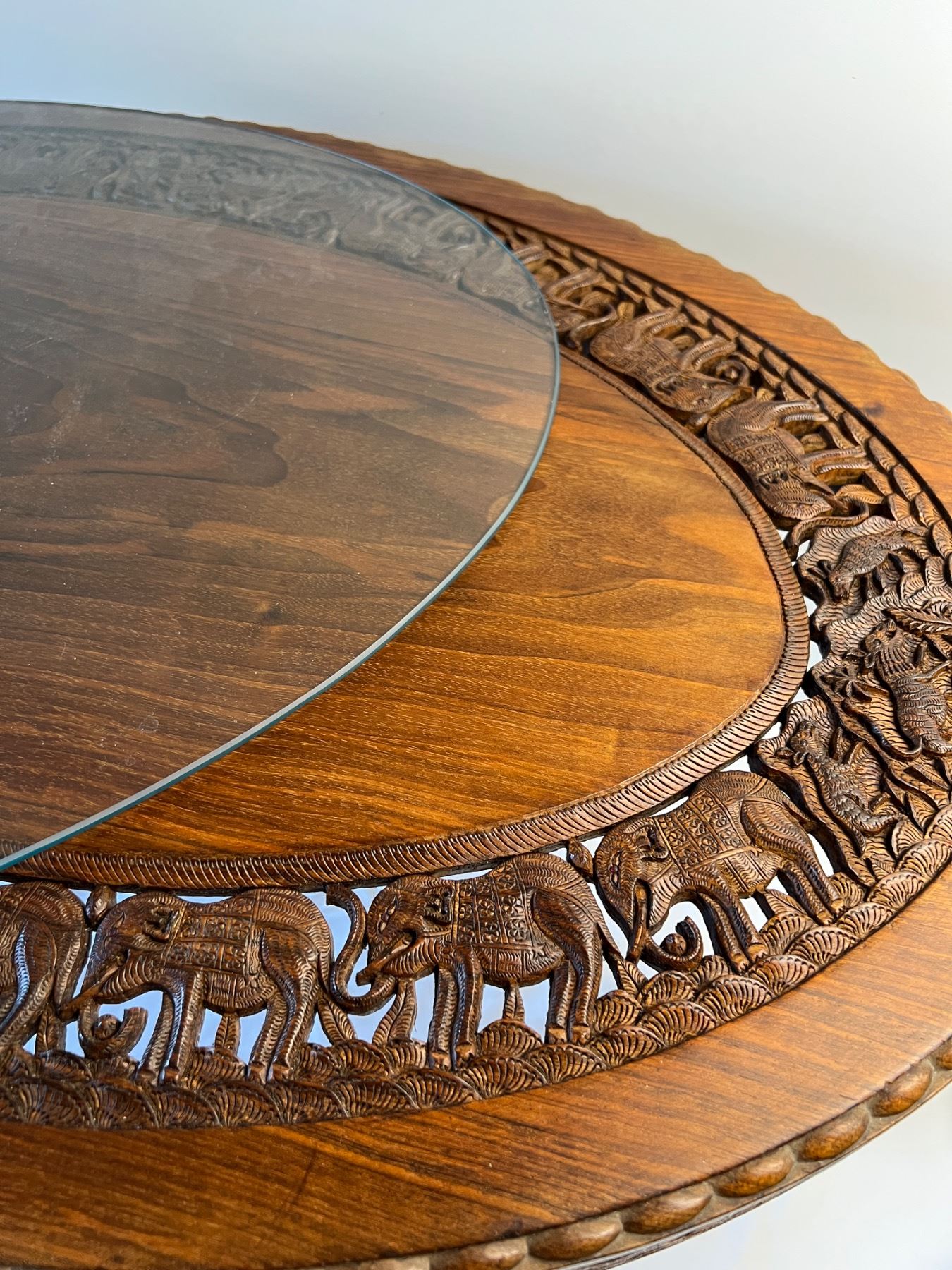 Features beautifully carved elephant and animal motifs. Red gems of eyes for some animals have faded. Measures 34" by 22" and 19.5" tall.