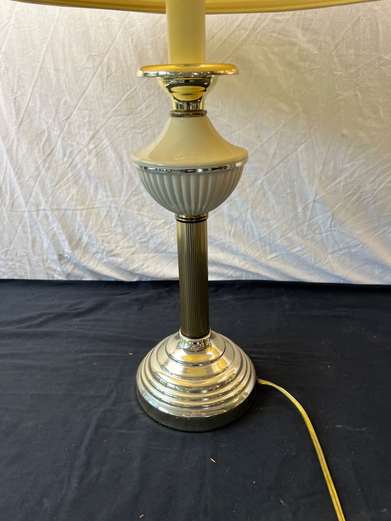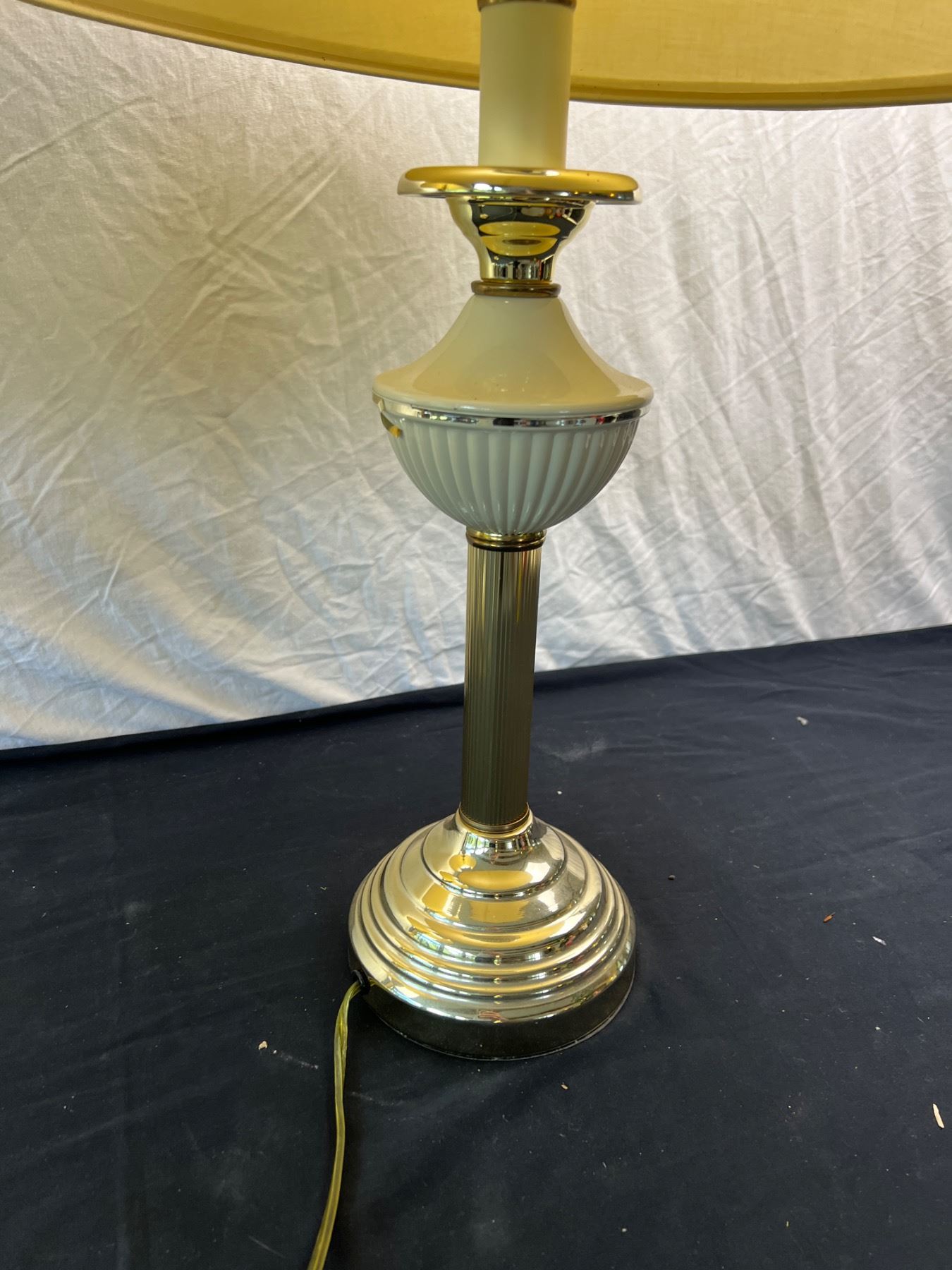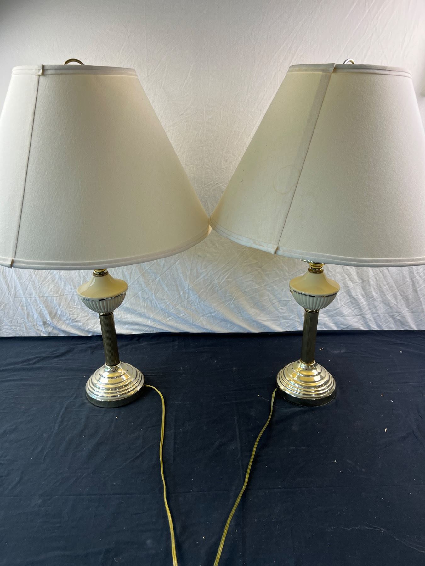One of the lamp shades is cracked along the top and has a stain spot, both are in working condition, Each one is 28"H