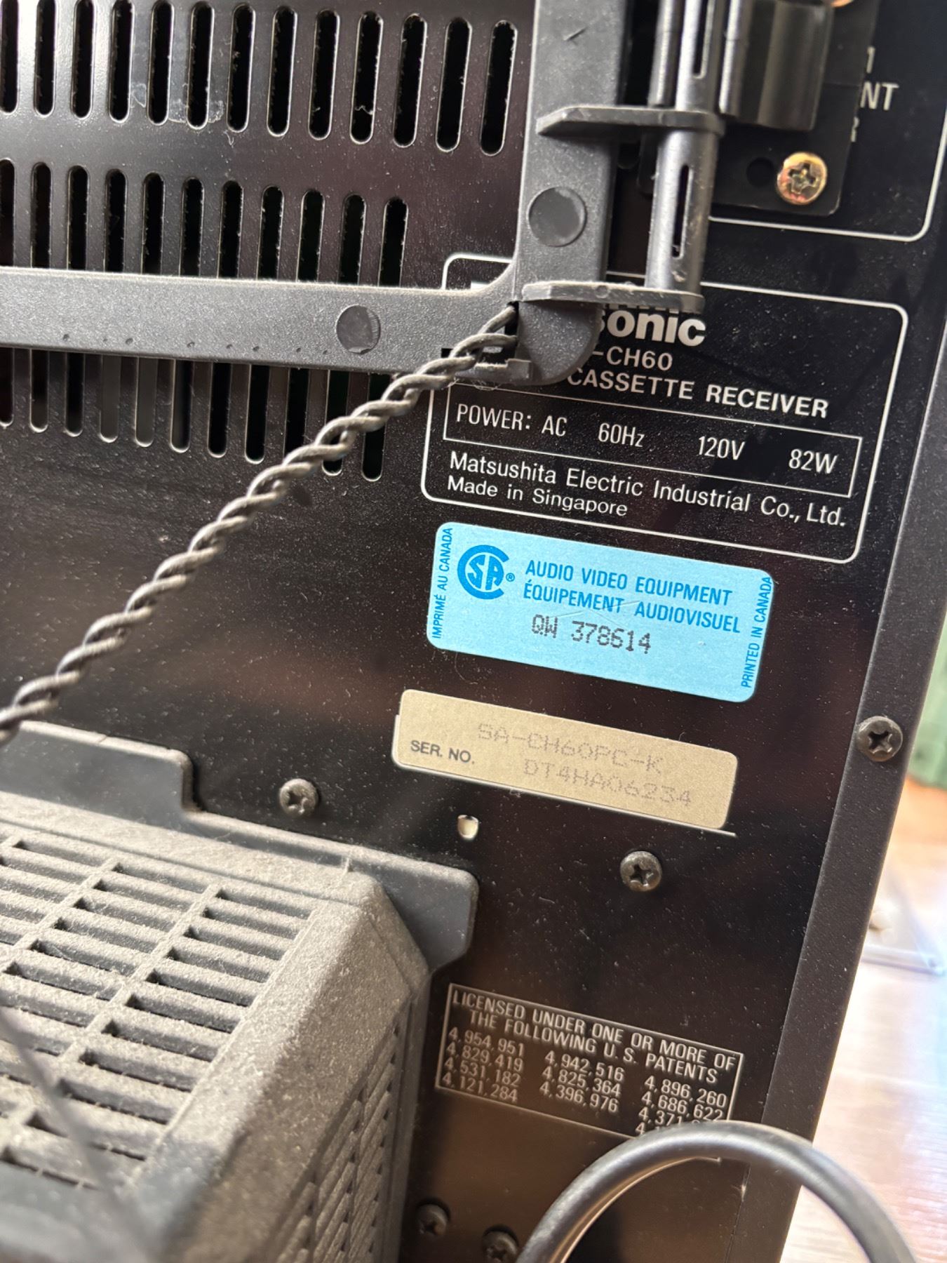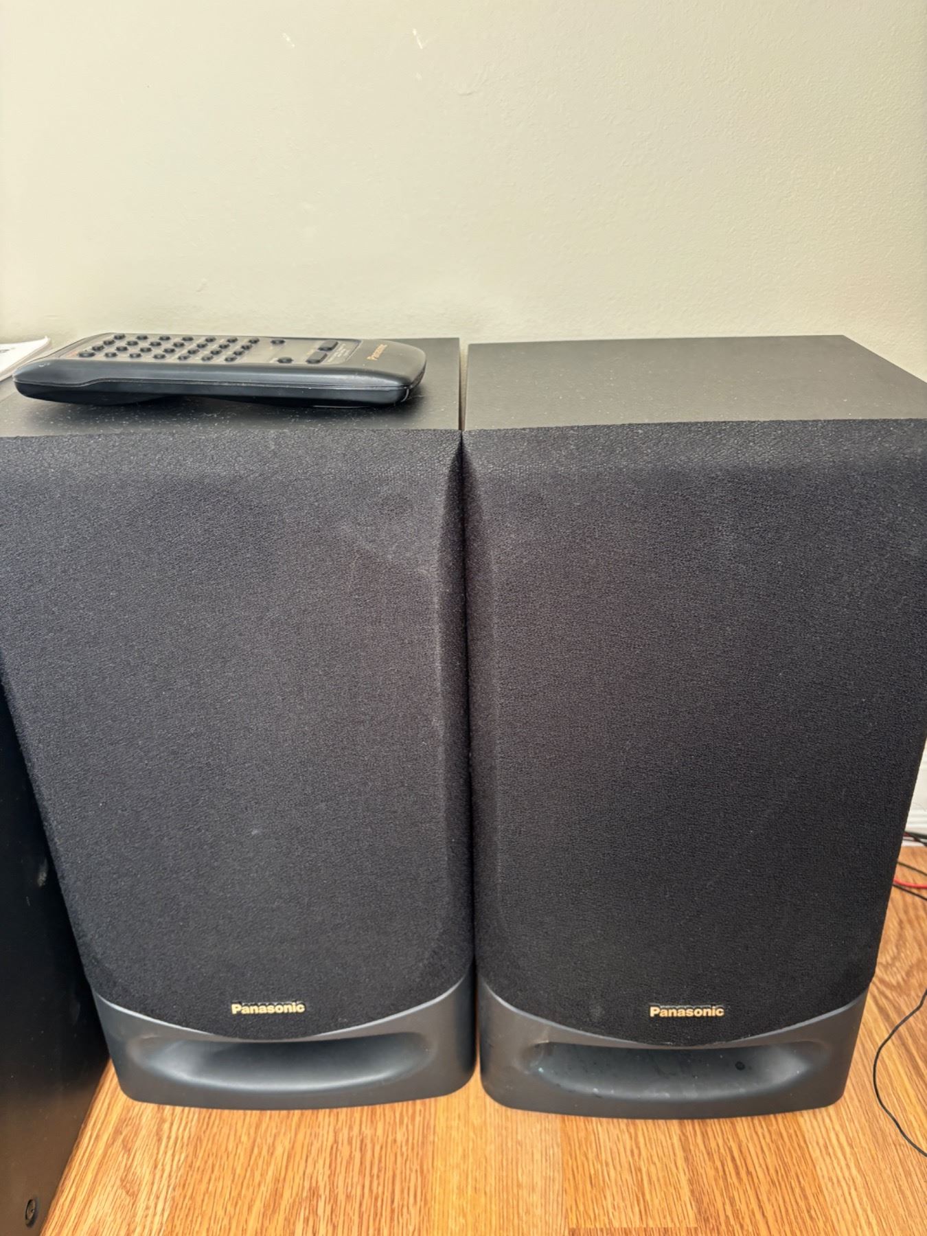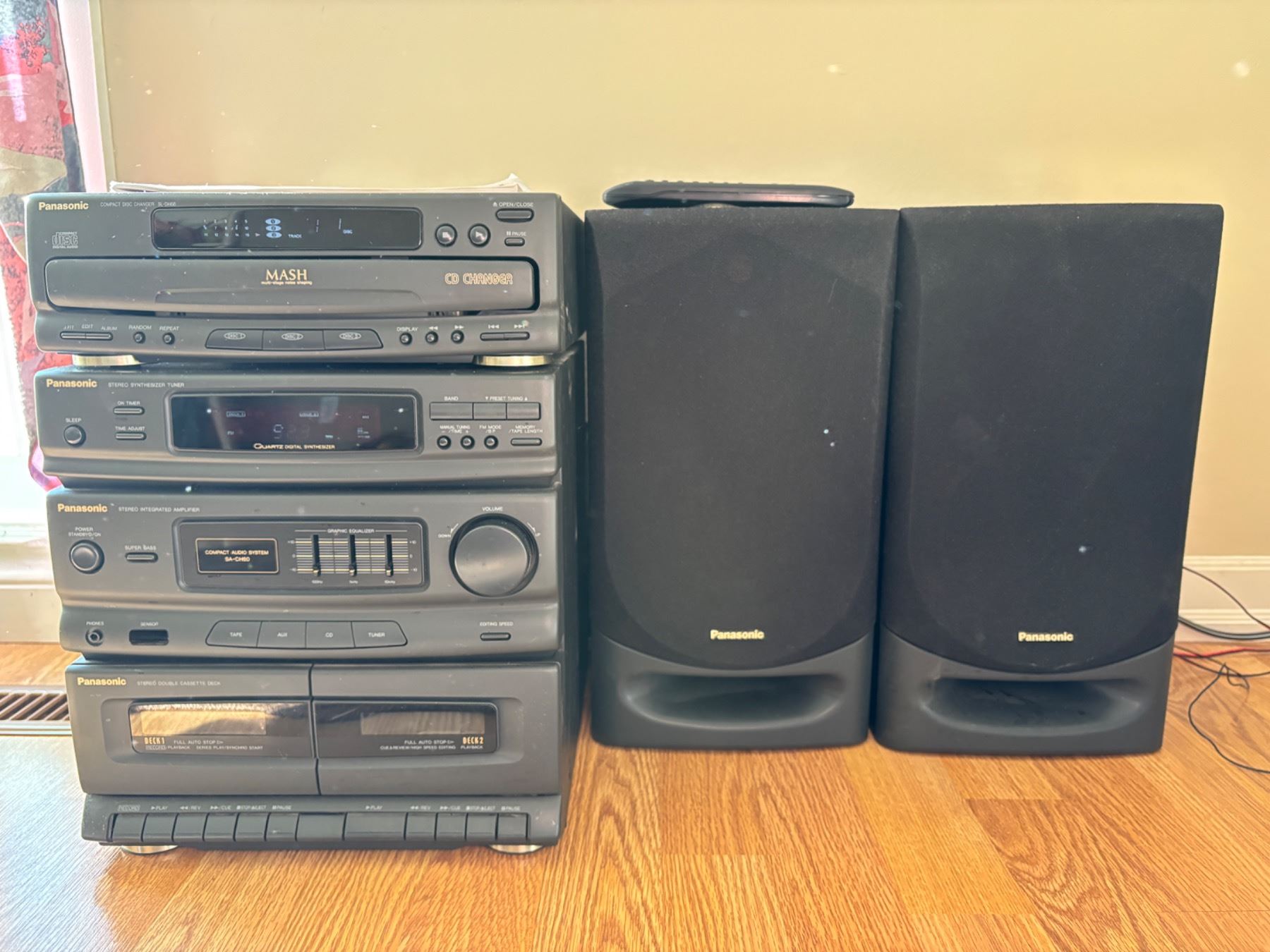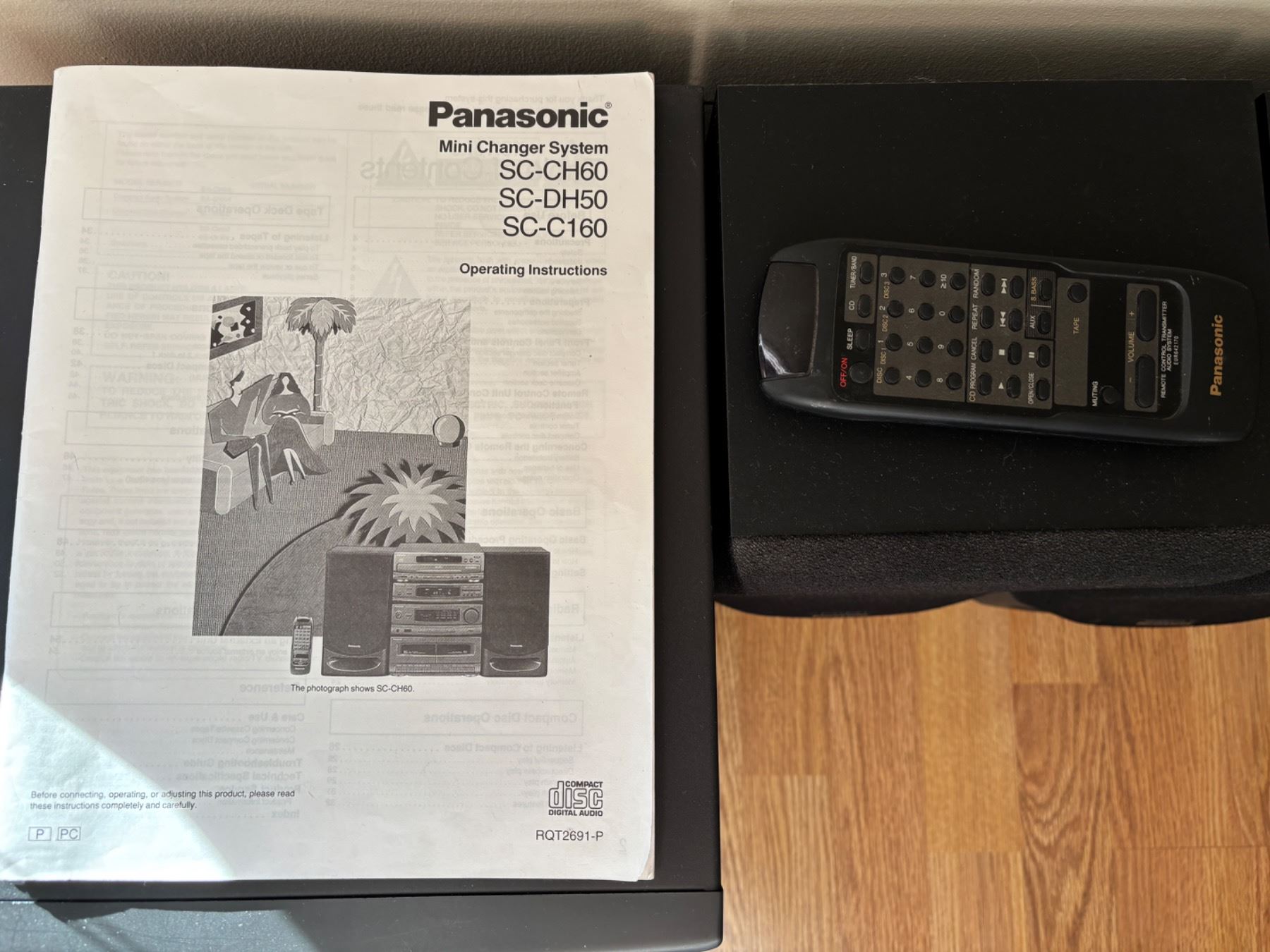 Includes, Panasonic Mini Changer System SC-CH60, Panasonic Compact Disc Changer SL-DH66, both turn on, and Panasonic SB-CH60 2Way Speaker System. With remote