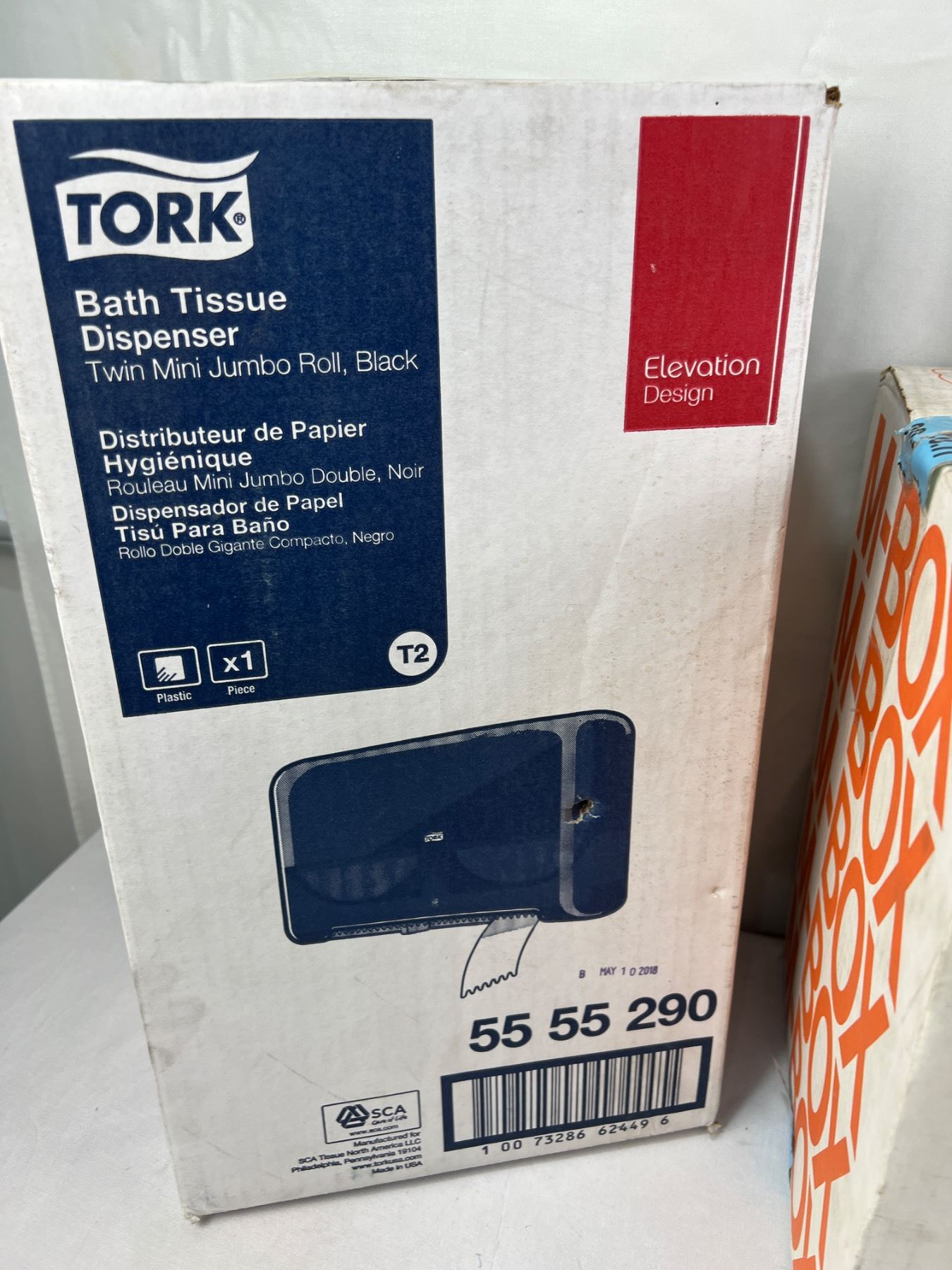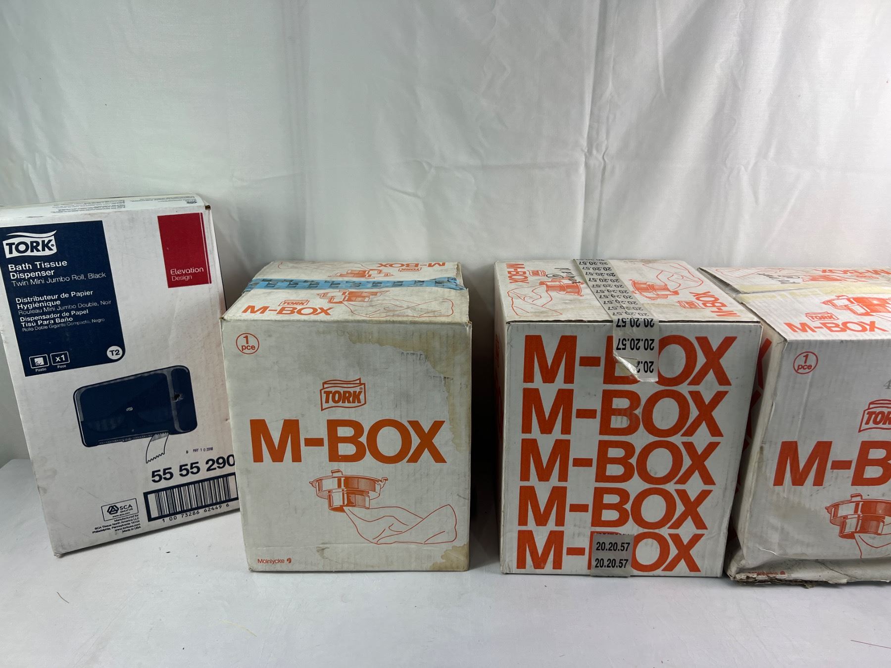 New Tork Bath Tissue Dispenser Twin Mini Jumbo Roll & 3 New Tork M-Box Paper Towel Dispensers