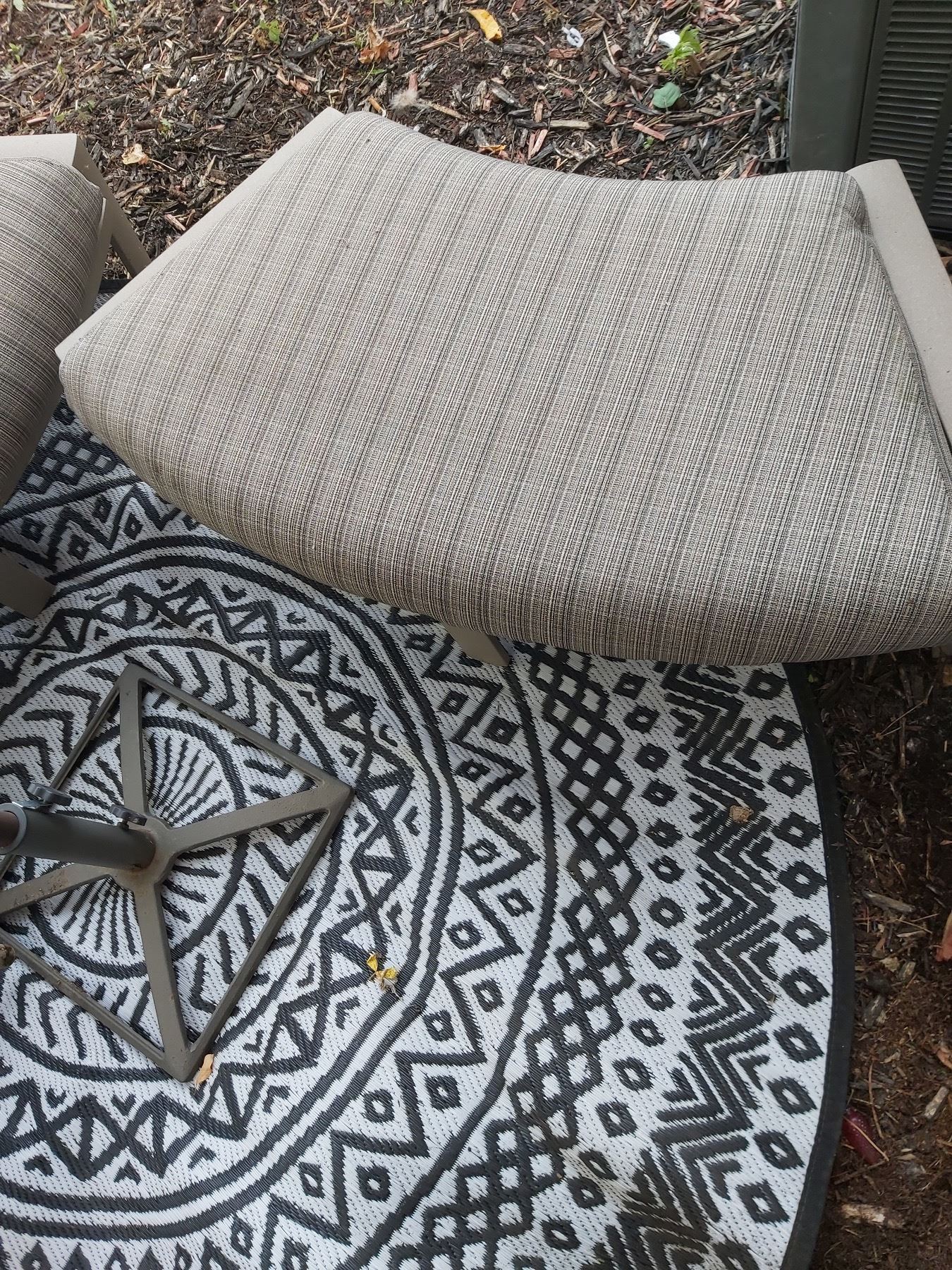 Includes Umbrella, outdoor rug, lounger and two bench seats (cushions included)