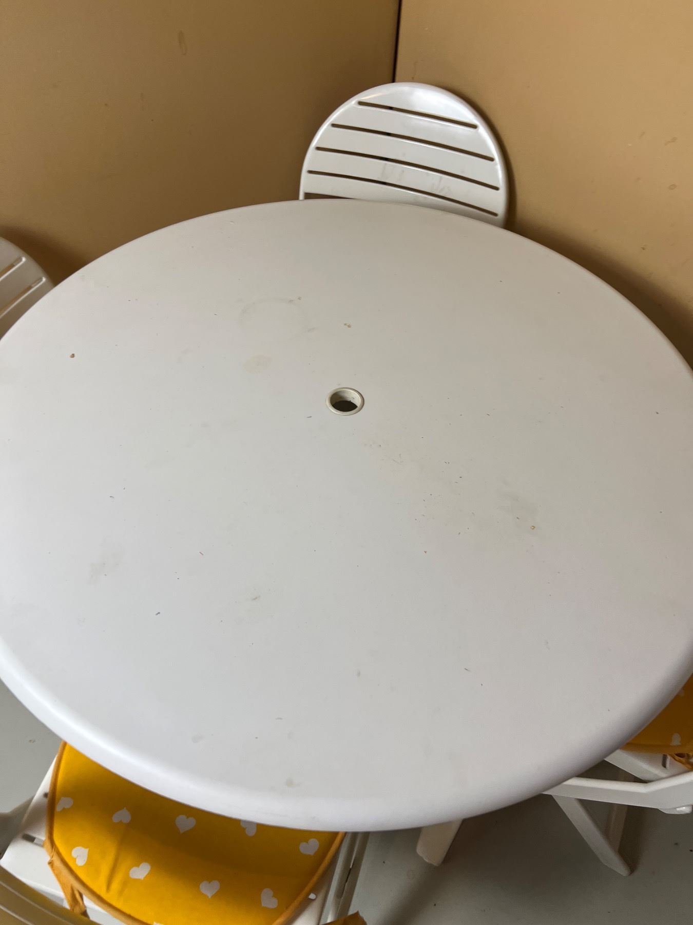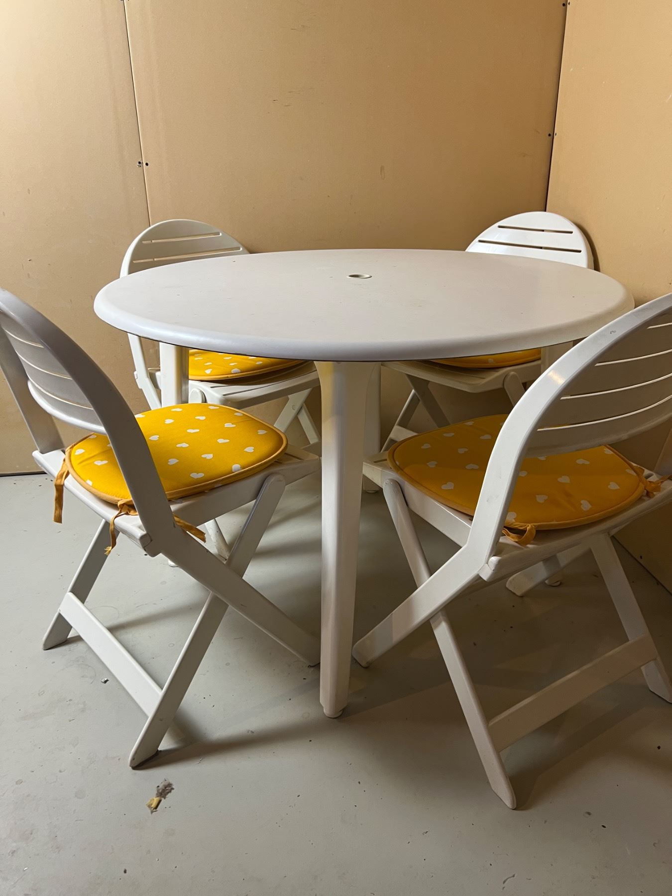 Each of the folding chairs comes with a seat cushion, The table is 42"diameter x 29"H