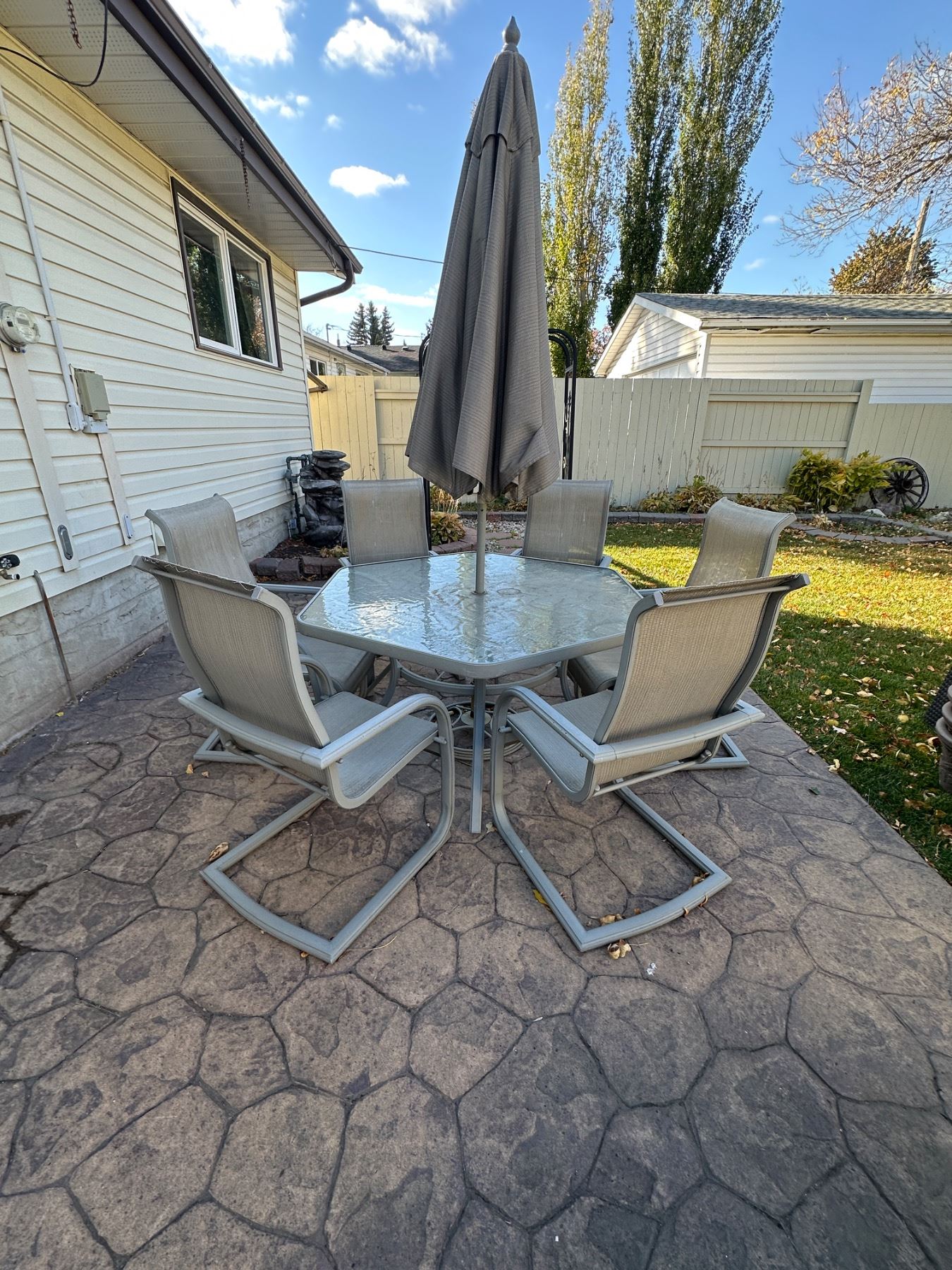 Includes table, 6 chairs and umbrella