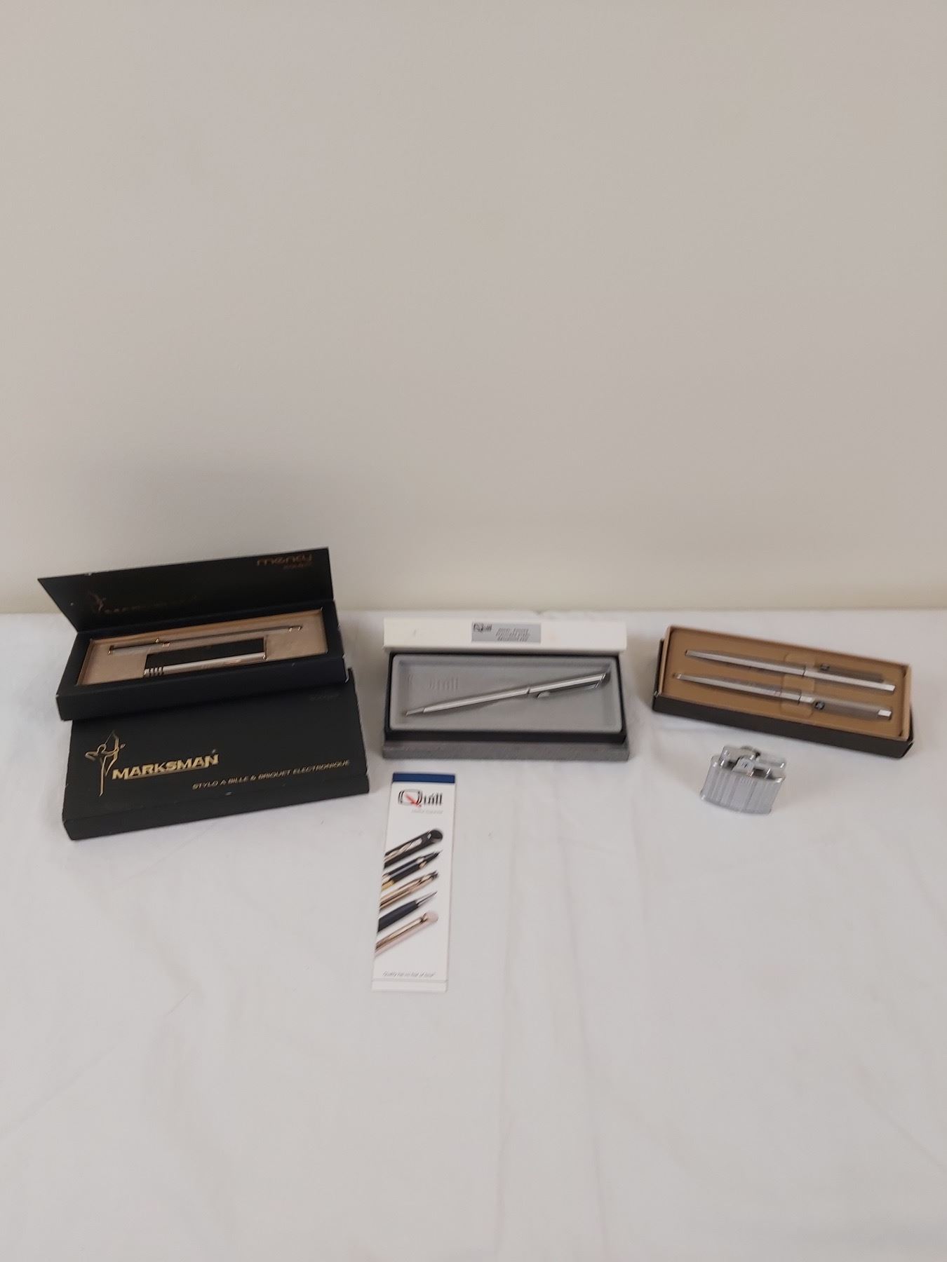 Includes, Marksman pen and lighter set, Quill ballpoint pen Model No. 300PS, Ronson lighter, Parker pen and pencil set