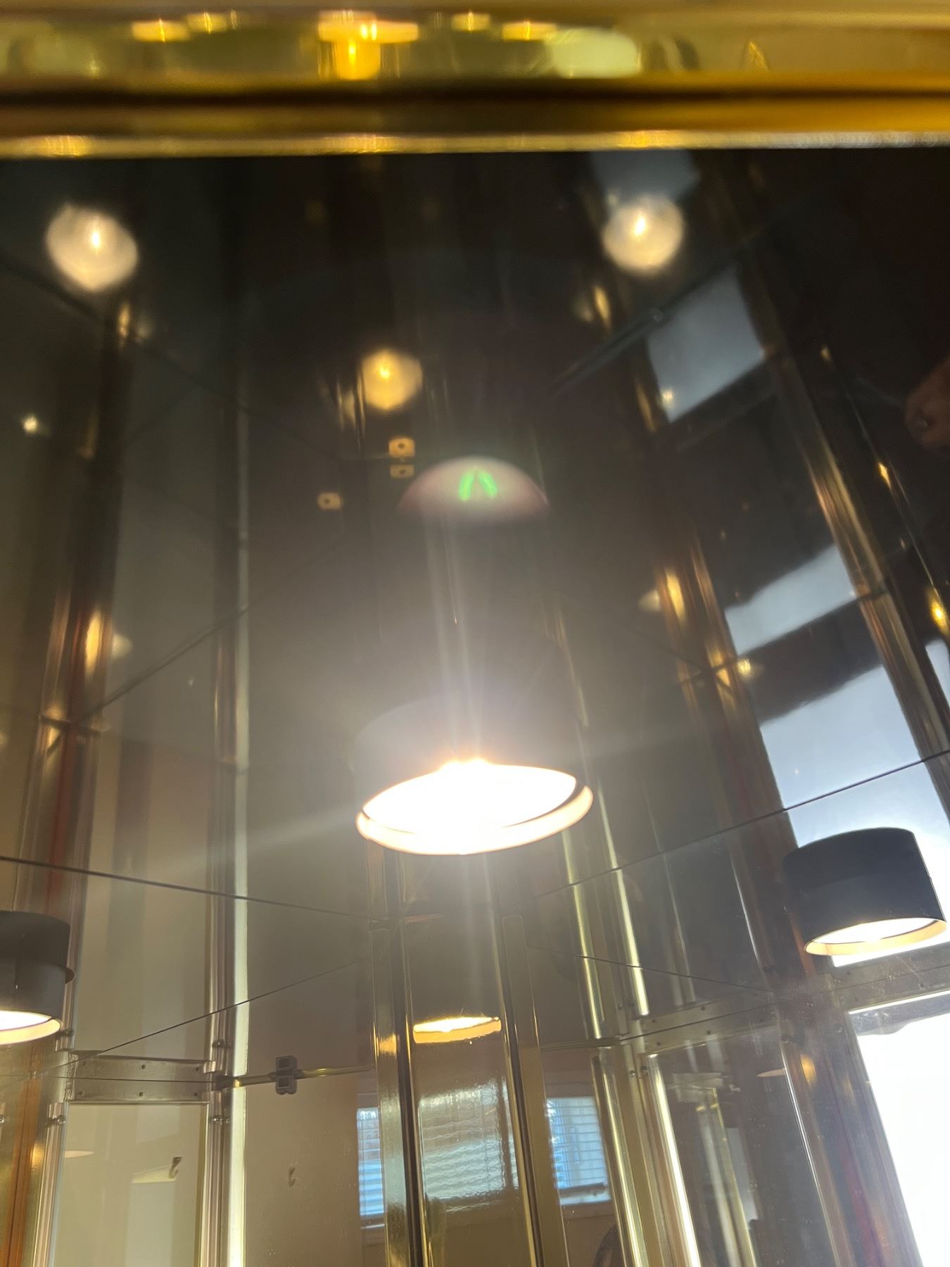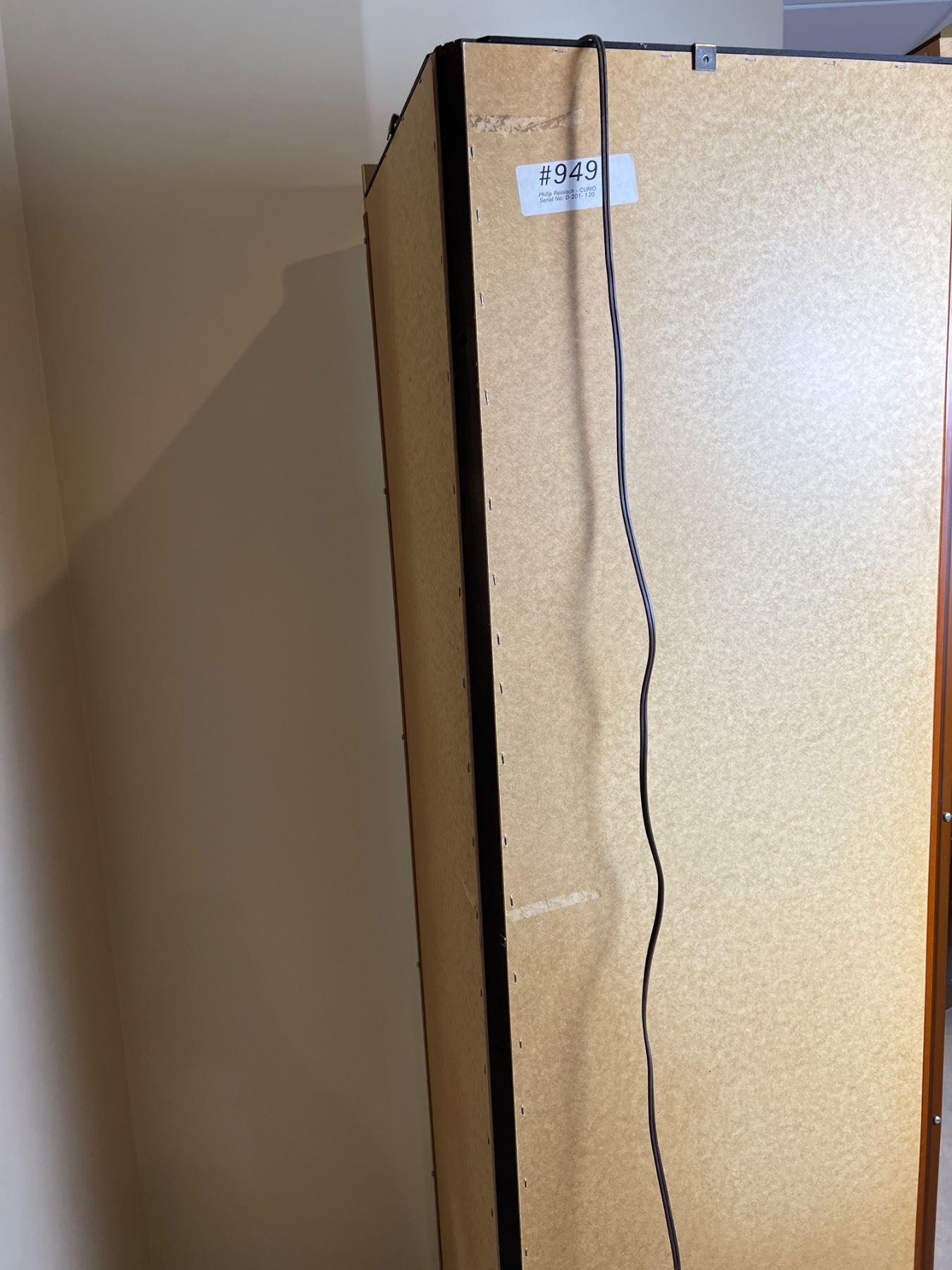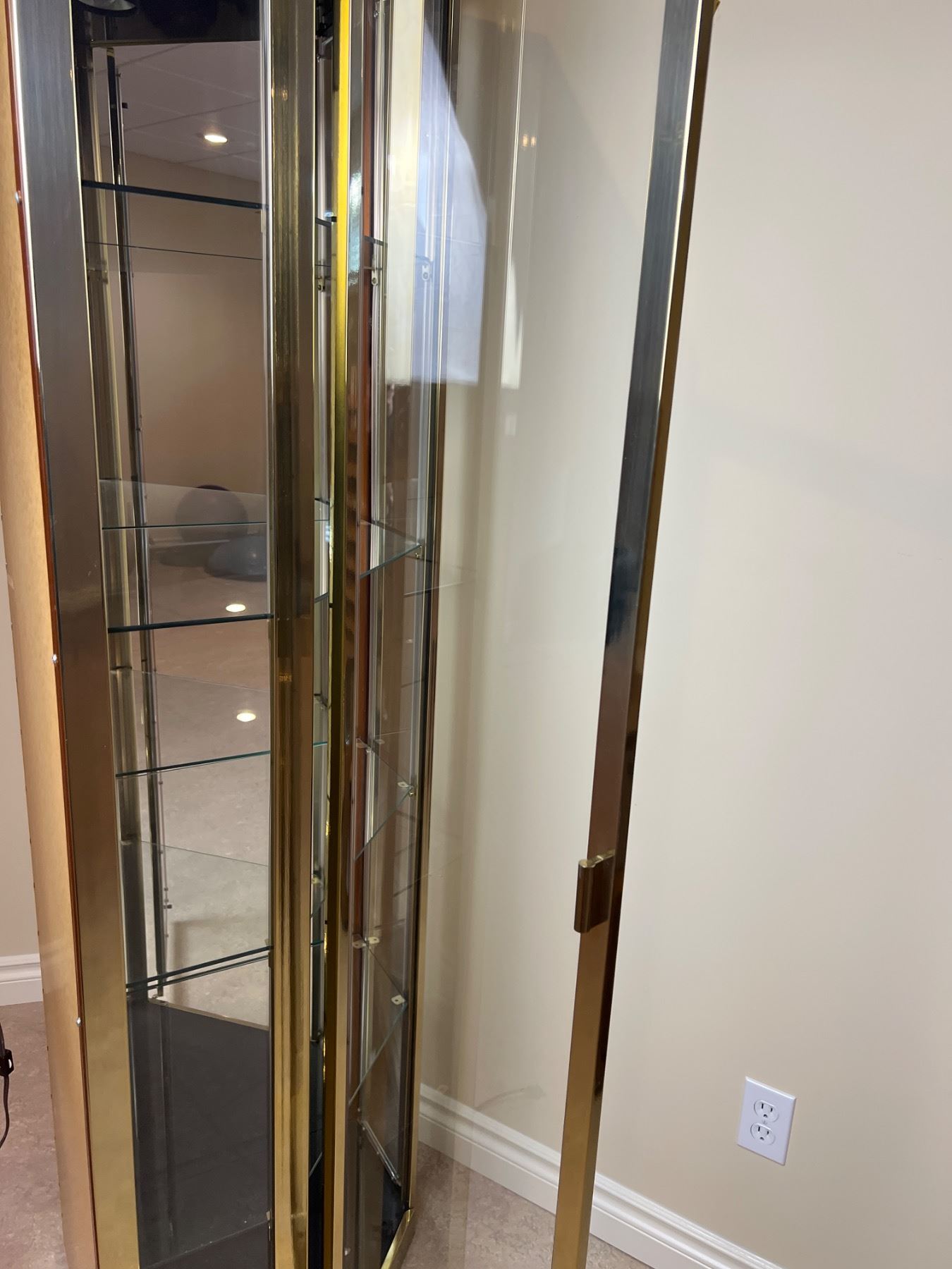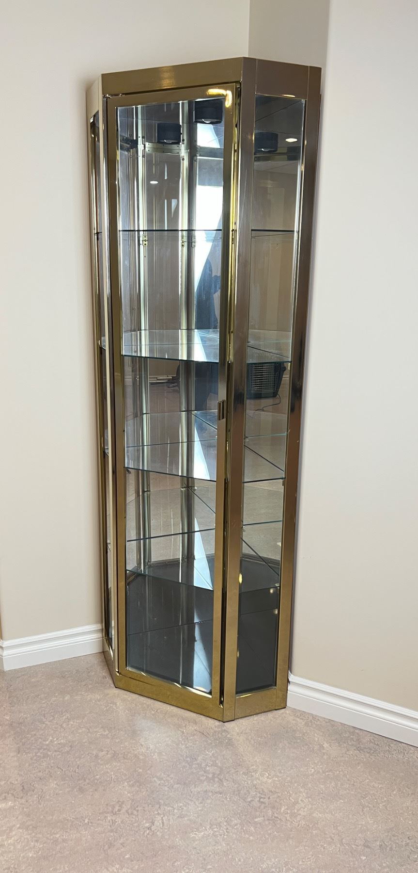 Interior lighting works, Has four glass shelfs, Measures 27"L x 19.5"D x 72"H