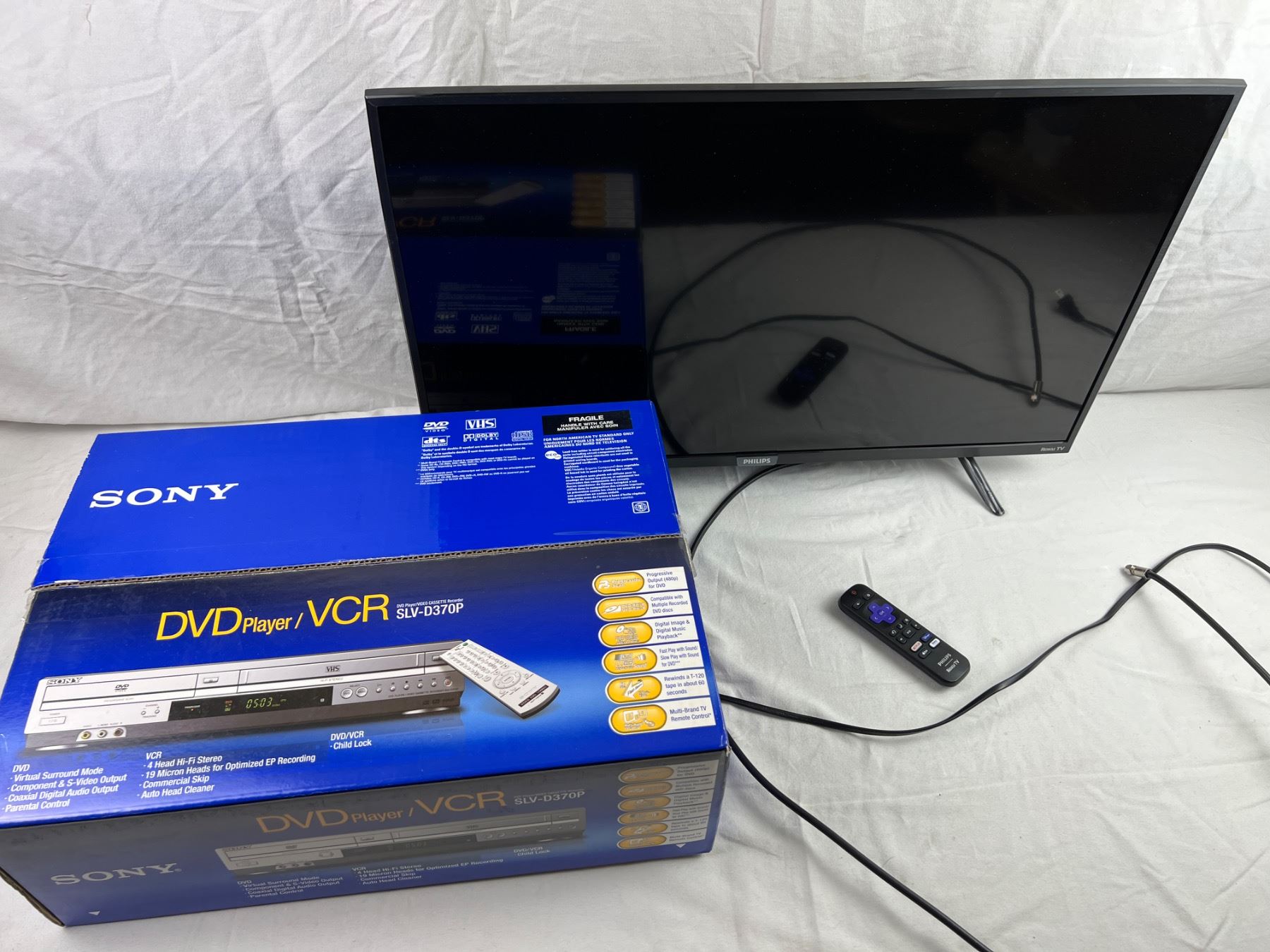 Includes, Phillips tv with remote (works) Model No. 32PFL4756/F6, Sony DVD VCR Player Model No. SLV-D370P (new in open box, not tested)
