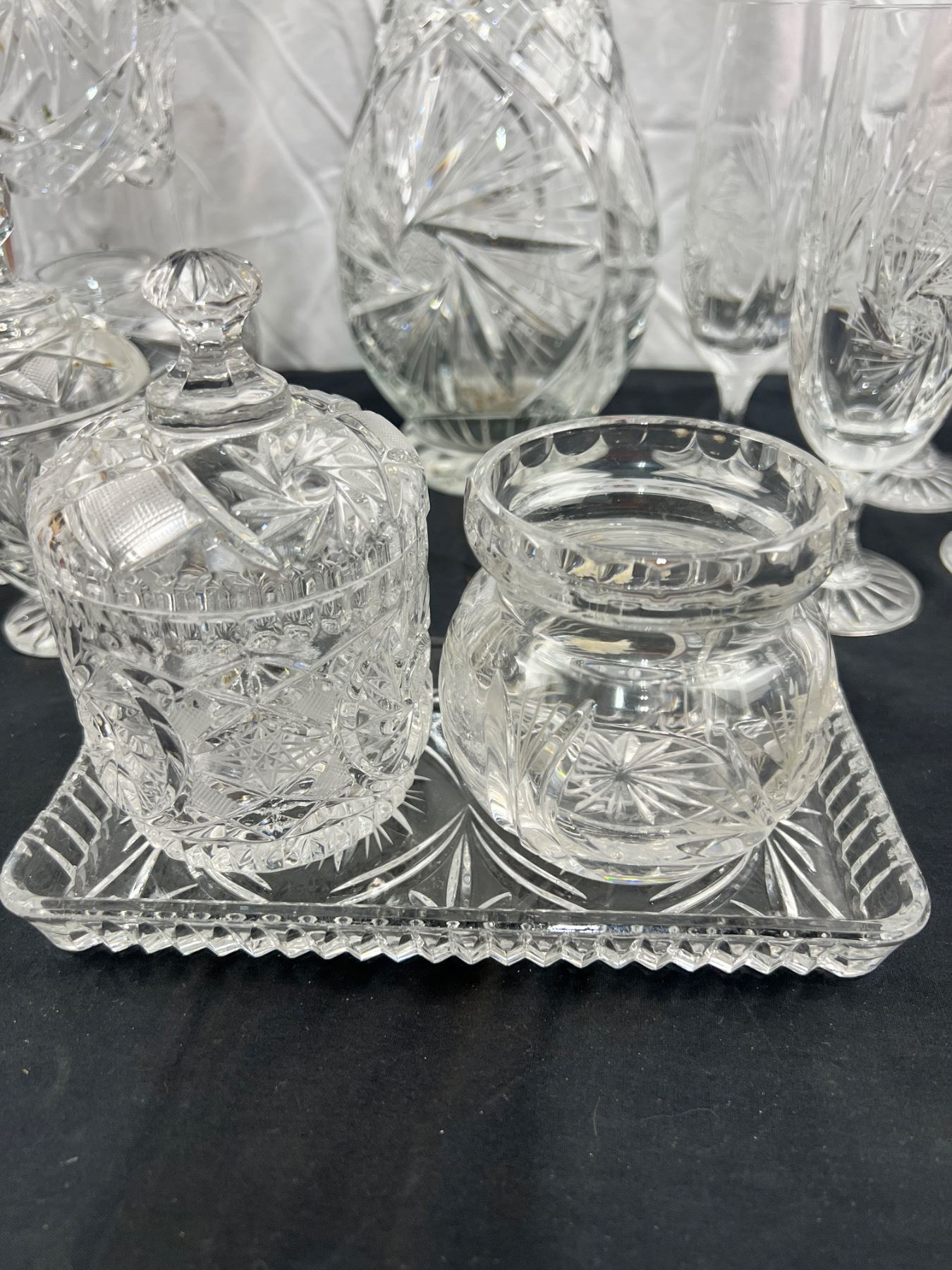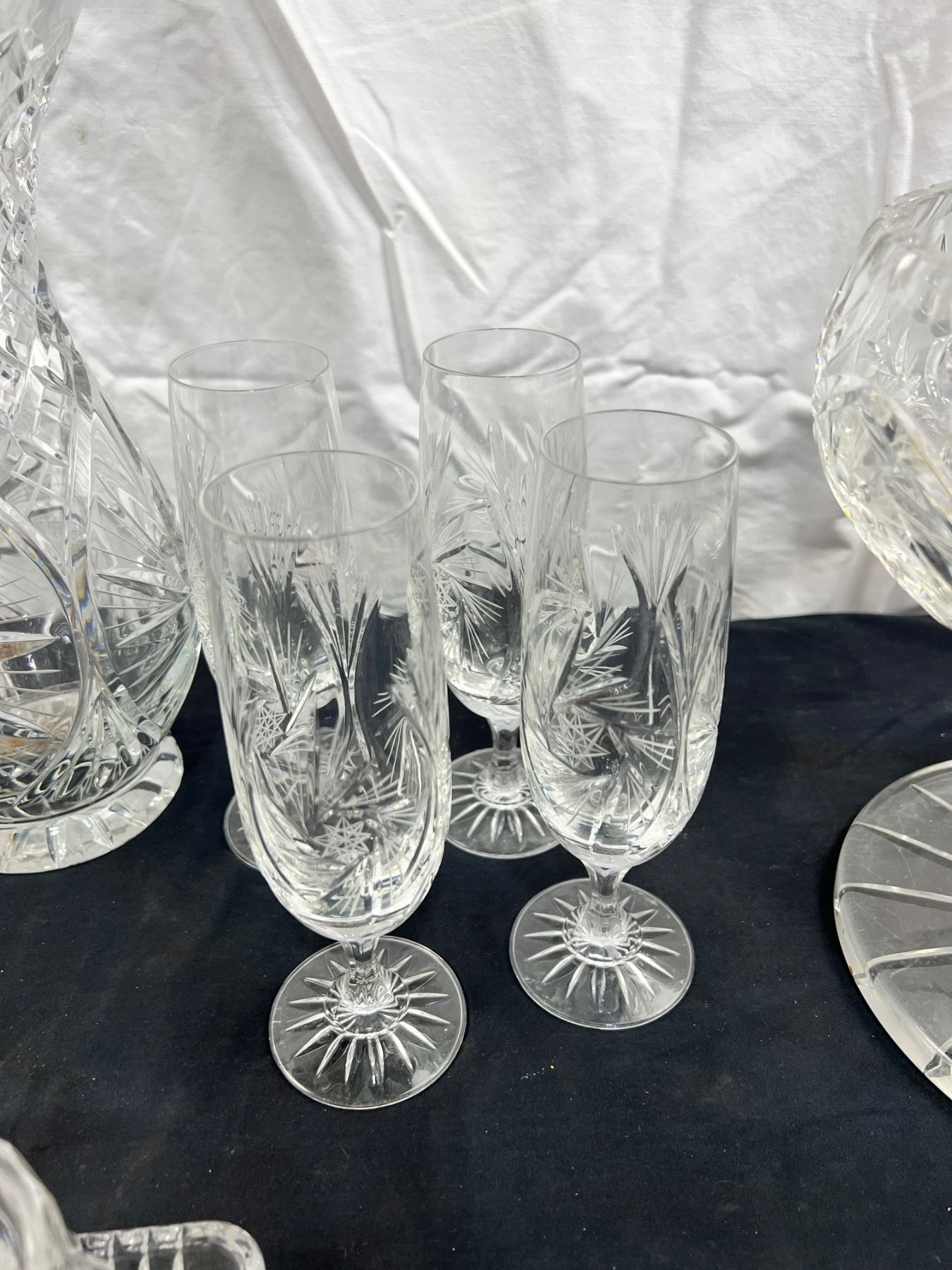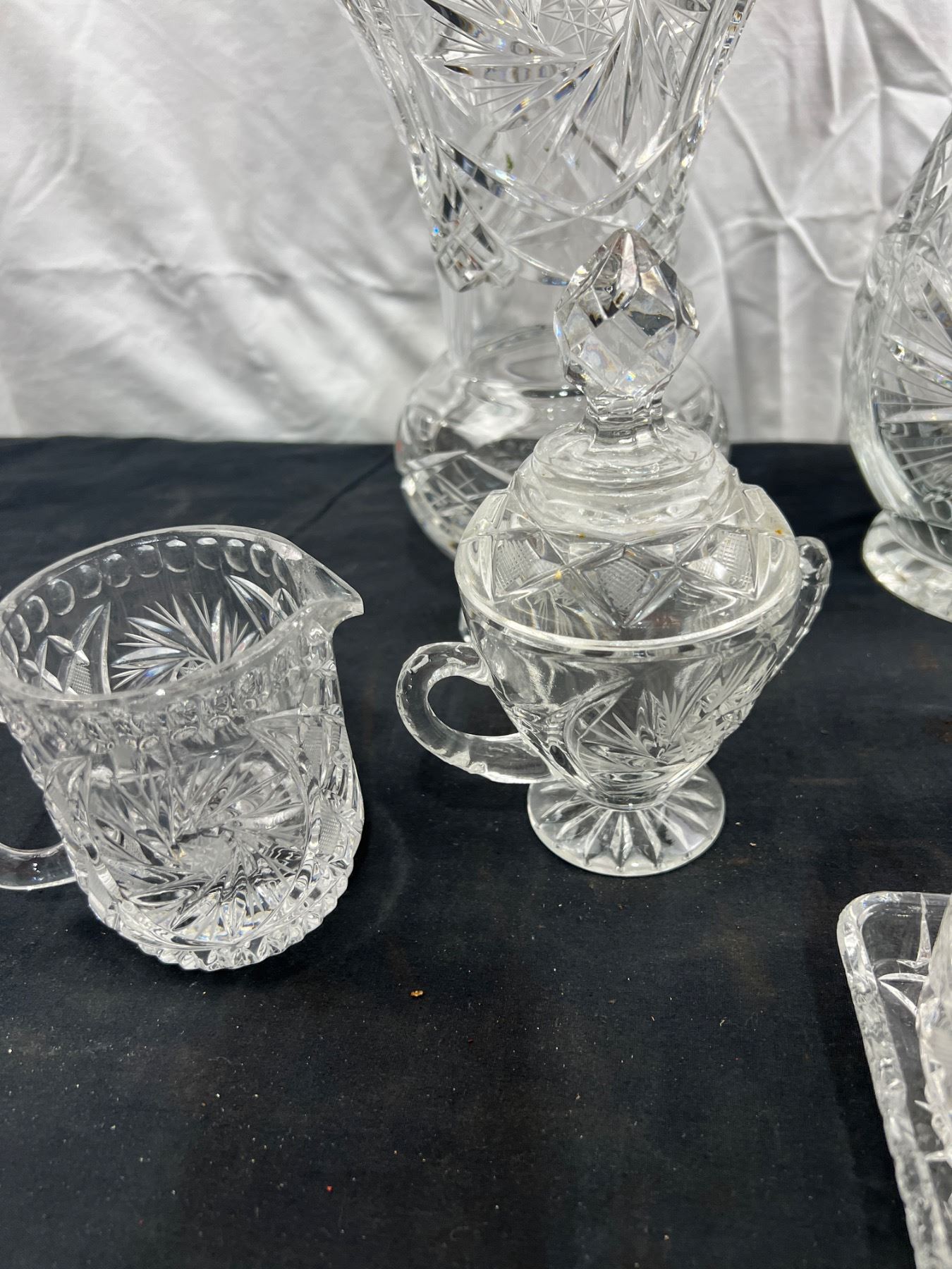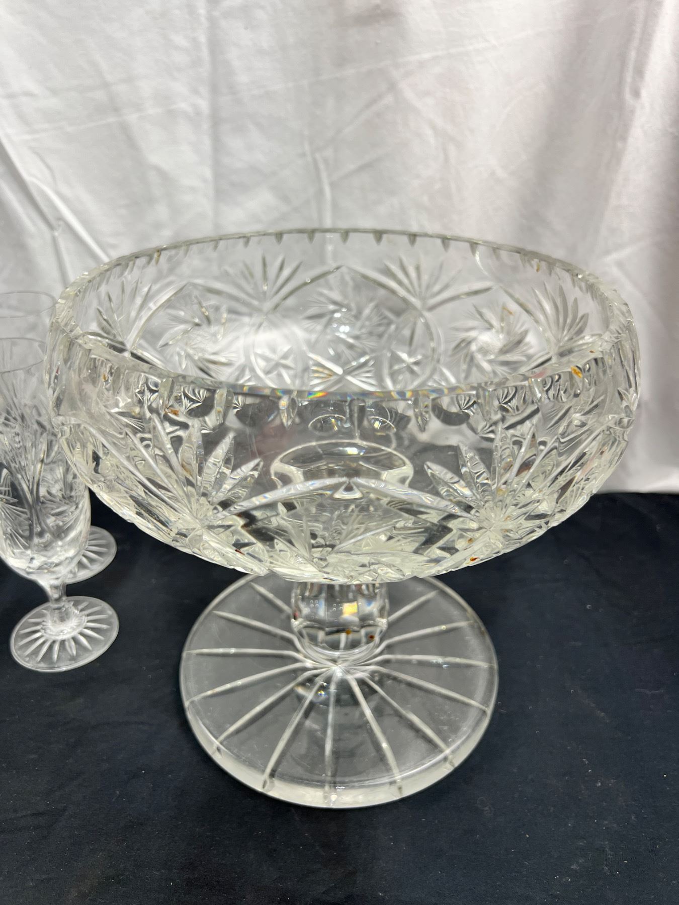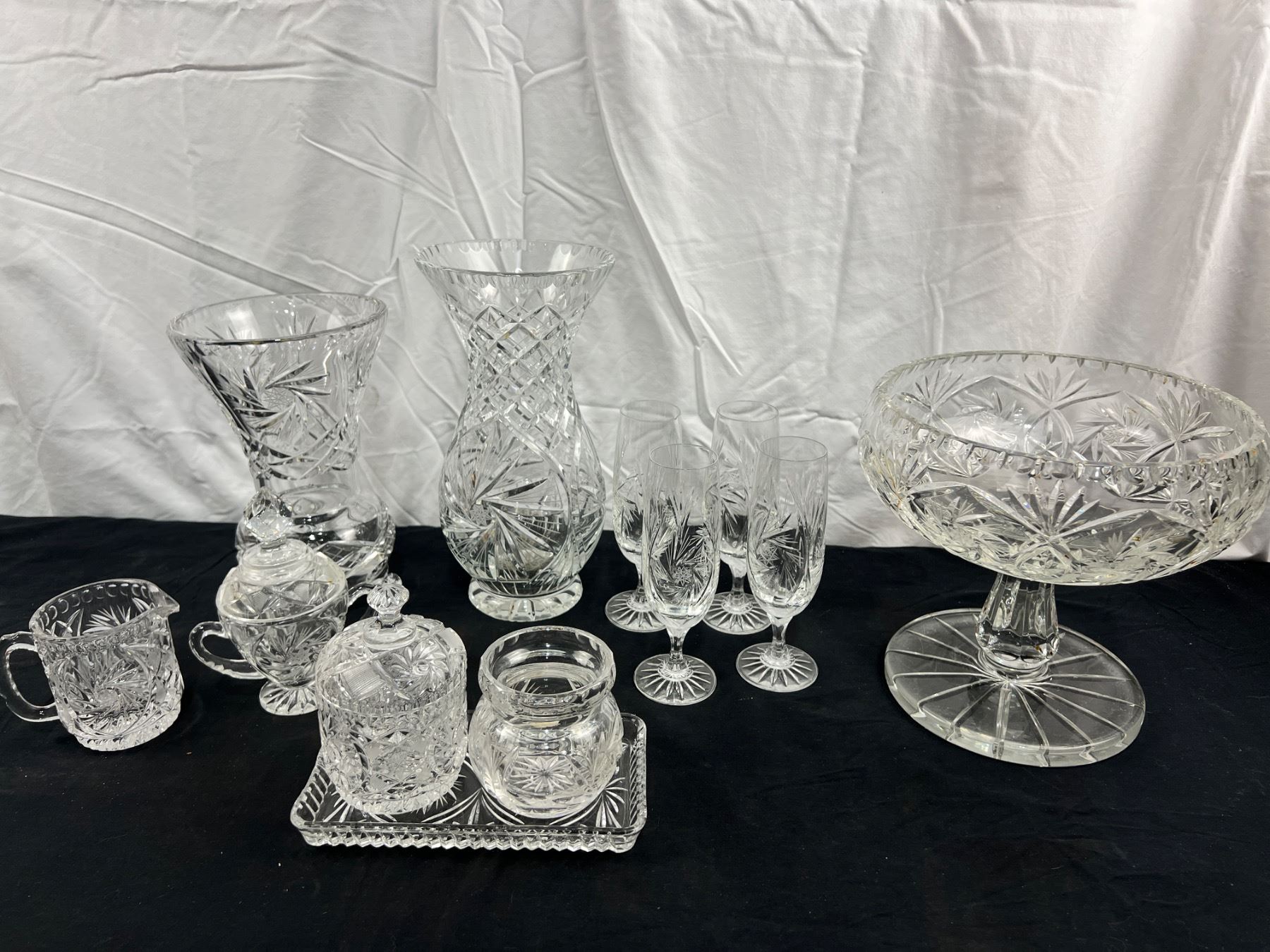 Assortment of pinwheel crystal in various styles dish ware and decorative vases. of Pedestal bowl is 9" tall and 9" in diameter and has some stains. Scratches on base