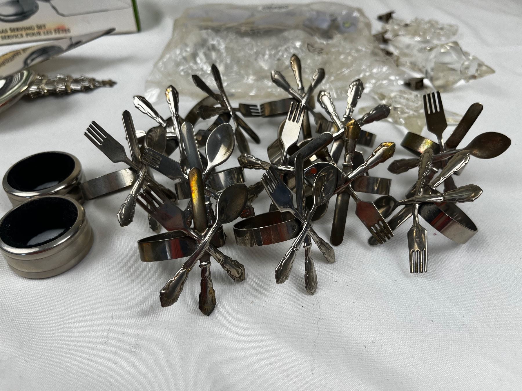 inc. 3pc Christmas serving set, table cloth weights, napkin rings, etc.