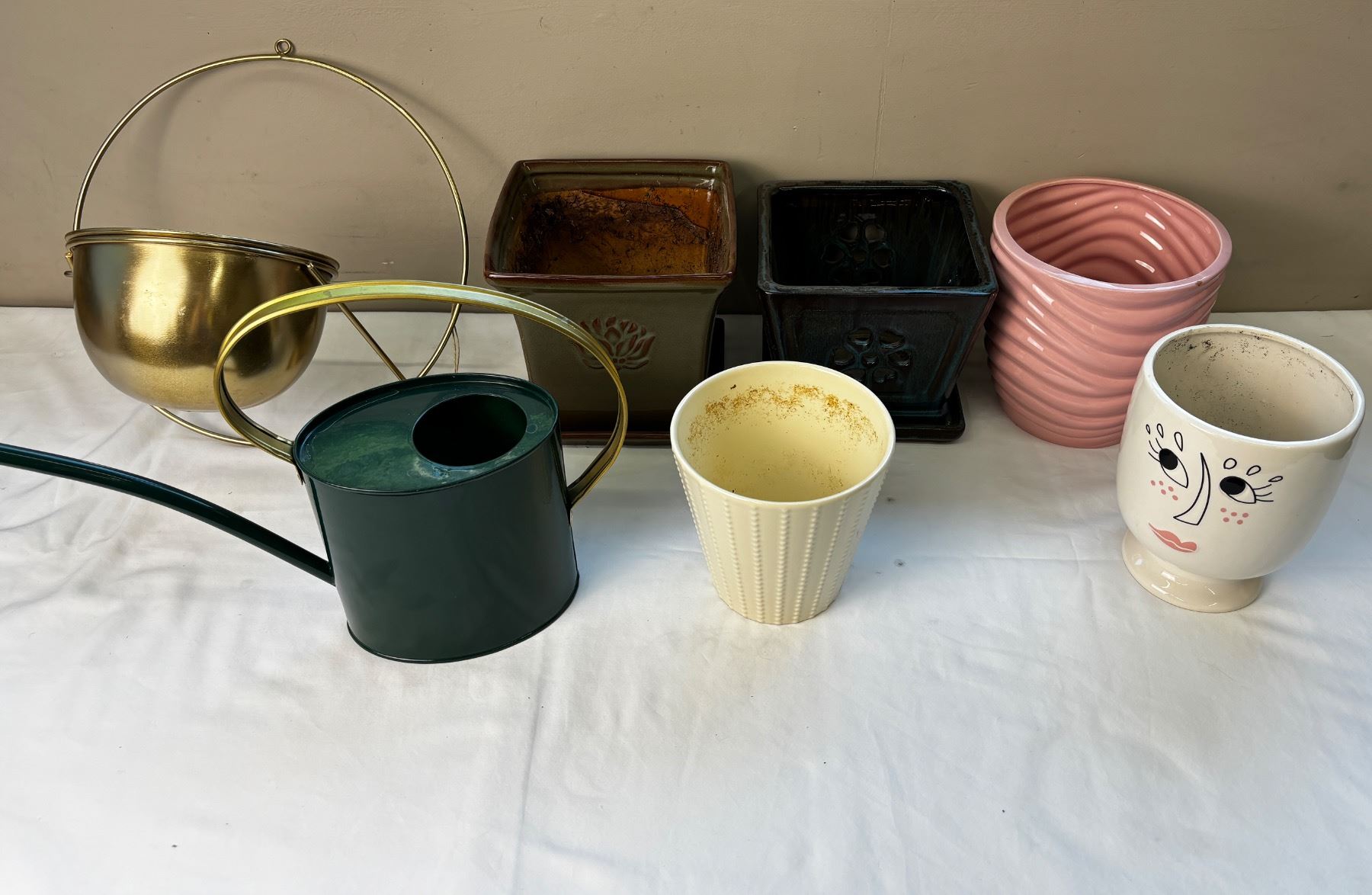 Includes a wall mounted planter pot (13"L x 8"D x 13"H), Tin watering can, various ceramic planter pots,