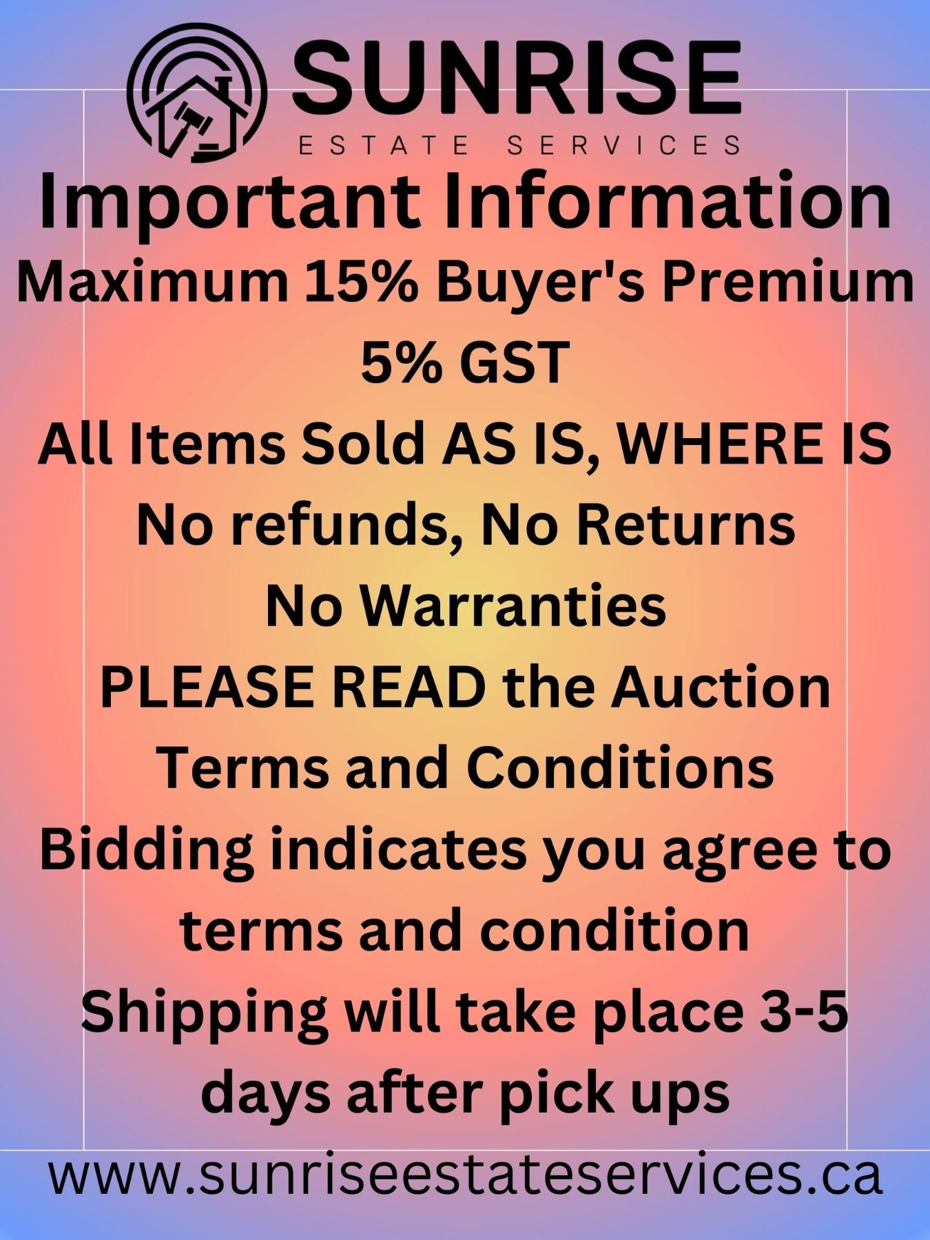 -Items must be picked up on May 6th and 7th between 11am-7pm please book a pick up appointment at www.sunriseestateservices.ca