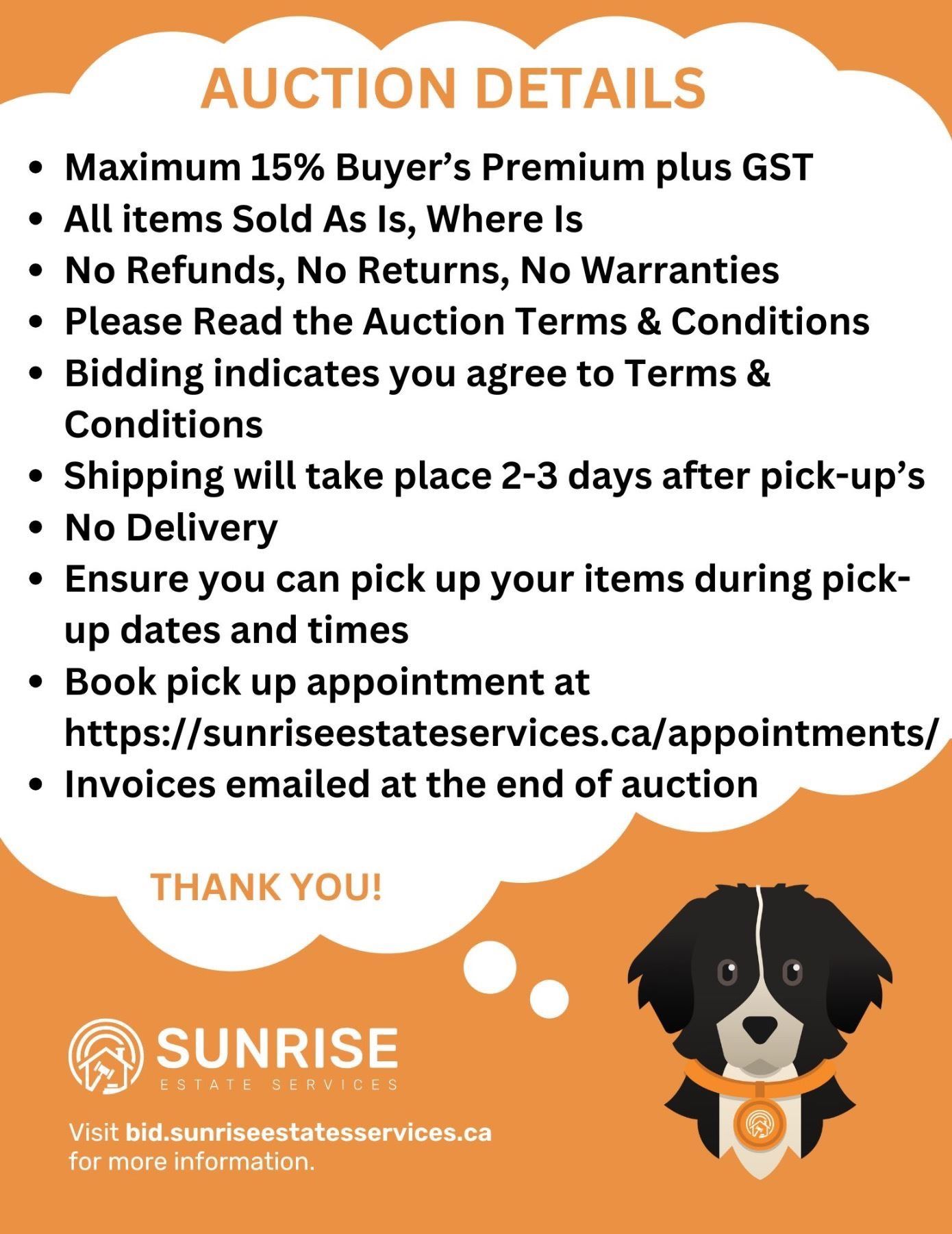 Auctions items must be picked up on April 20th and 21st between 9am-6pm. Visit website to book pick up appointment.