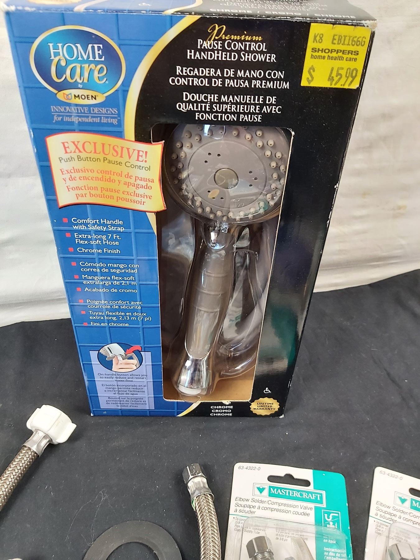 Includes, Home Care Pause Control Handheld Shower, Caulkstrip, and various fittings