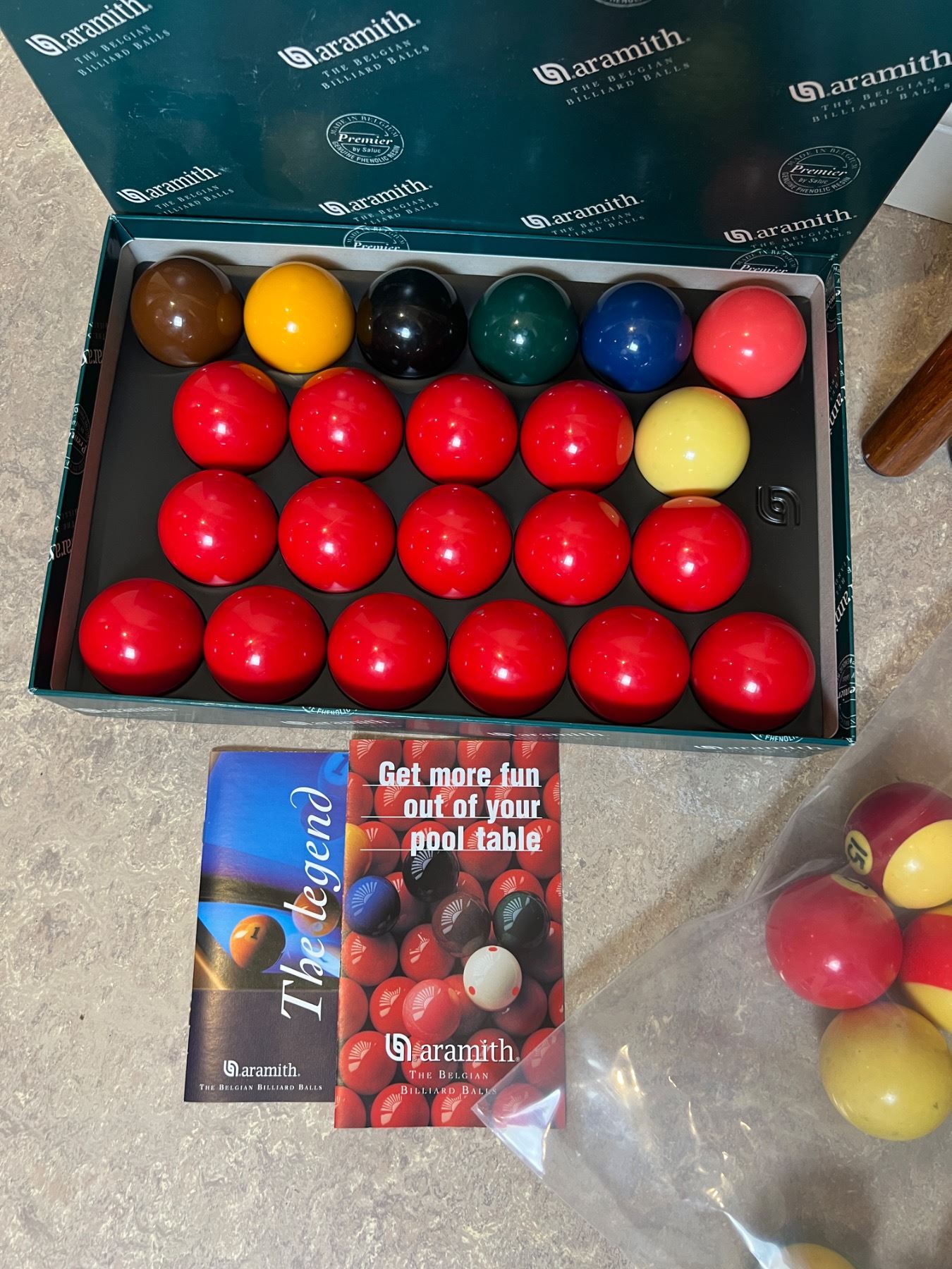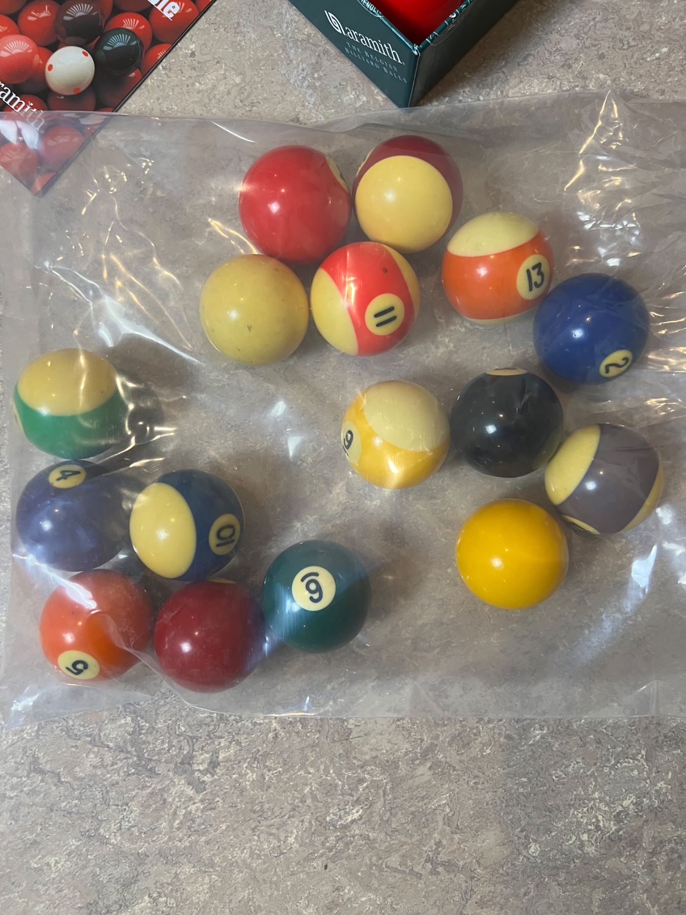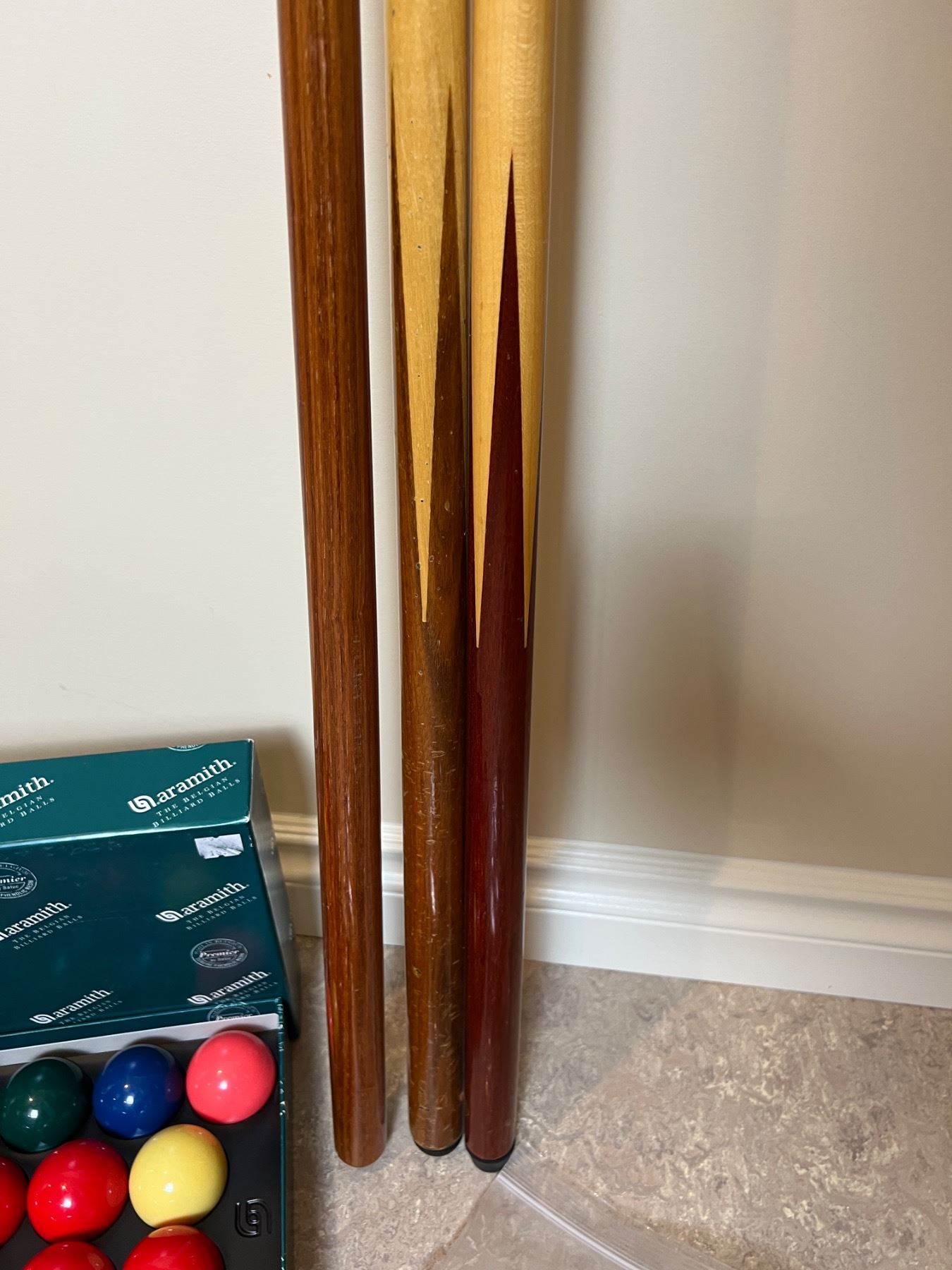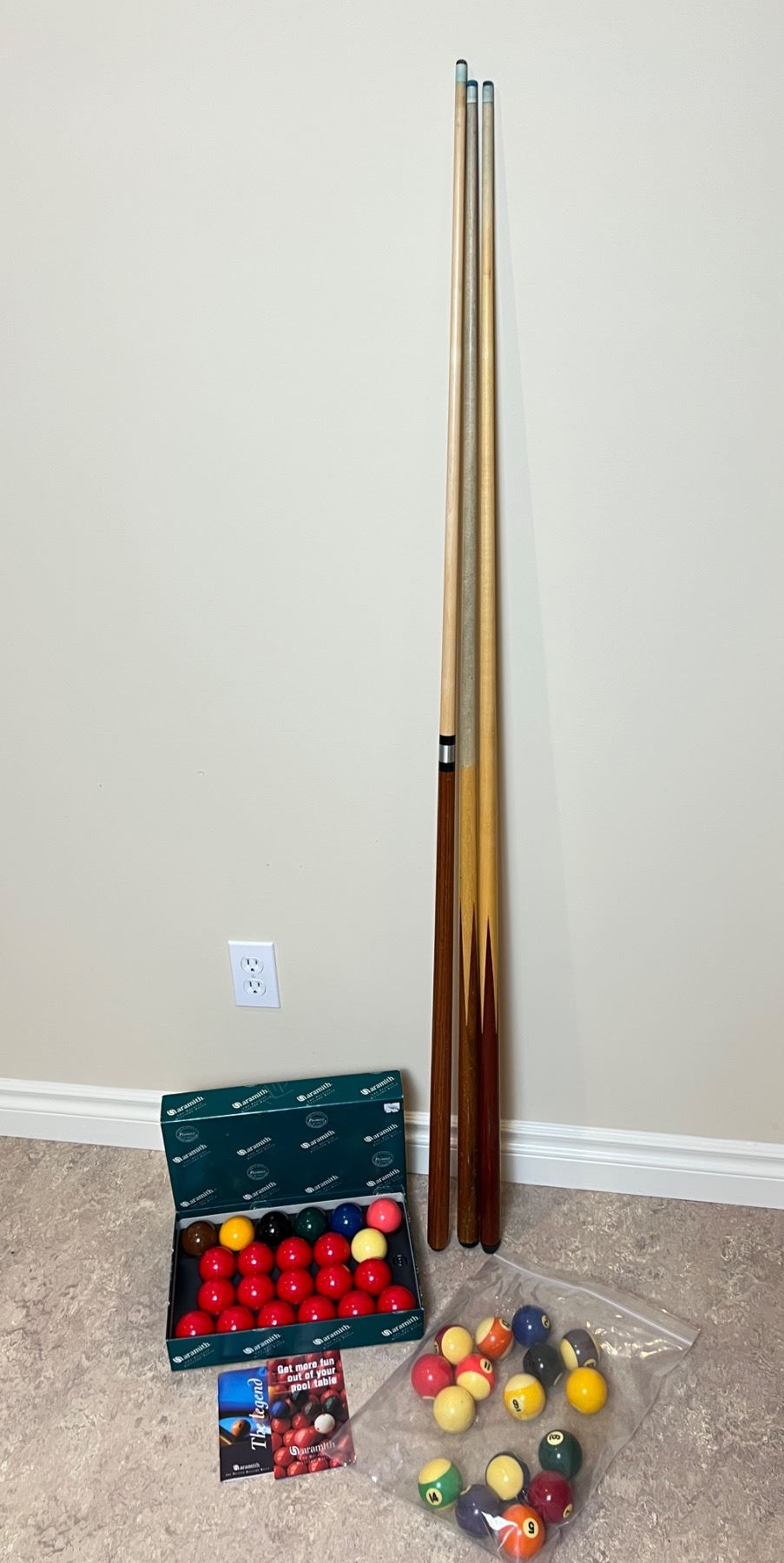 Includes a box of Aramith Belgian Billiard Balls, each of the cues is 59"L