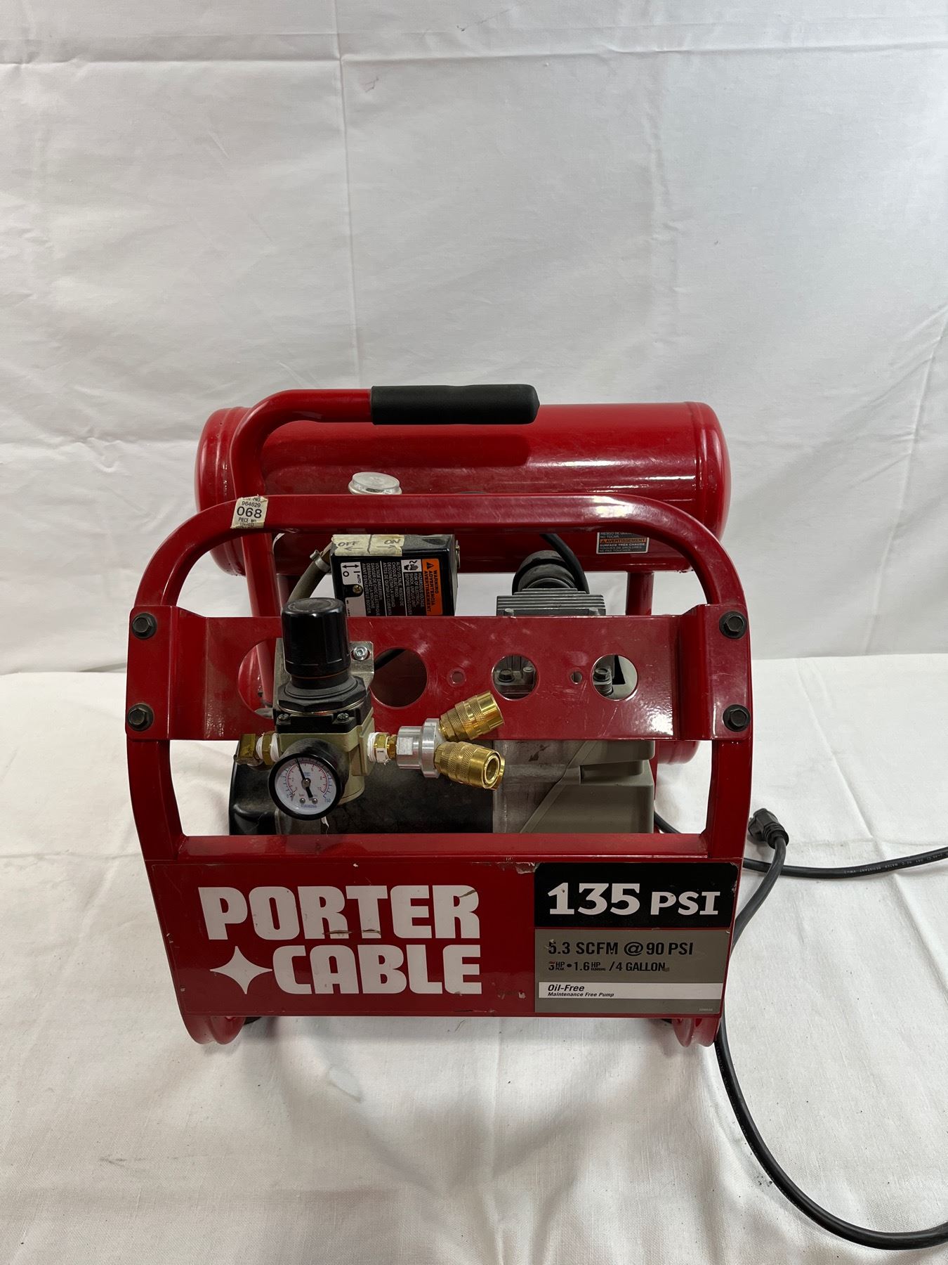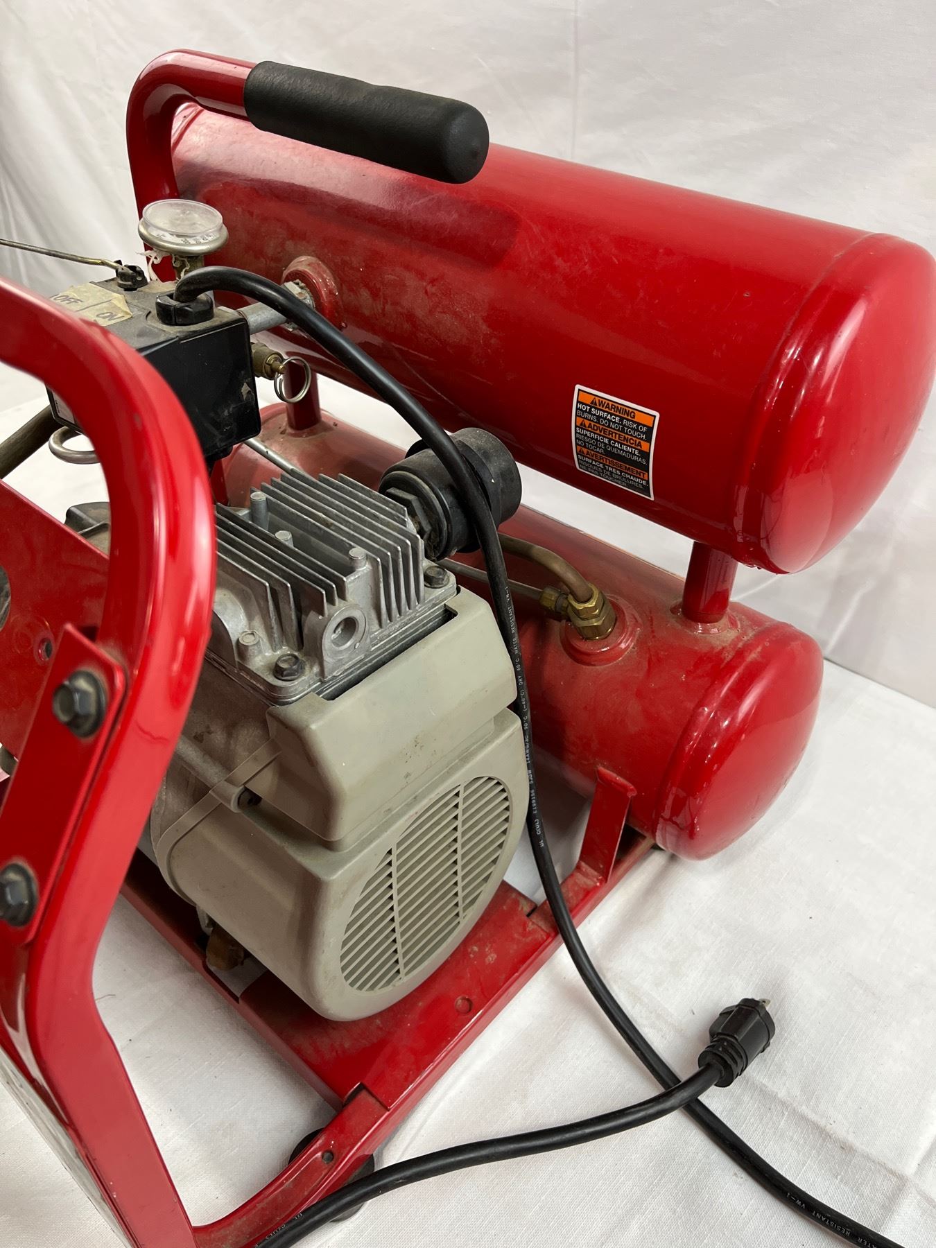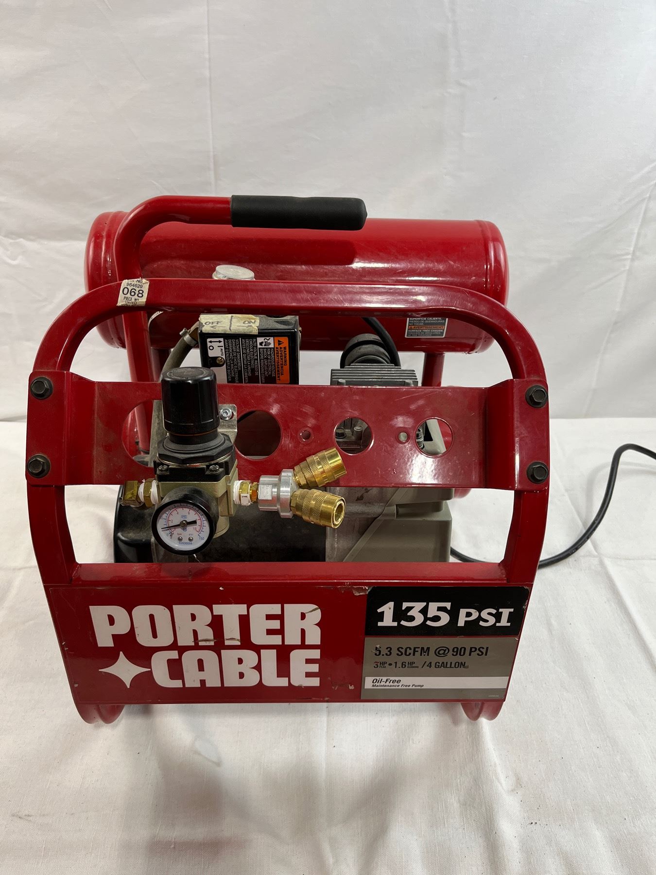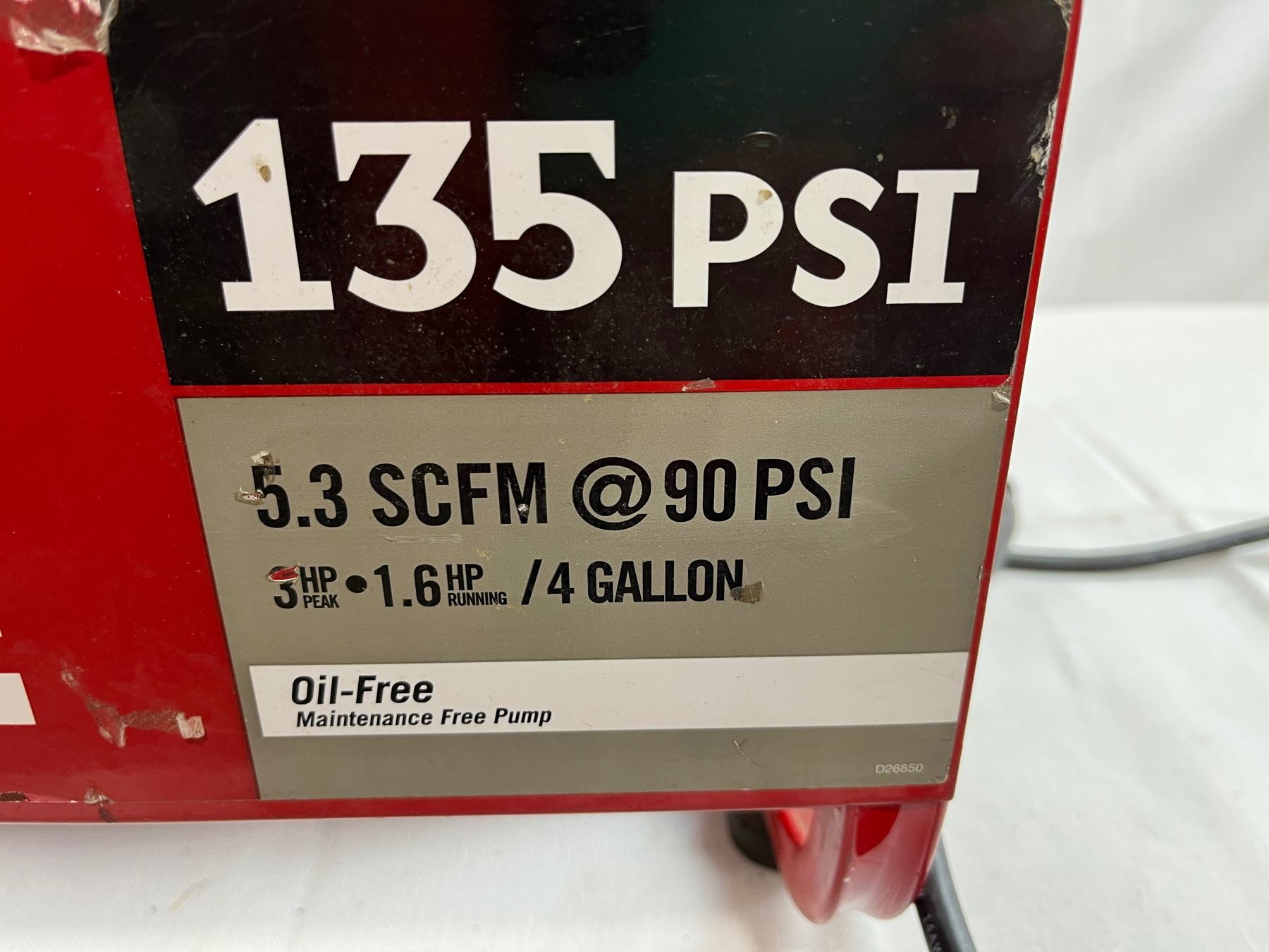 5.3 SCFM @90 PSI 3HP peak 1.6HP running. 4 Gallon Oil Free maintenance free pump.Running condition,some ware and scratches.