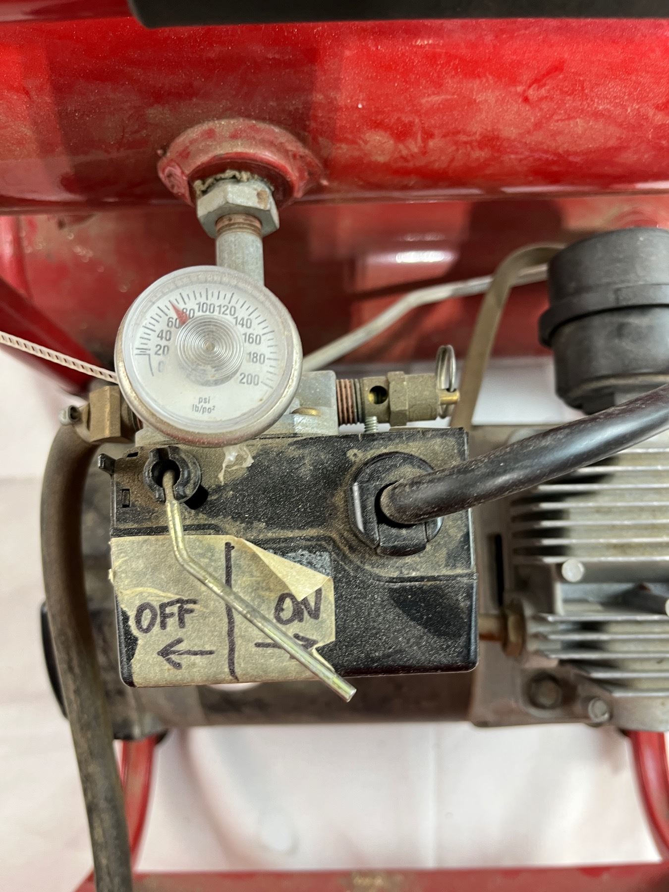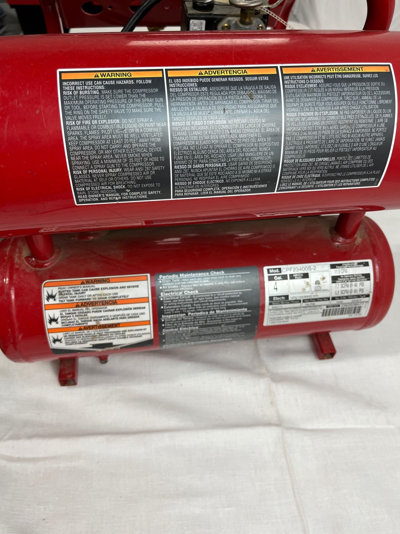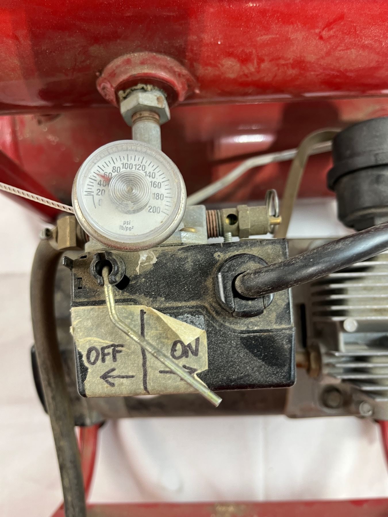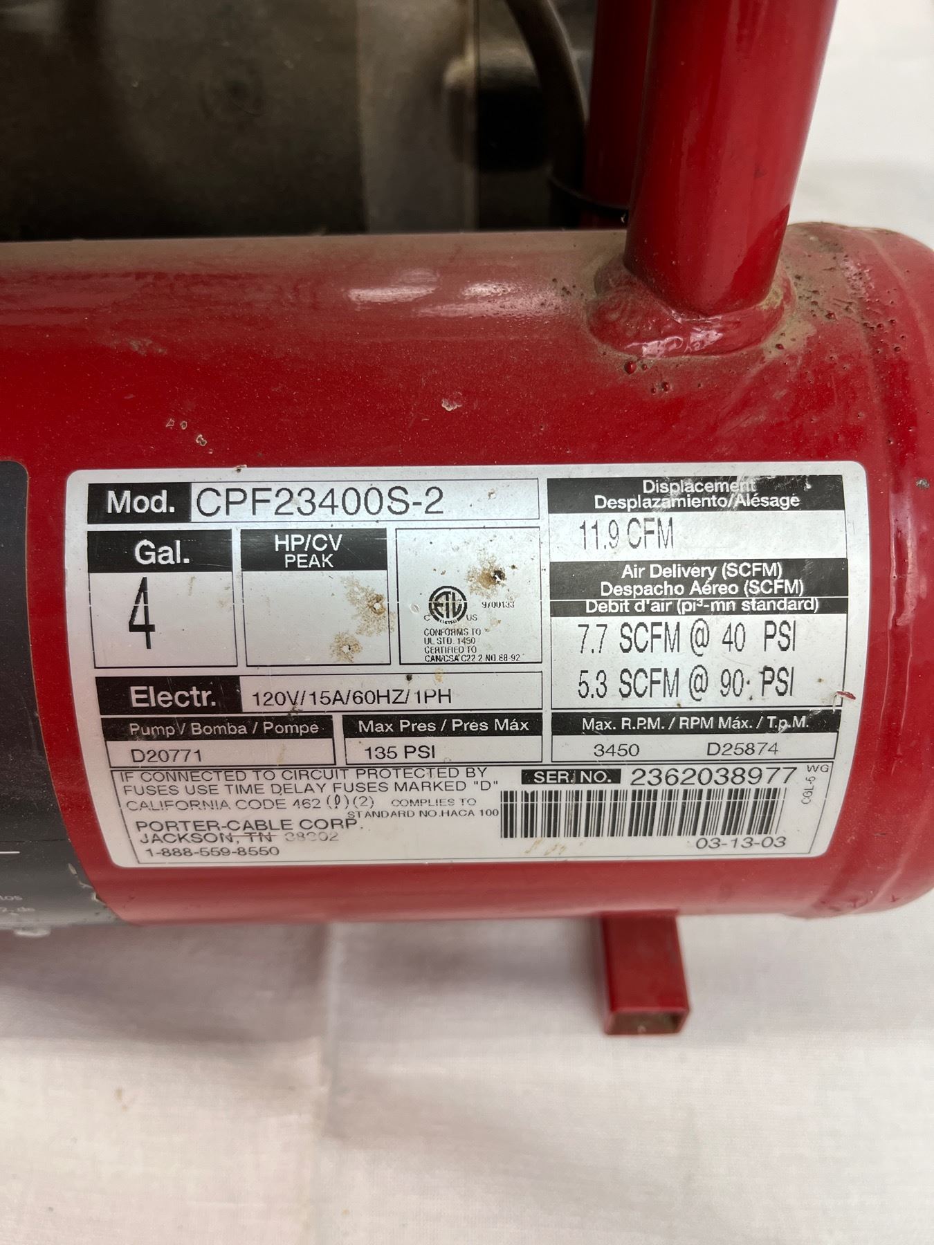 5.3 SCFM @90 PSI 3HP peak 1.6HP running. 4 Gallon Oil Free maintenance free pump.Running condition,some ware and scratches.