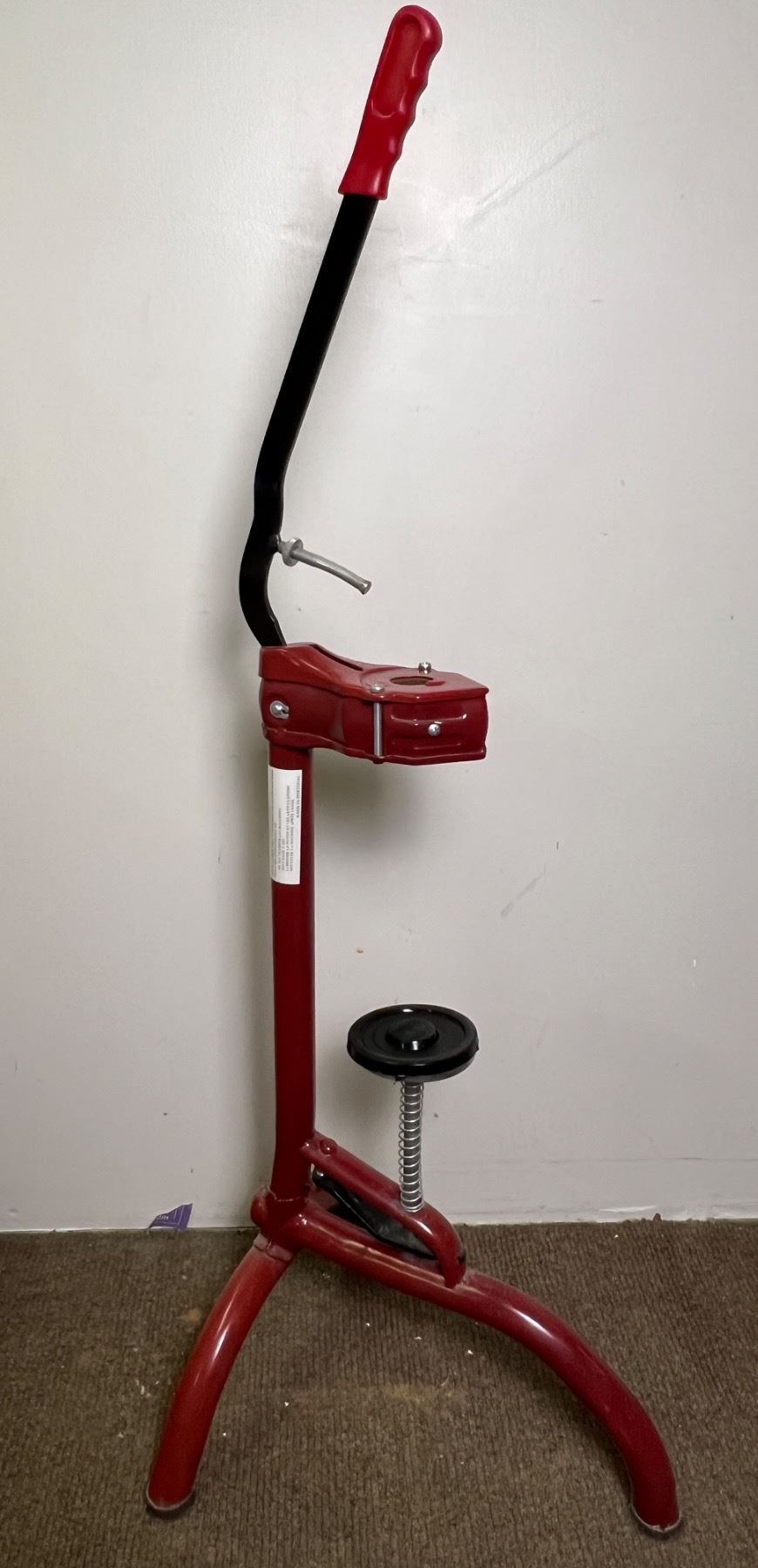 Small brand marking on press but brand unknown. Good tension on handle. Measures 46" tall with handle raised.