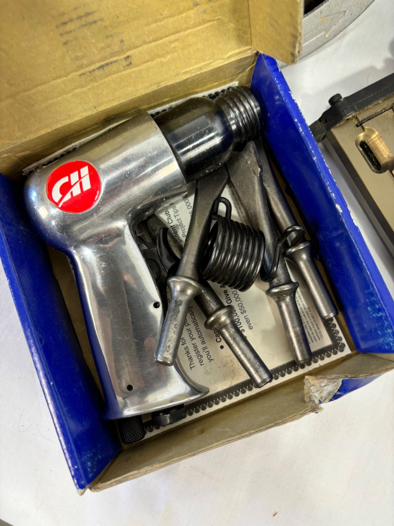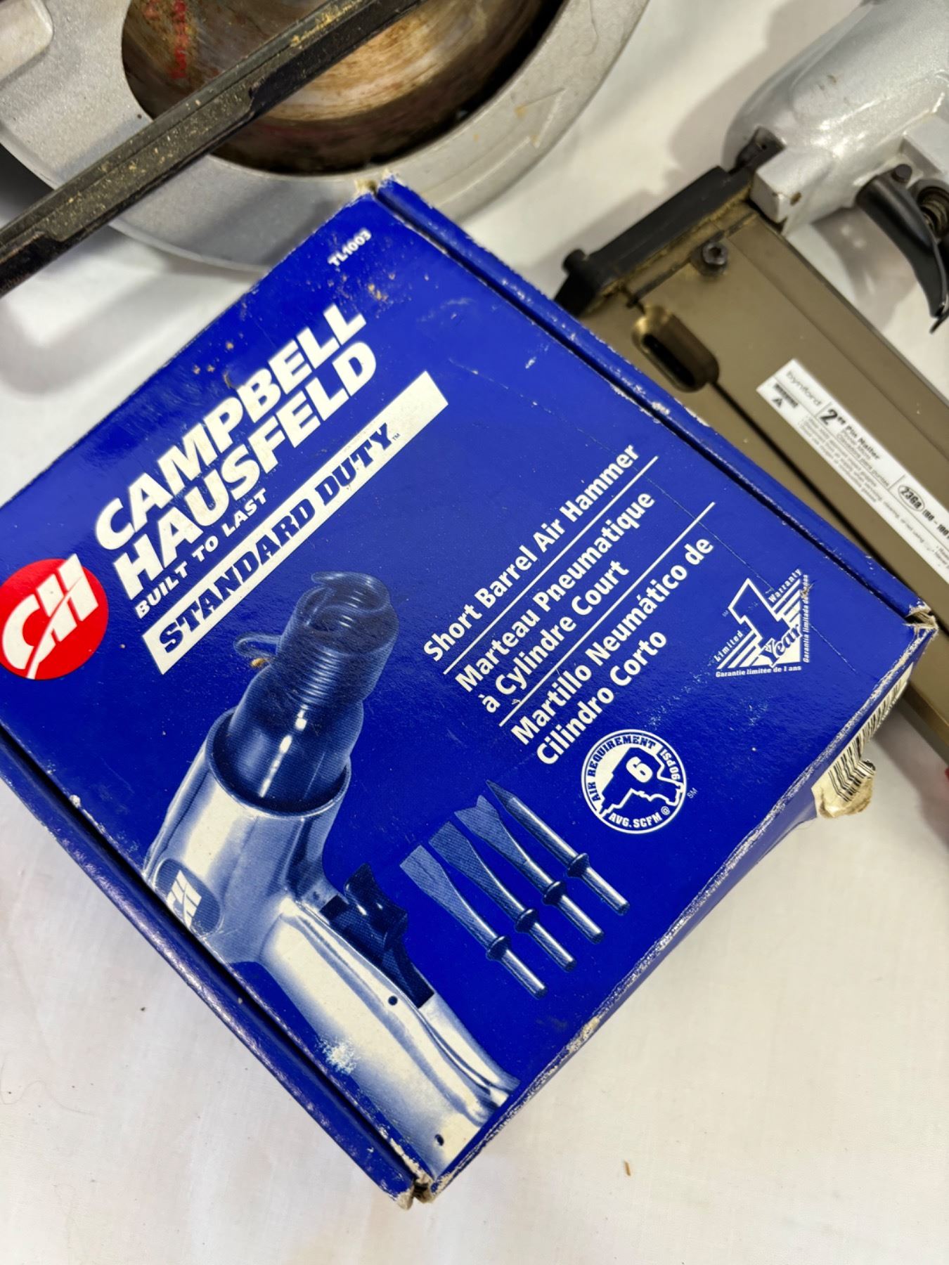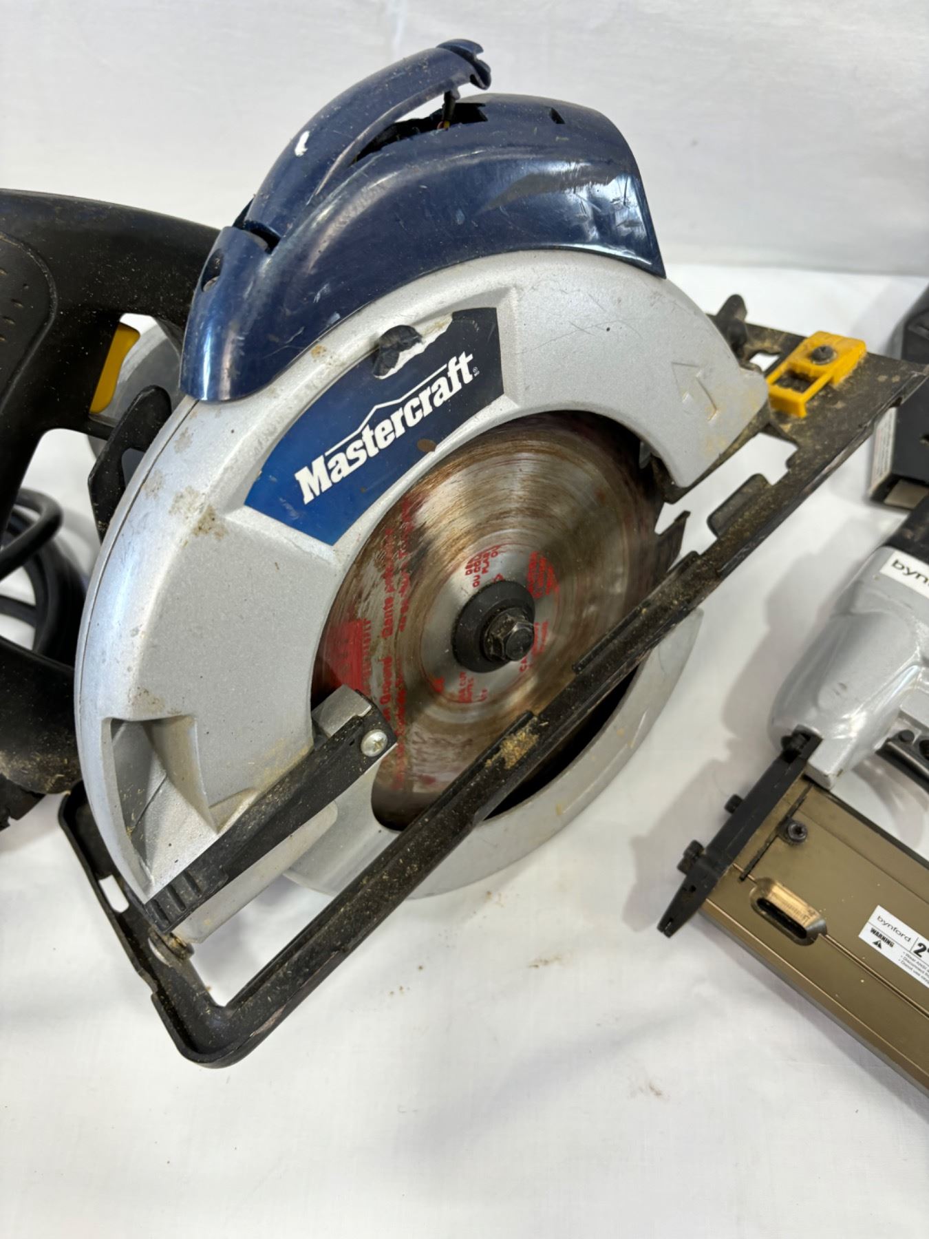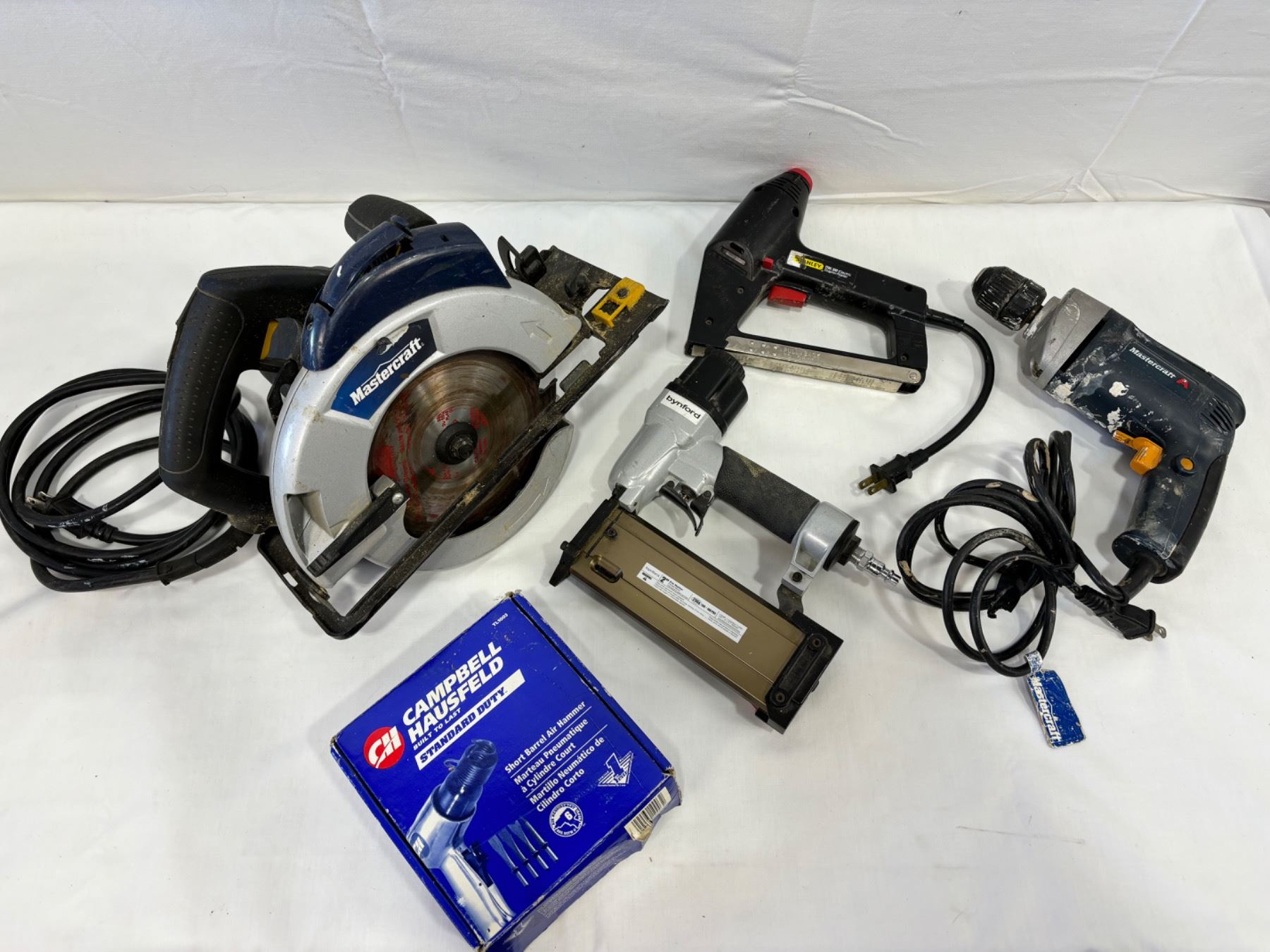 Includes saw, stapler, drill, air hammer