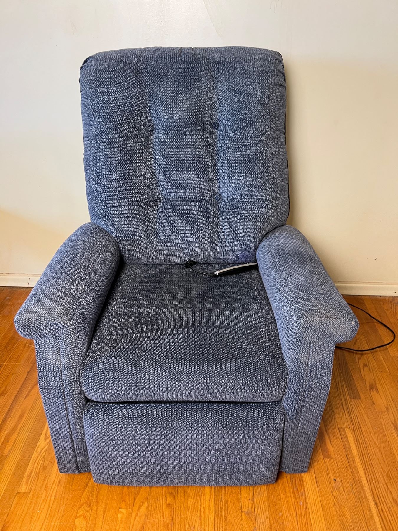 In working condition, 31"W x 32"L x 43"H fully closed, some small spot stains on the cushion