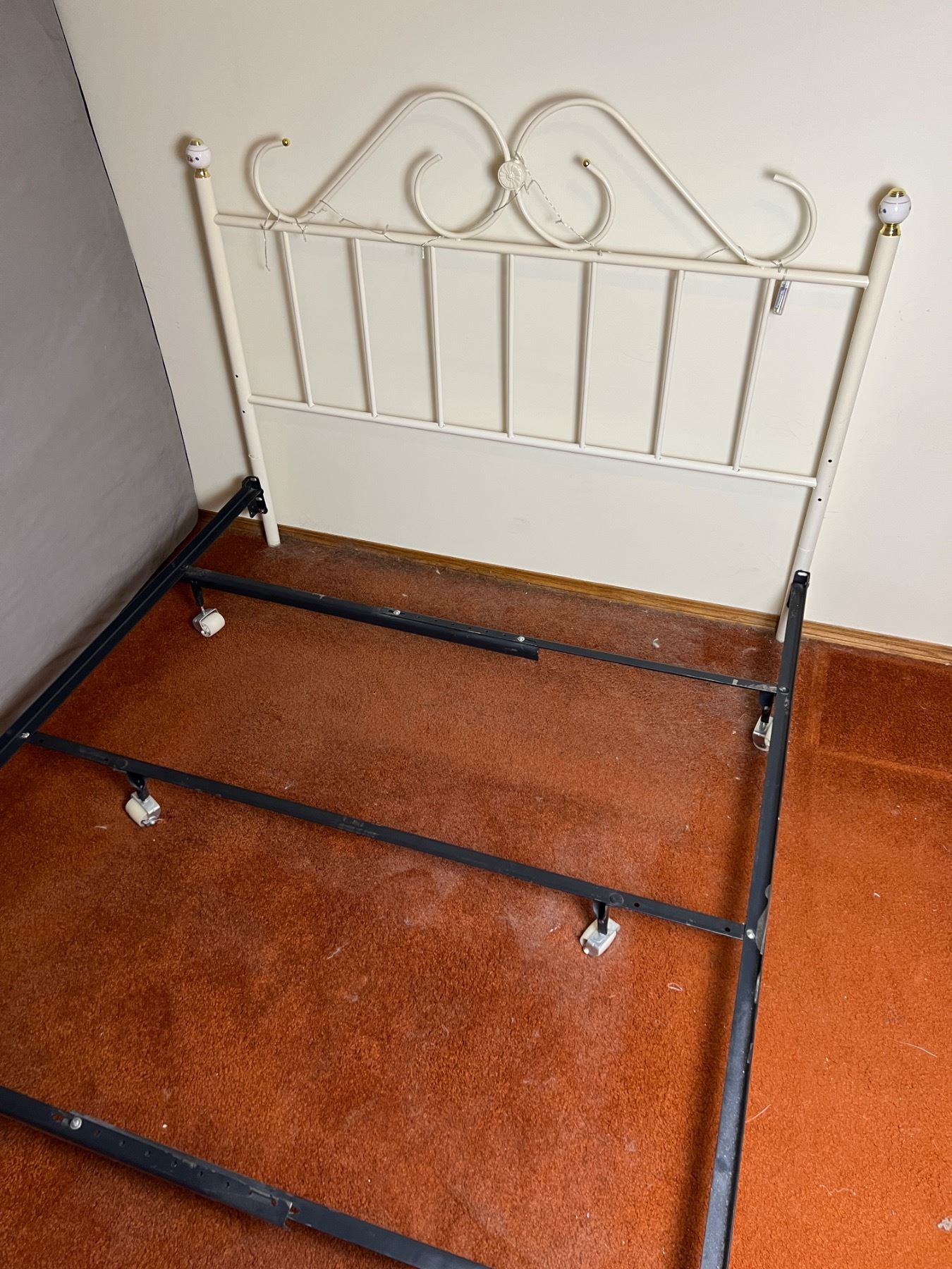 Damage to one of the wheels and another is loose in its socket. Headboard measures 4ft tall