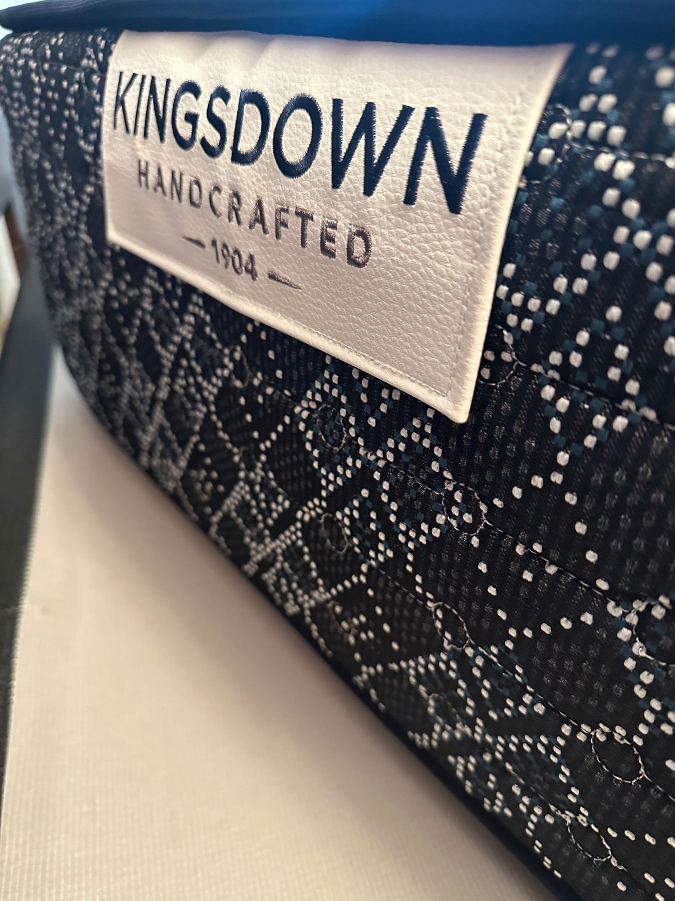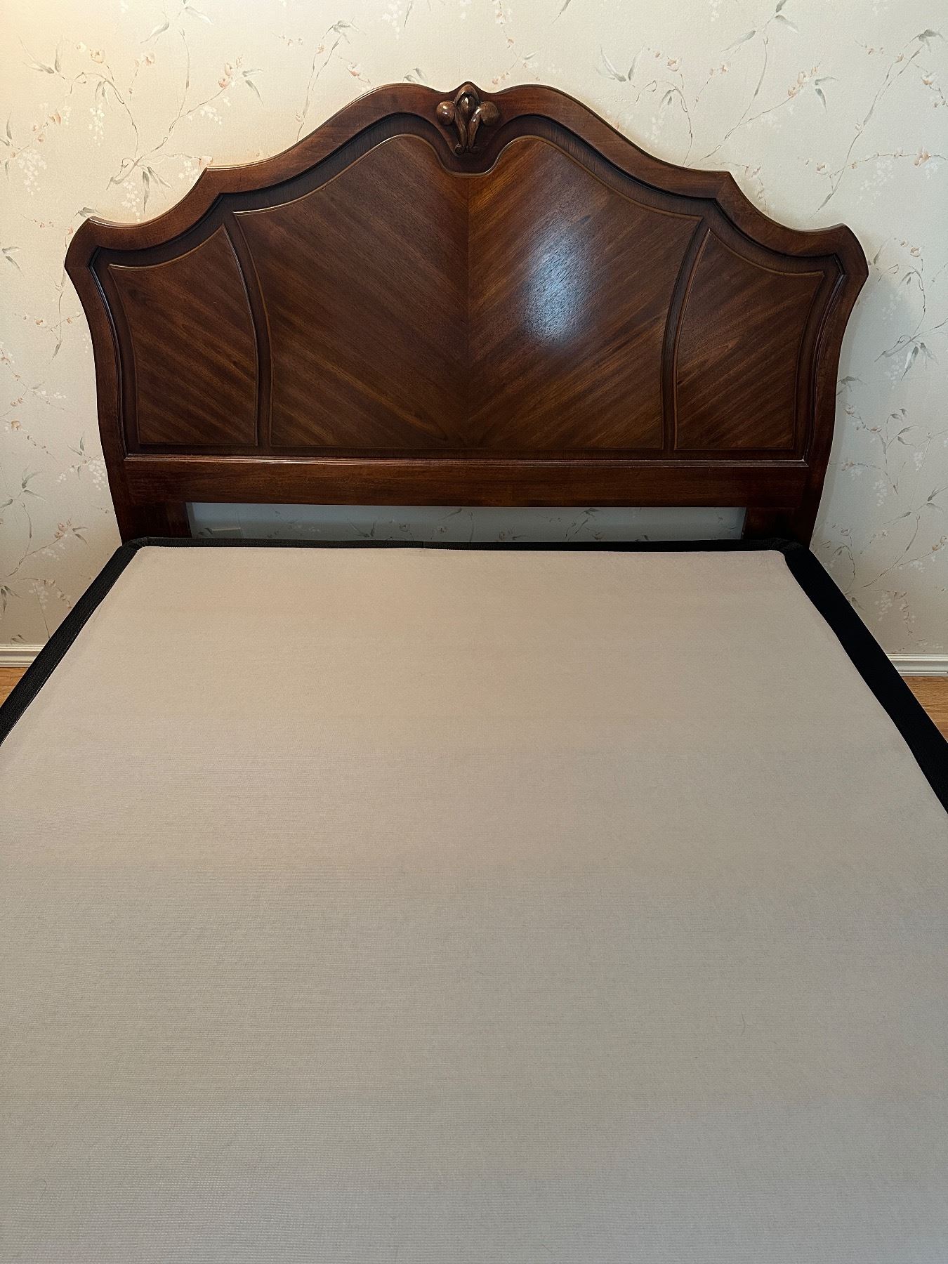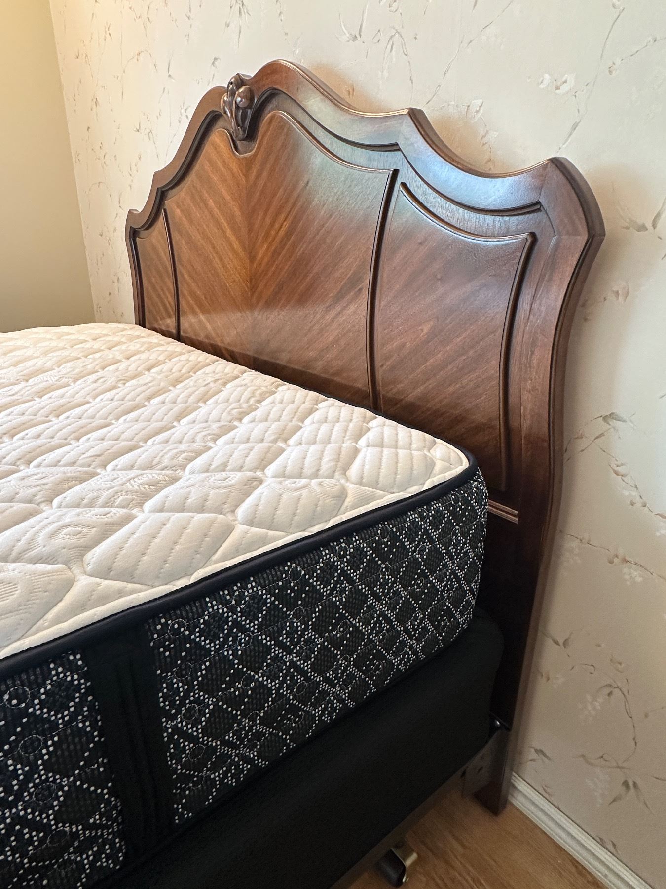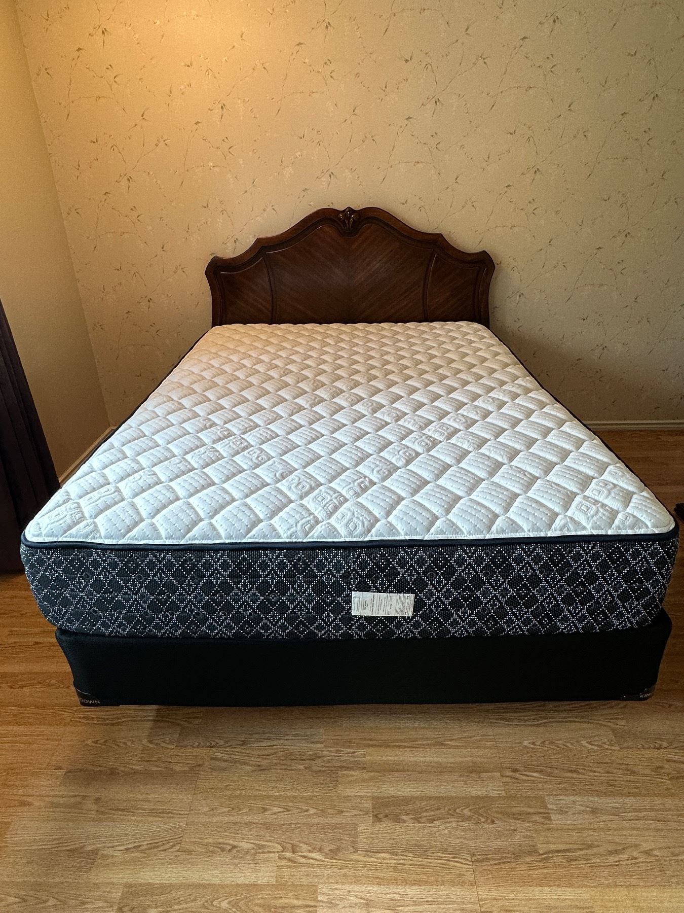 Includes wooden headboard, Queen Size Kingsdown mattress, box spring and rails. Headboard is 51" tall x 61" wide x 1" deep