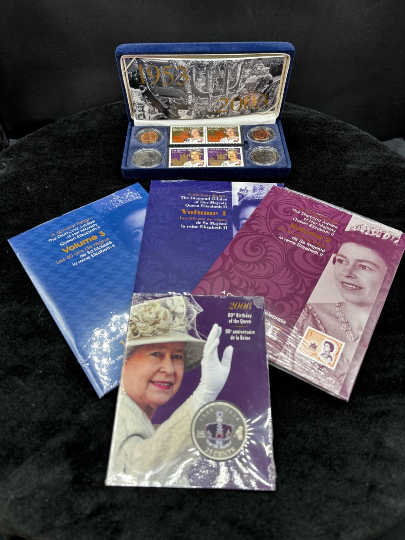 Includes, 1953 Coronation Stamp & Coin Set, 2006 80th Birthday coin, Volume 1-2-3 Diamond Jubilee Keepsake Folders