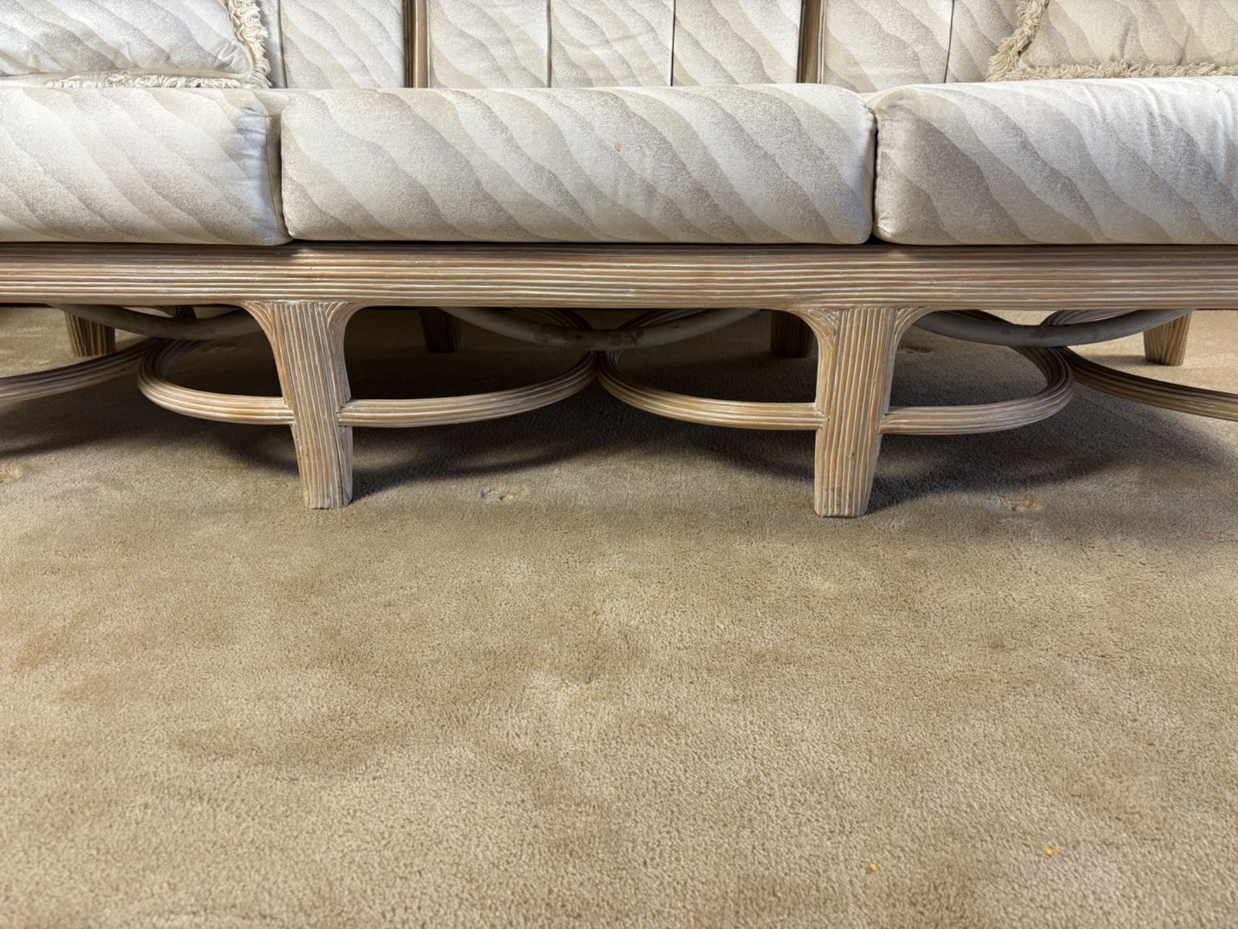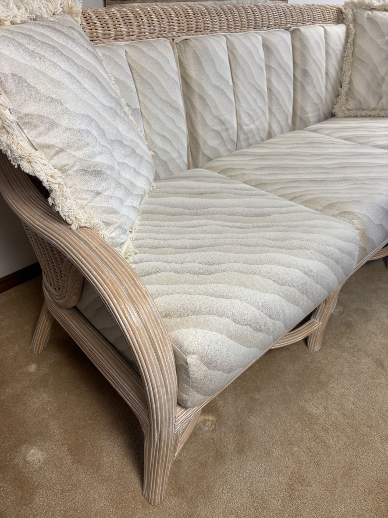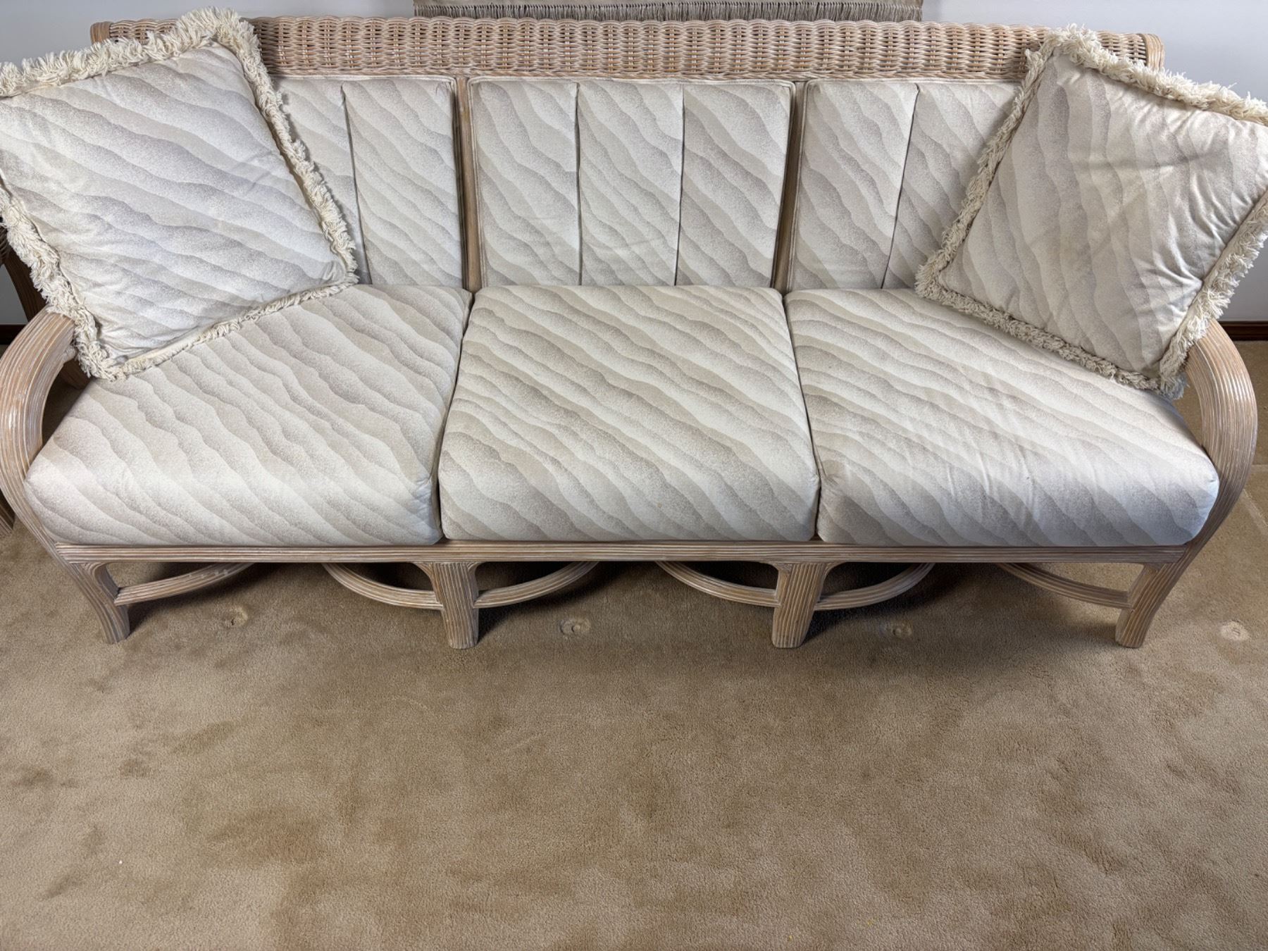 Including two throw pillows, 33"H x 76"L x 31"D, made by Pacific Rattan