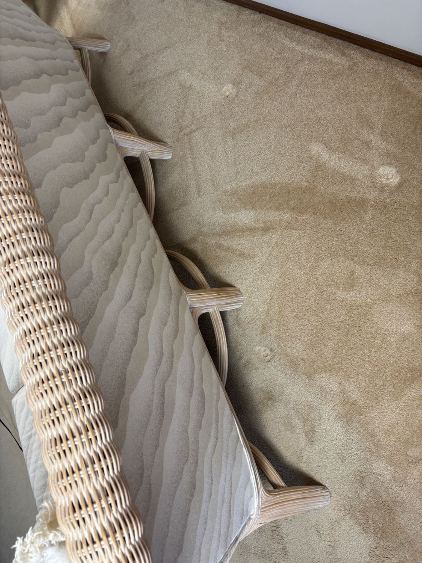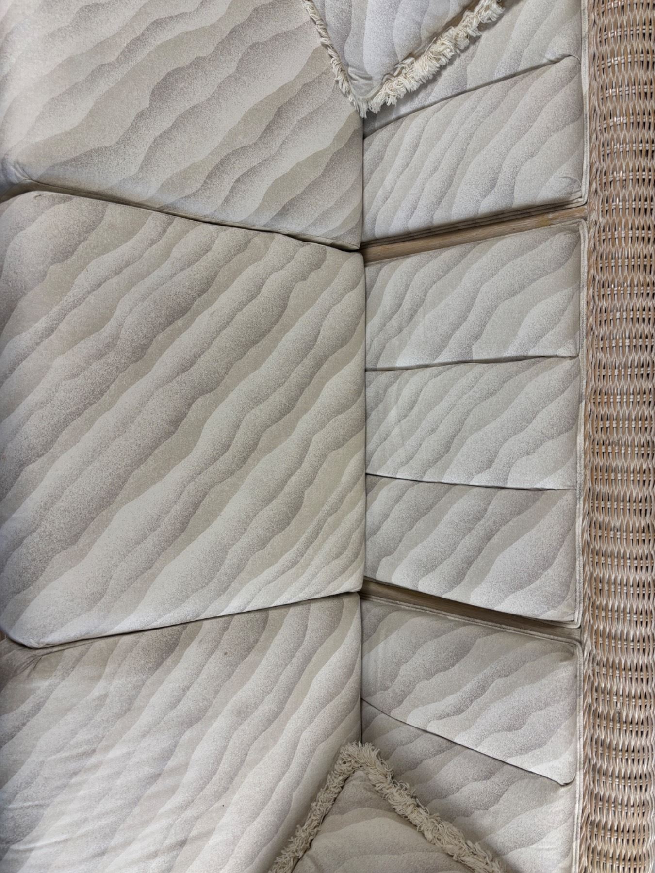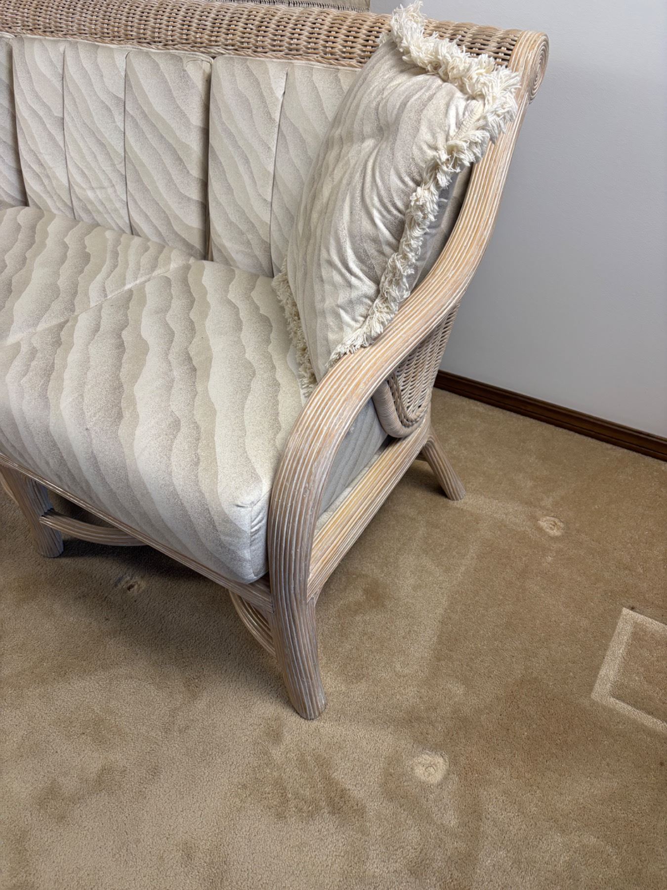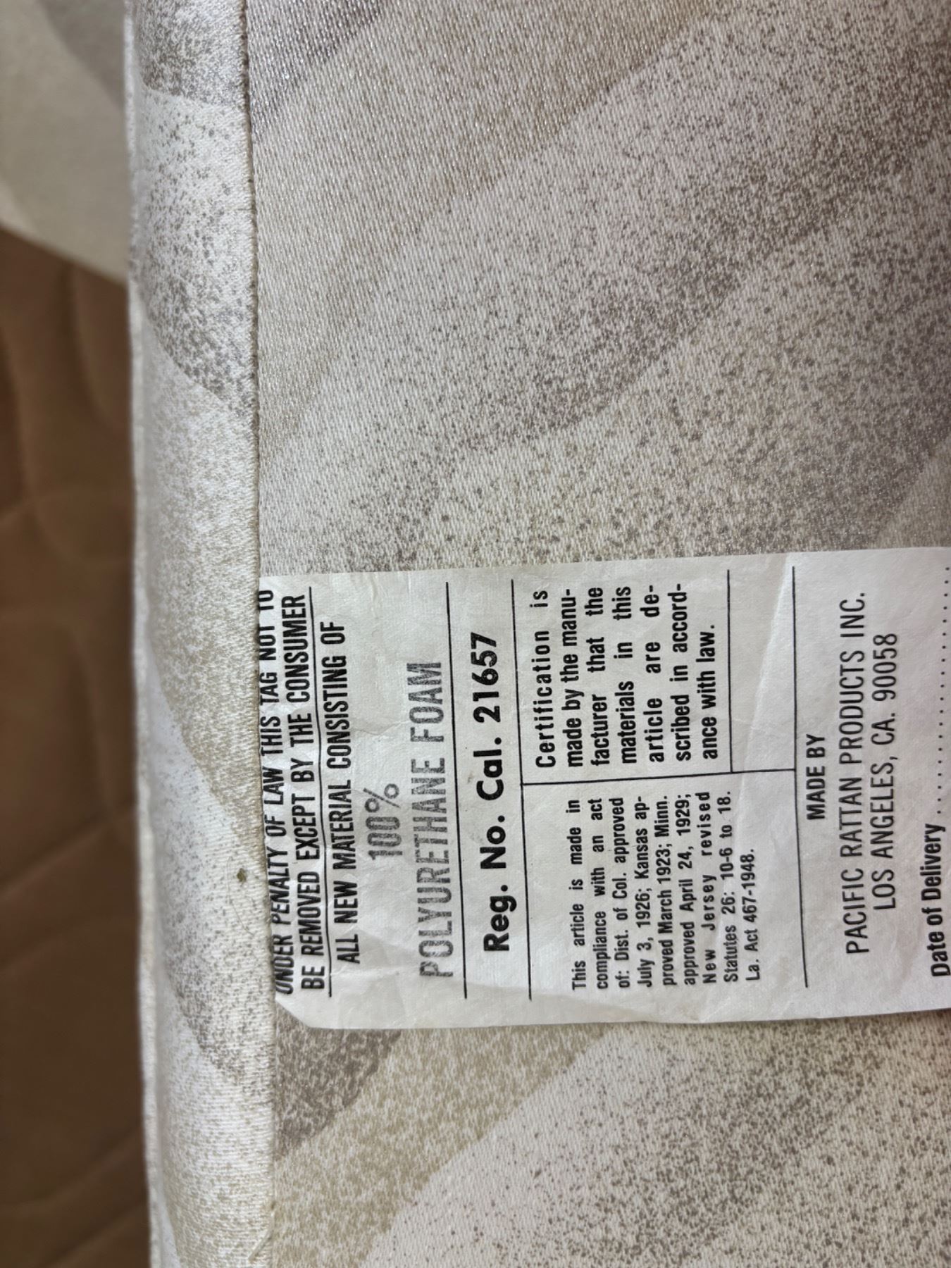 Including two throw pillows, 33"H x 76"L x 31"D, made by Pacific Rattan