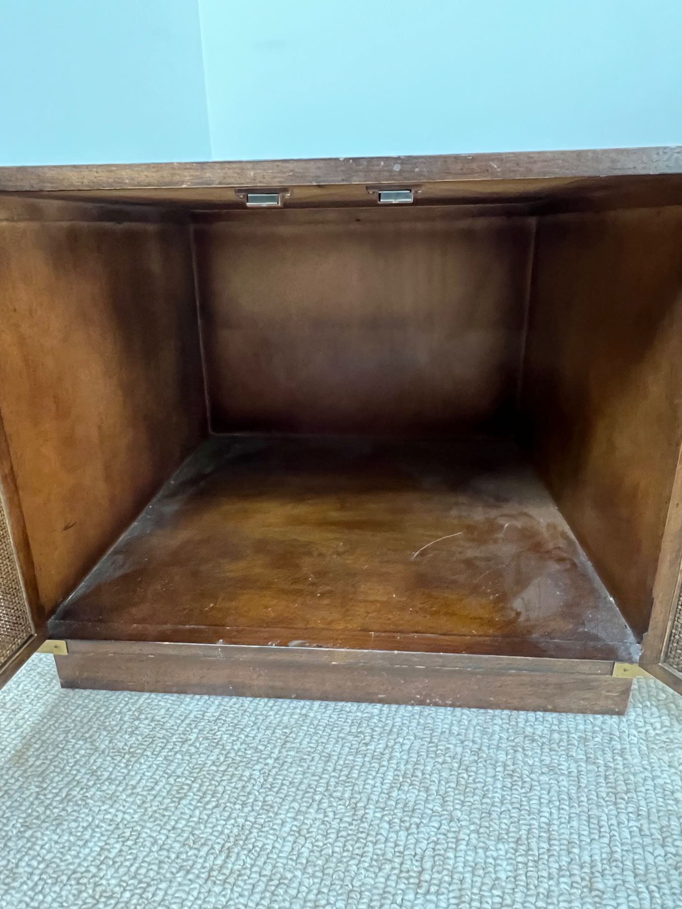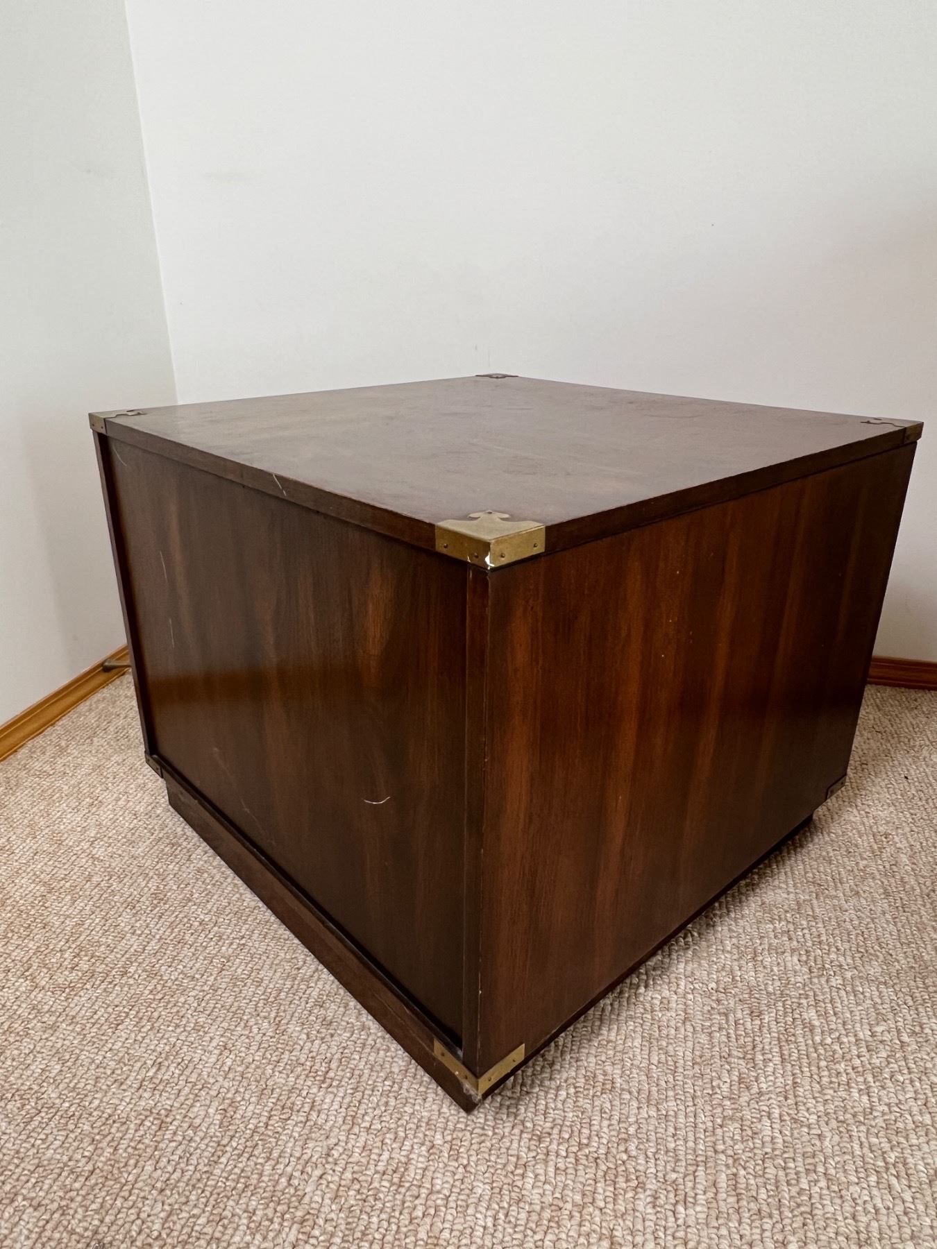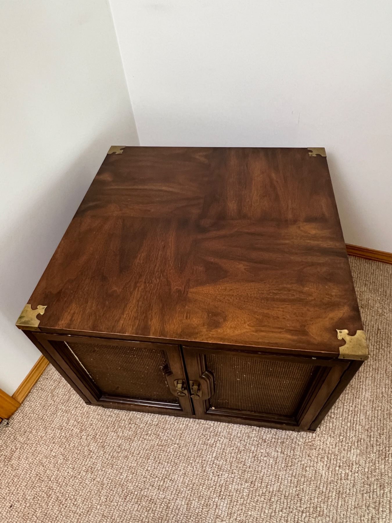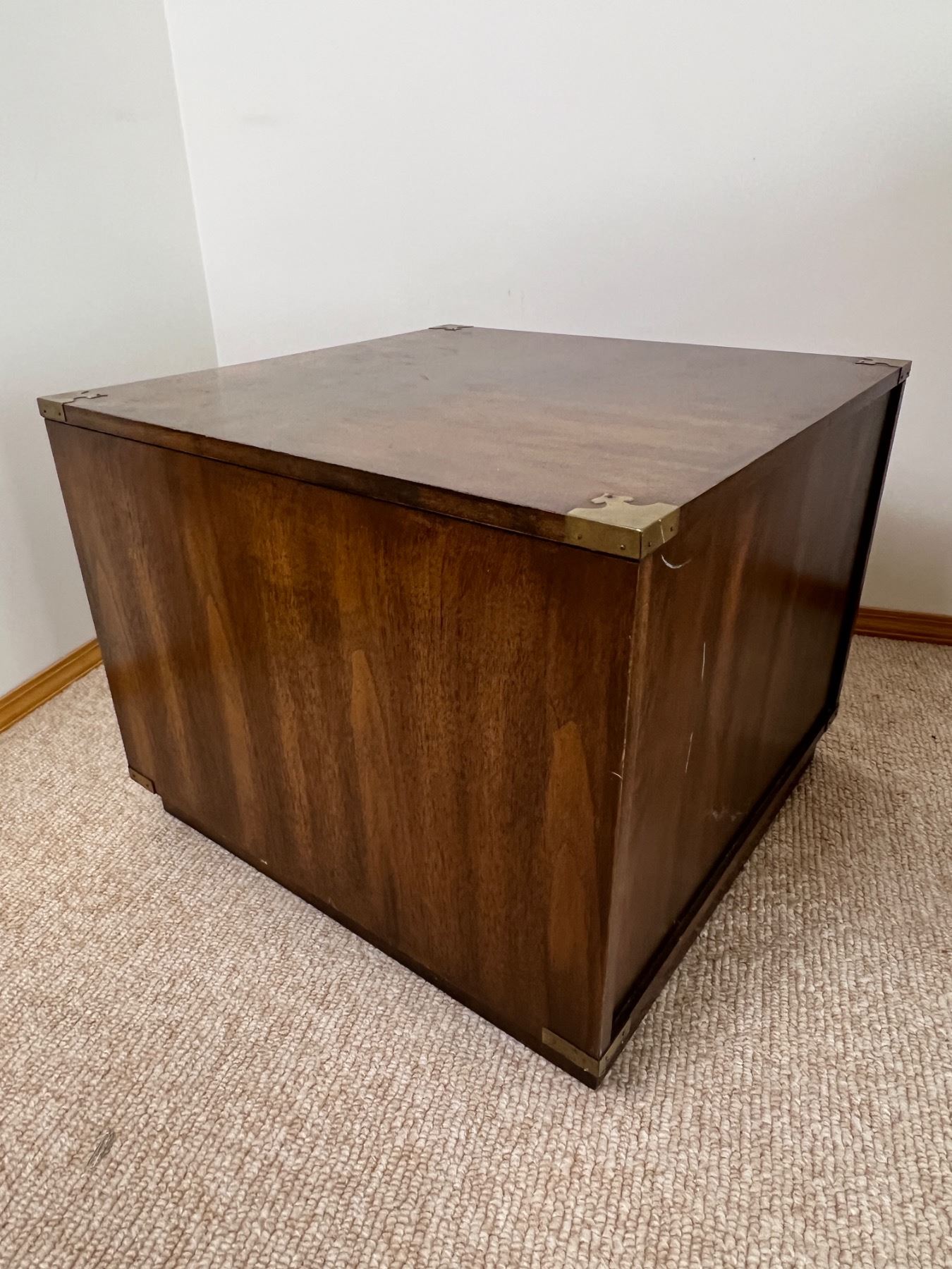 Measures 26" by 26" and 21" tall. Some scratches to wood surface along the front and rear panels.
