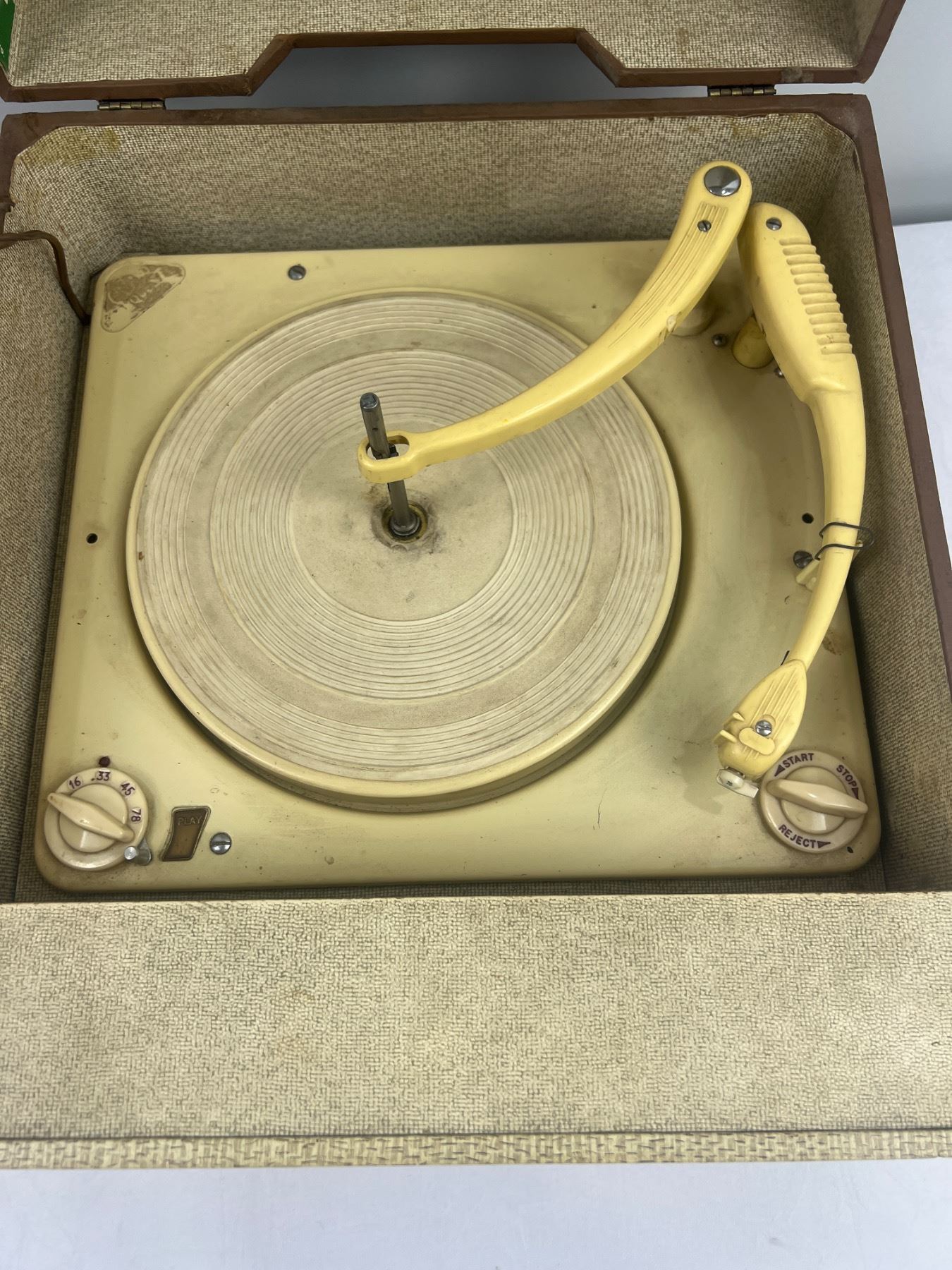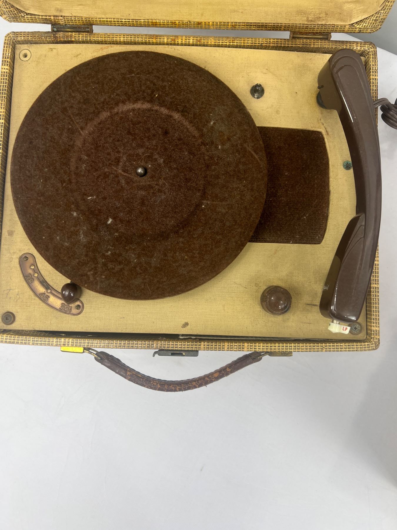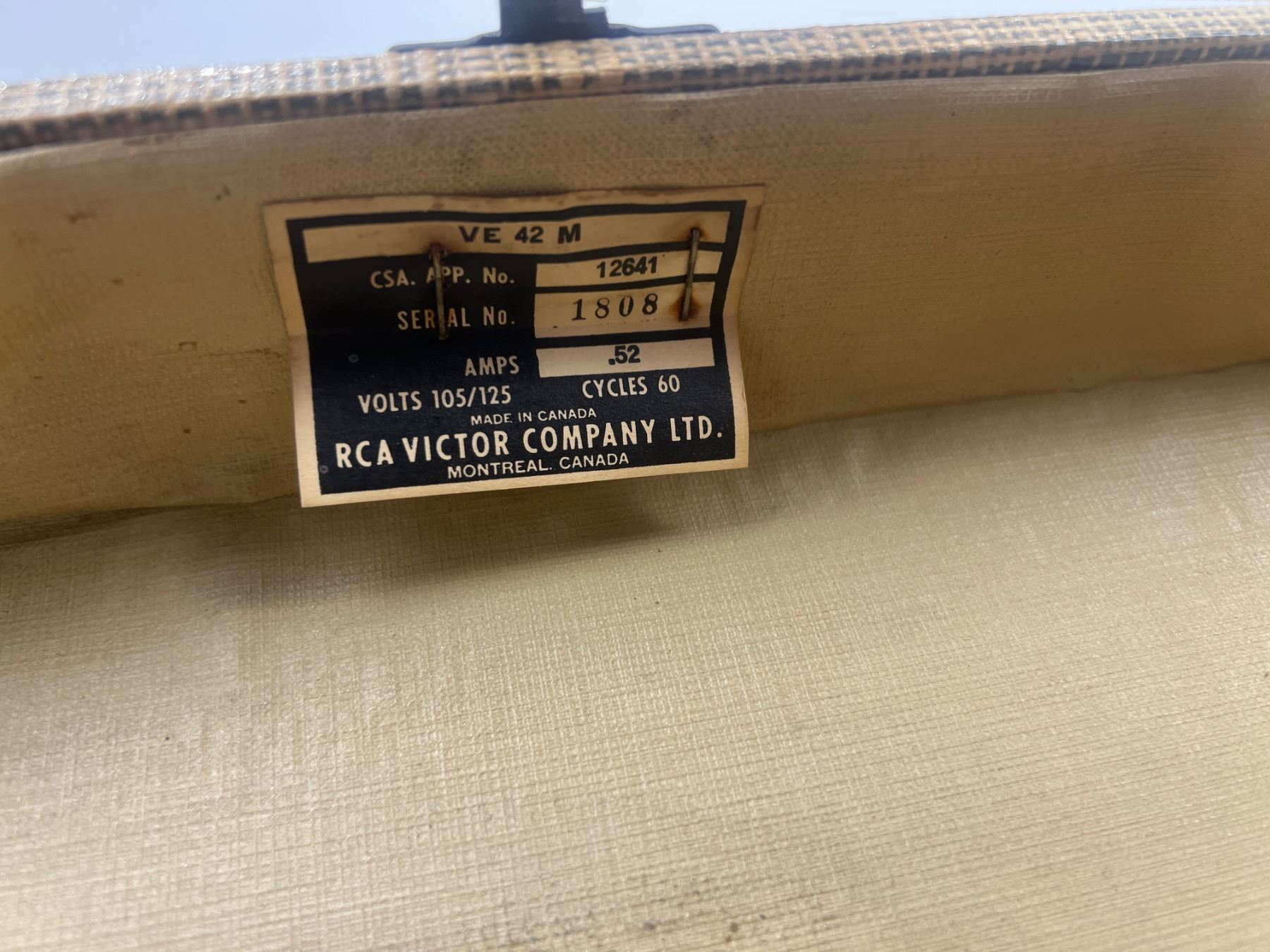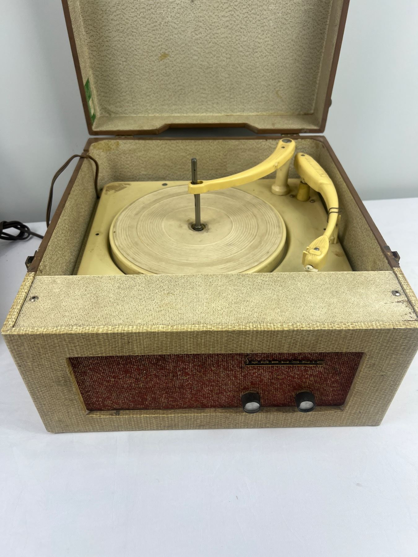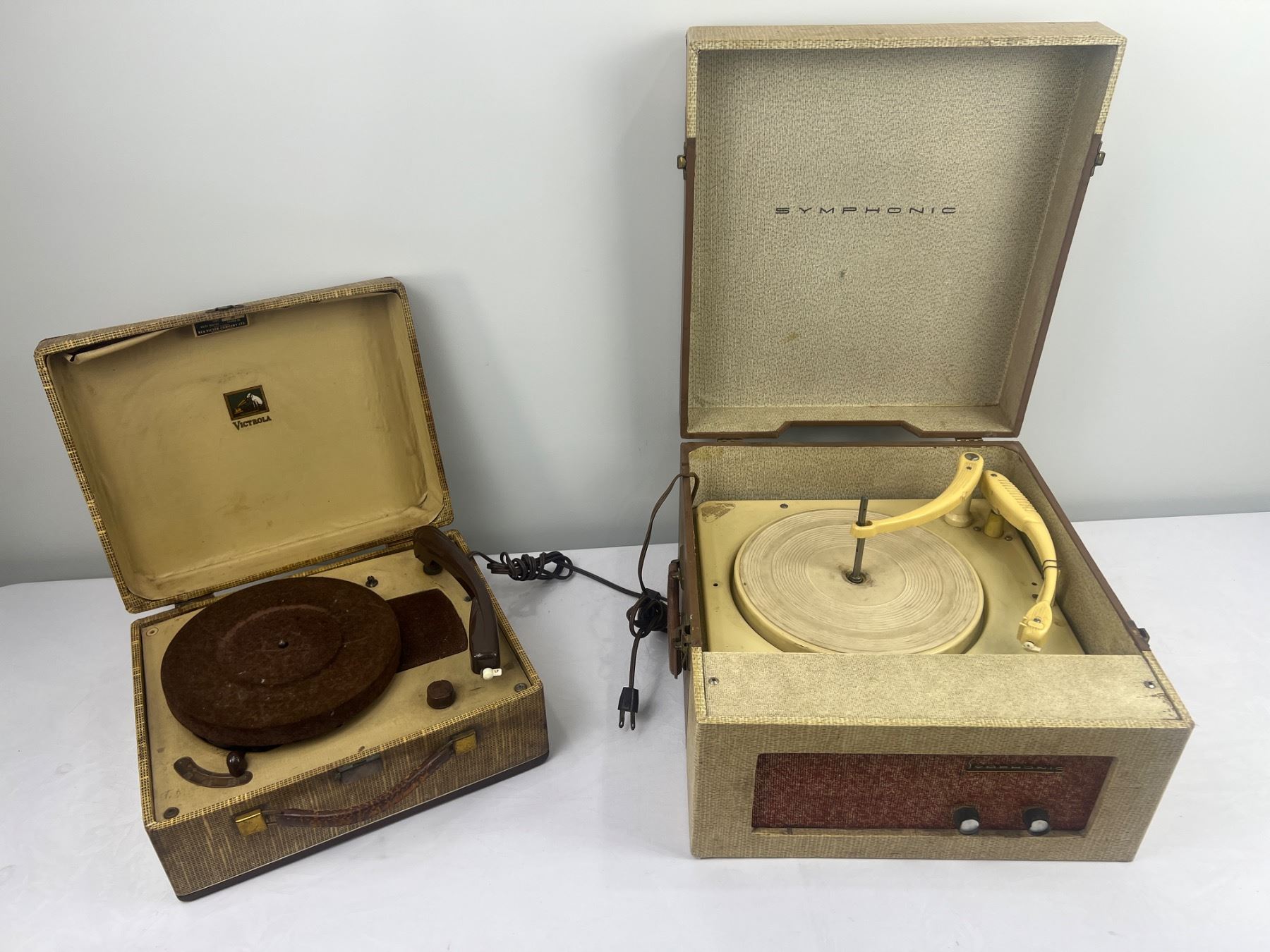 Both have some wear and tear, both have power, The Symphonic Model C851 is 16"L x 15"W x 9"H, The Victorola Model VE 42 M is 13"L x 11"W x 7.5"H