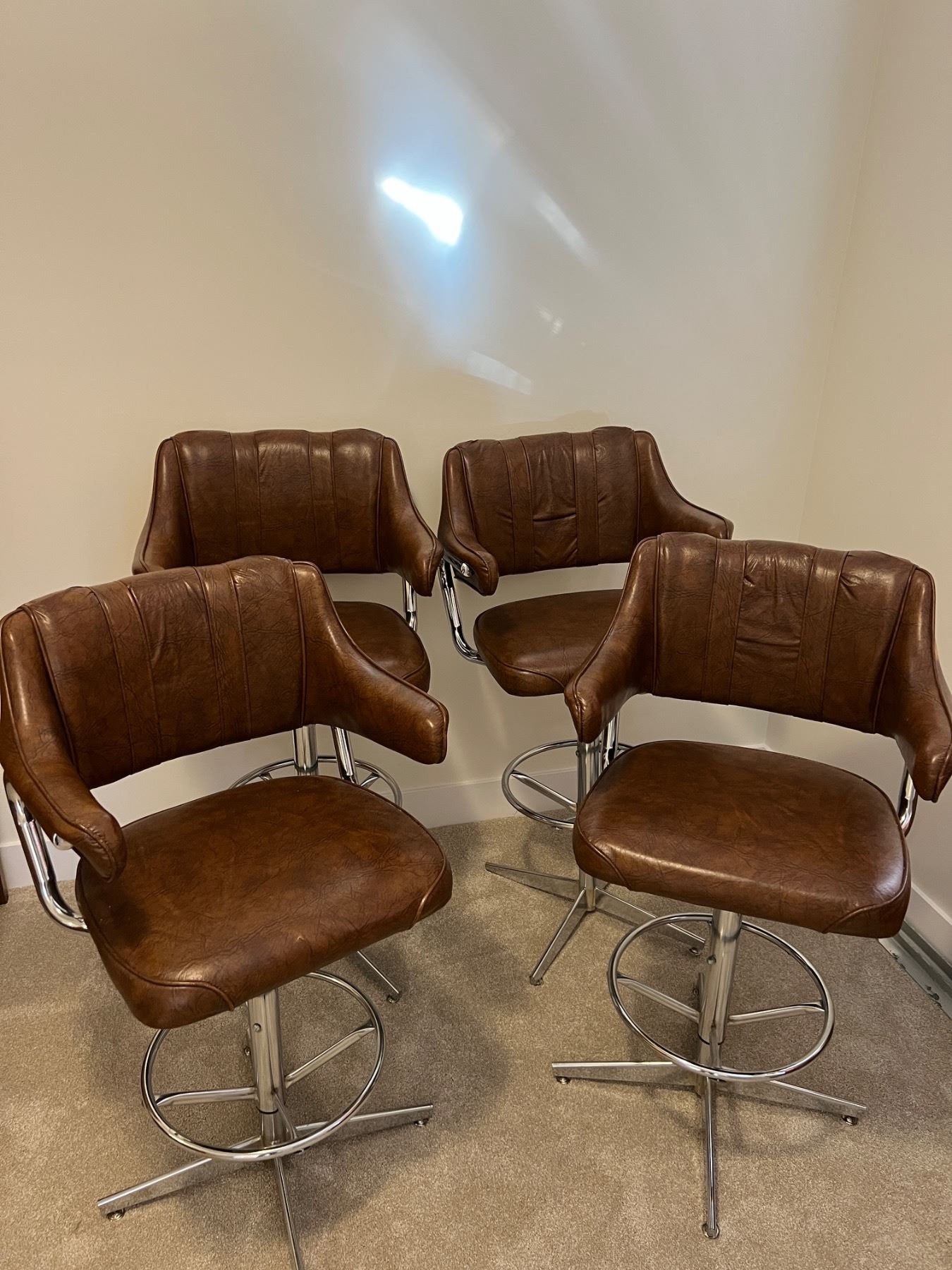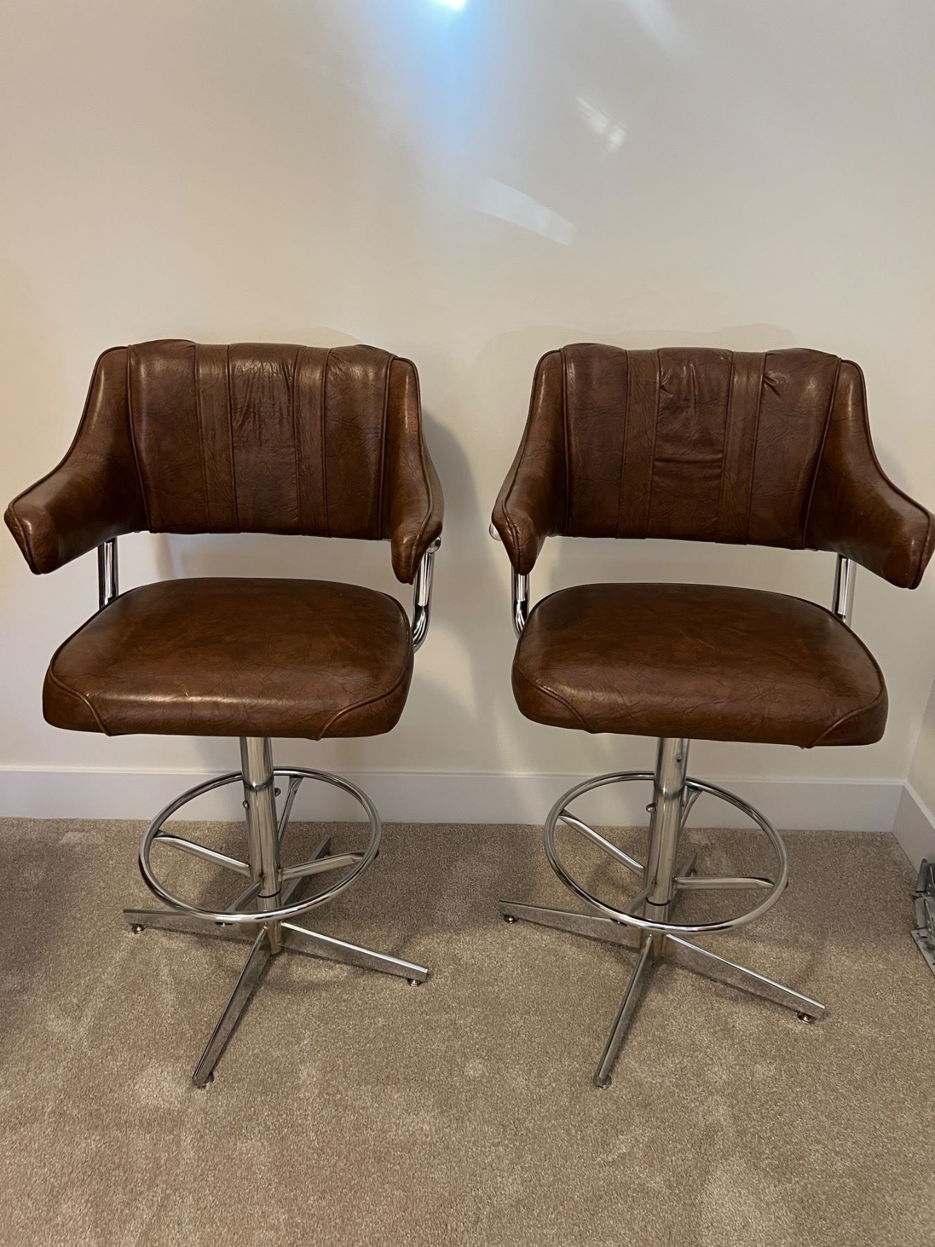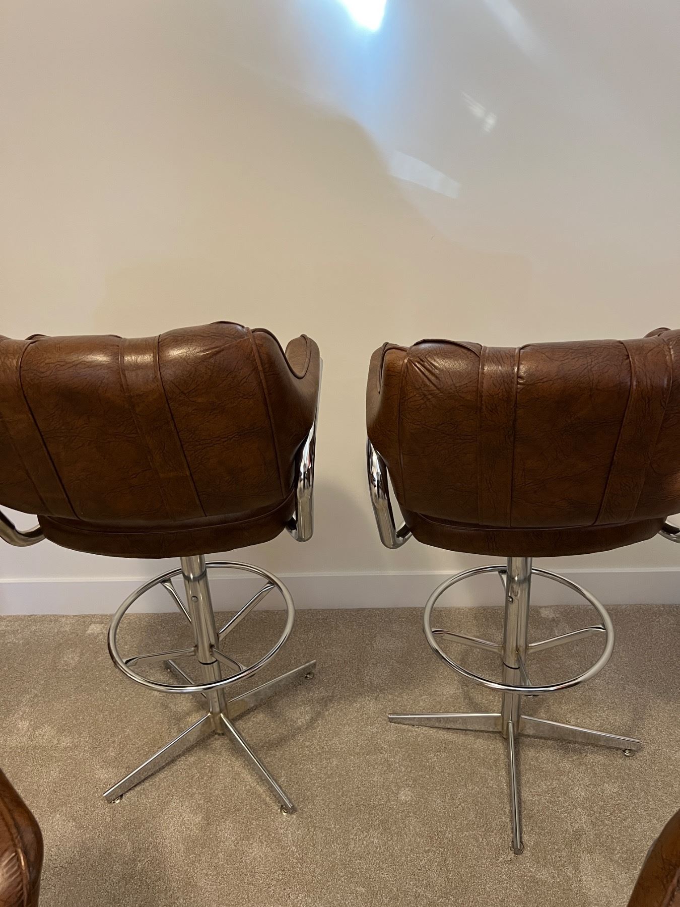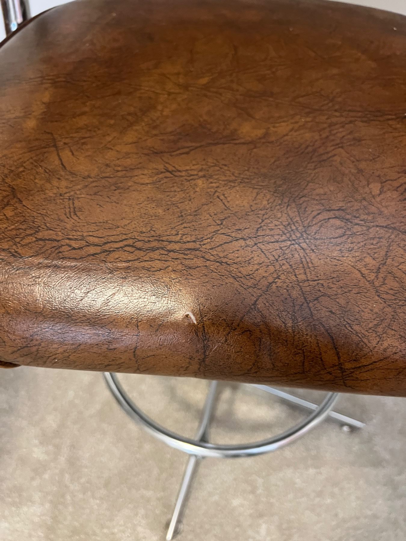 Faux leather vinyl upholstery, One foot off of one of the stools is missing, one seat has a small puncture, each one measures 22"L x 18"W x 45"H
