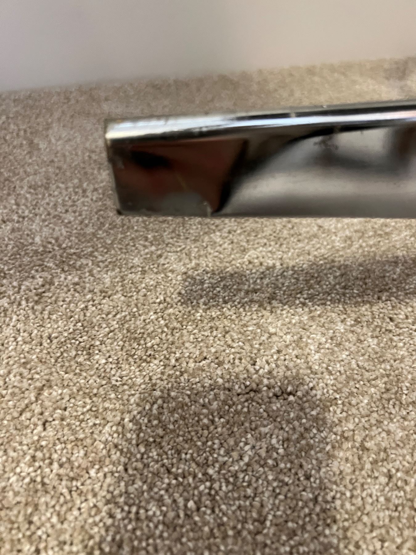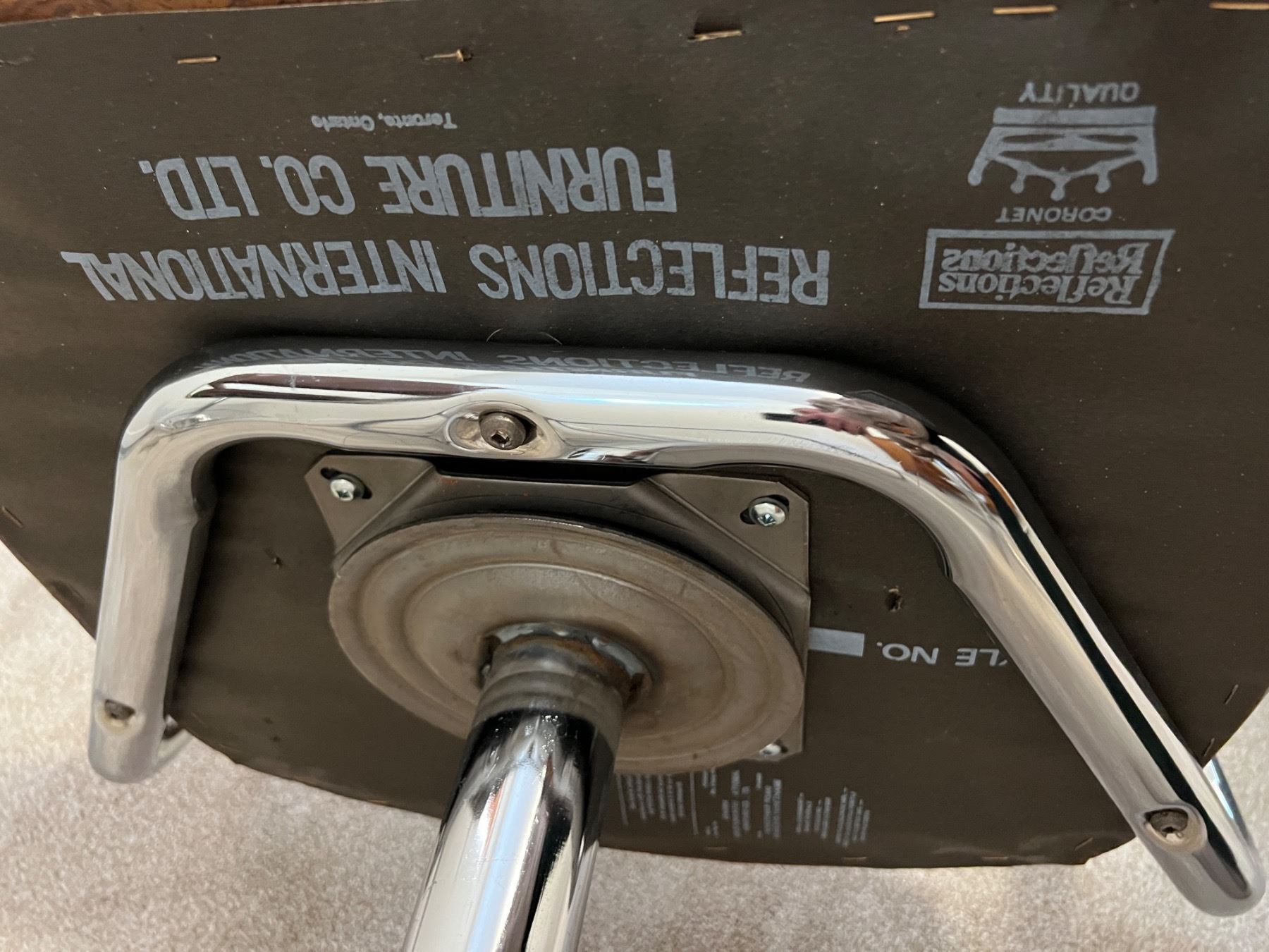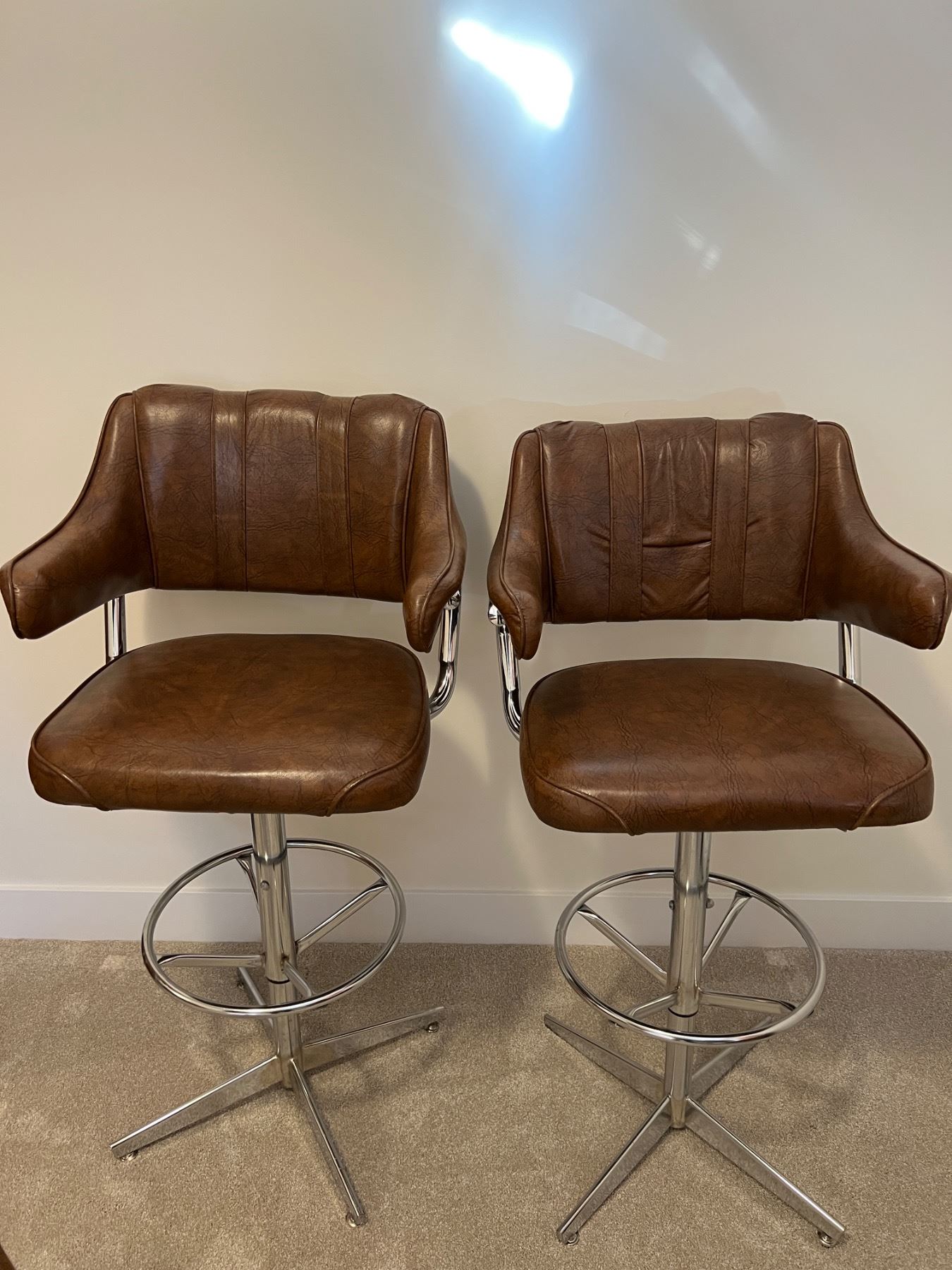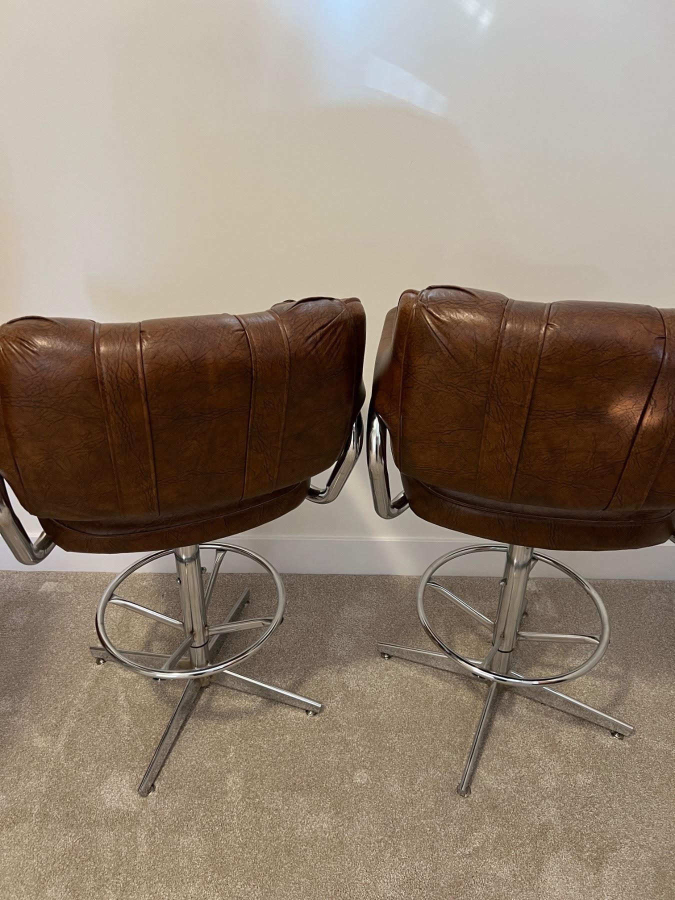Faux leather vinyl upholstery, One foot off of one of the stools is missing, one seat has a small puncture, each one measures 22"L x 18"W x 45"H