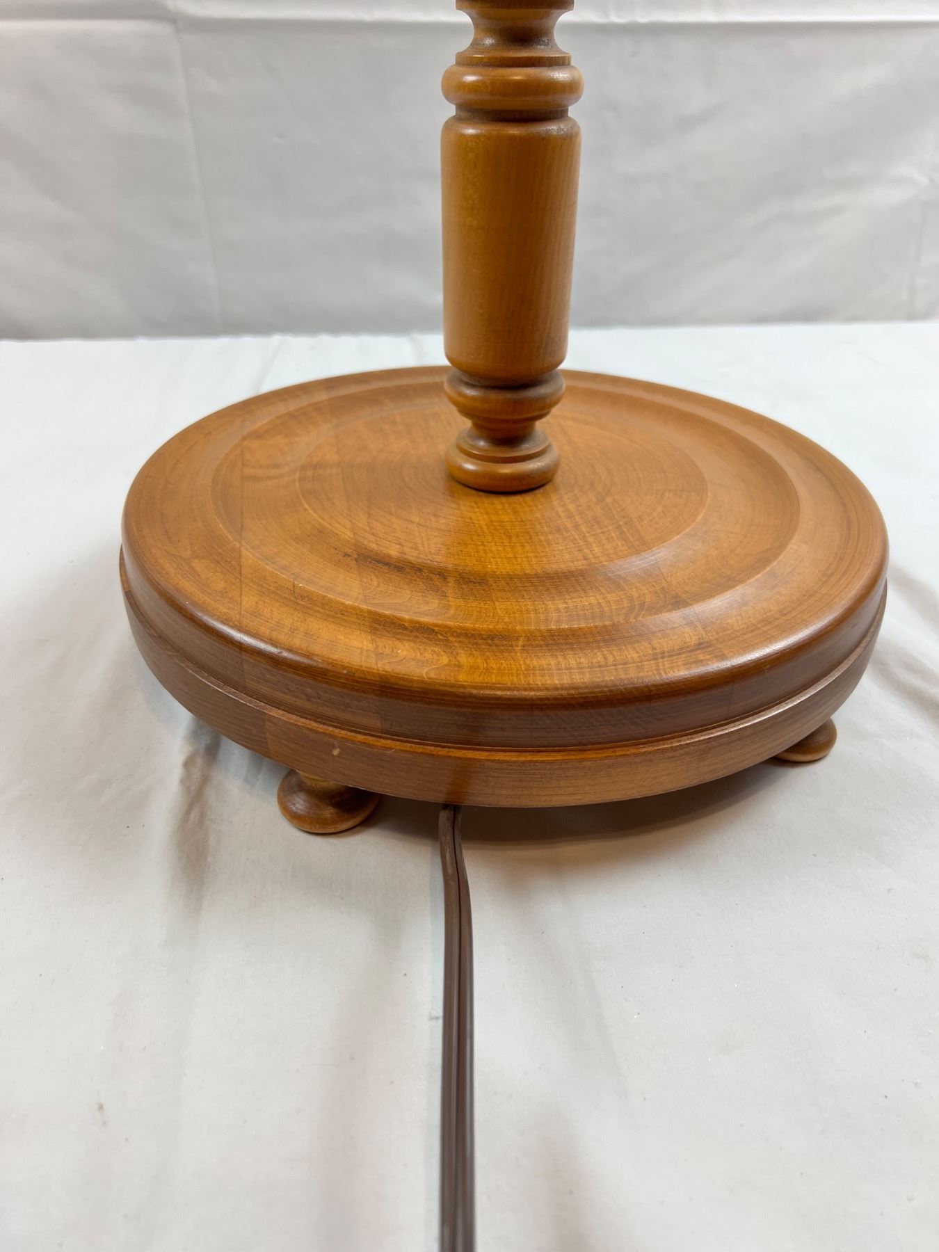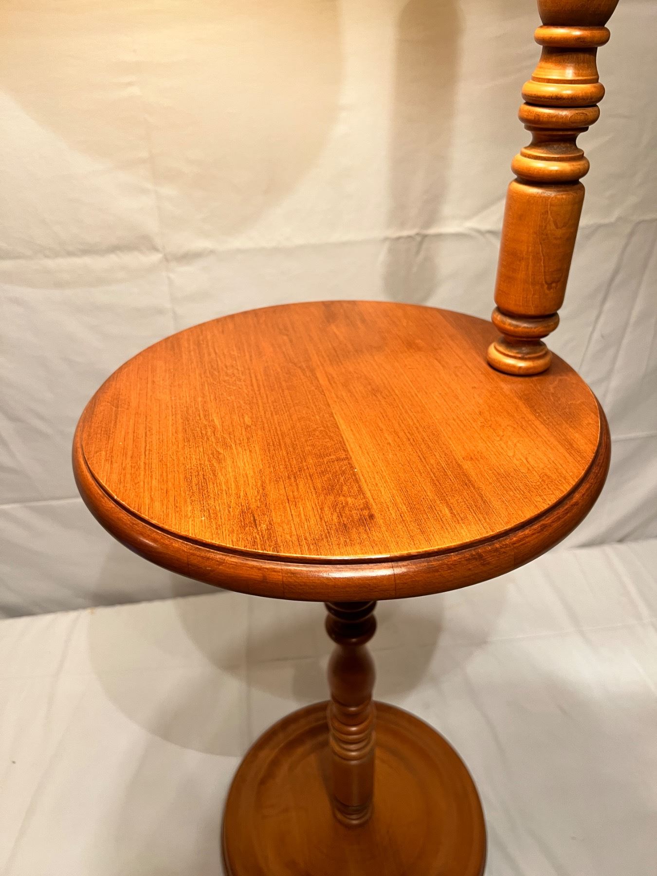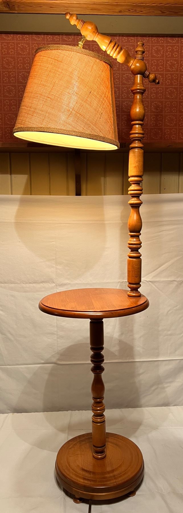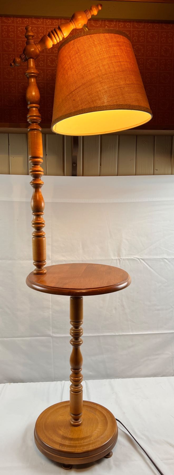 Stands 56" tall and the table has a diameter of 14". Turns on. Some scuffs to wood around base.