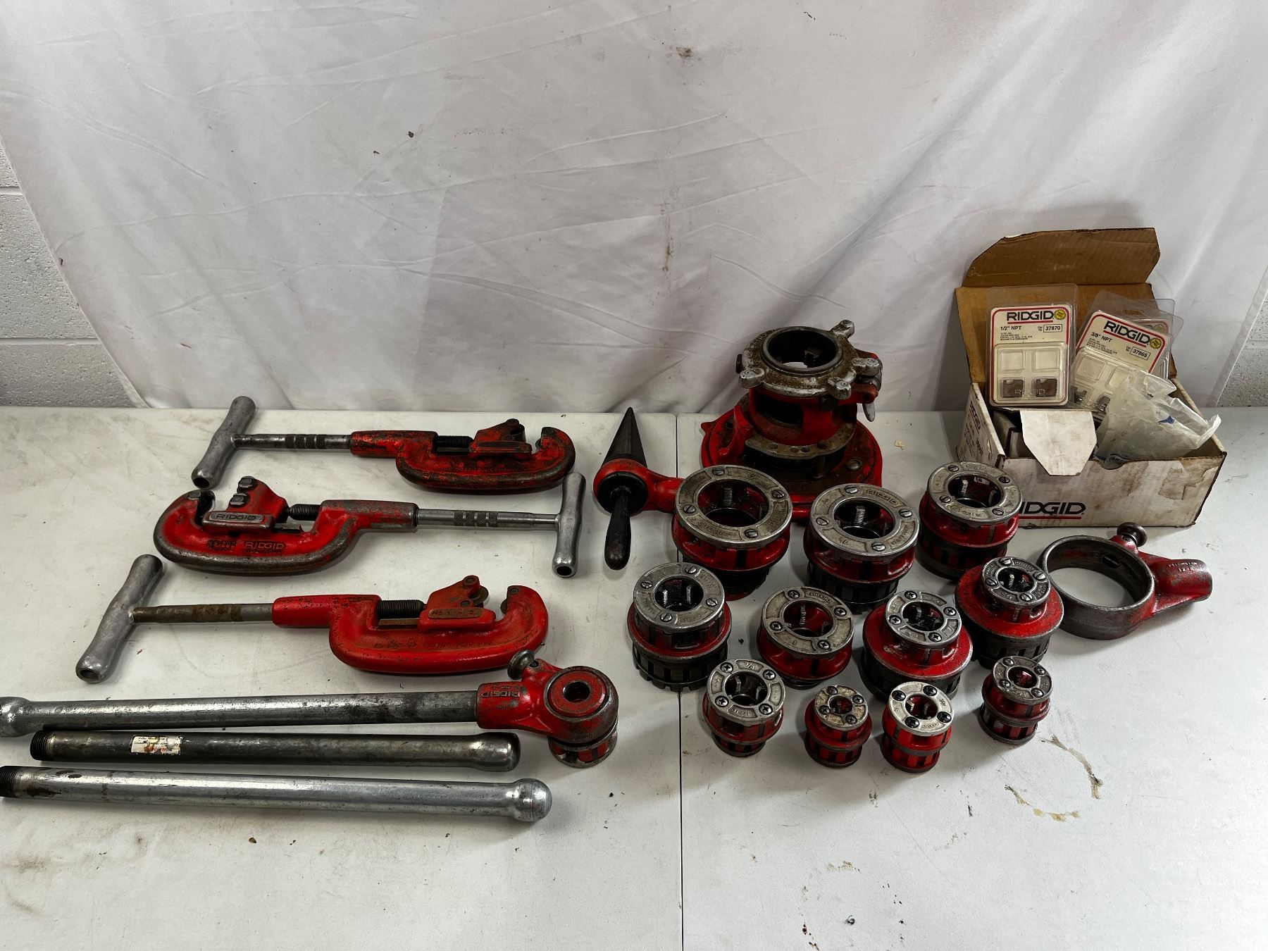 Includes, Largest; Ridgid C-418 threader, Smallest; Ridgid R32 1/8 threader, No. 1-2 & 202 clamps, various pipe dies, etc.