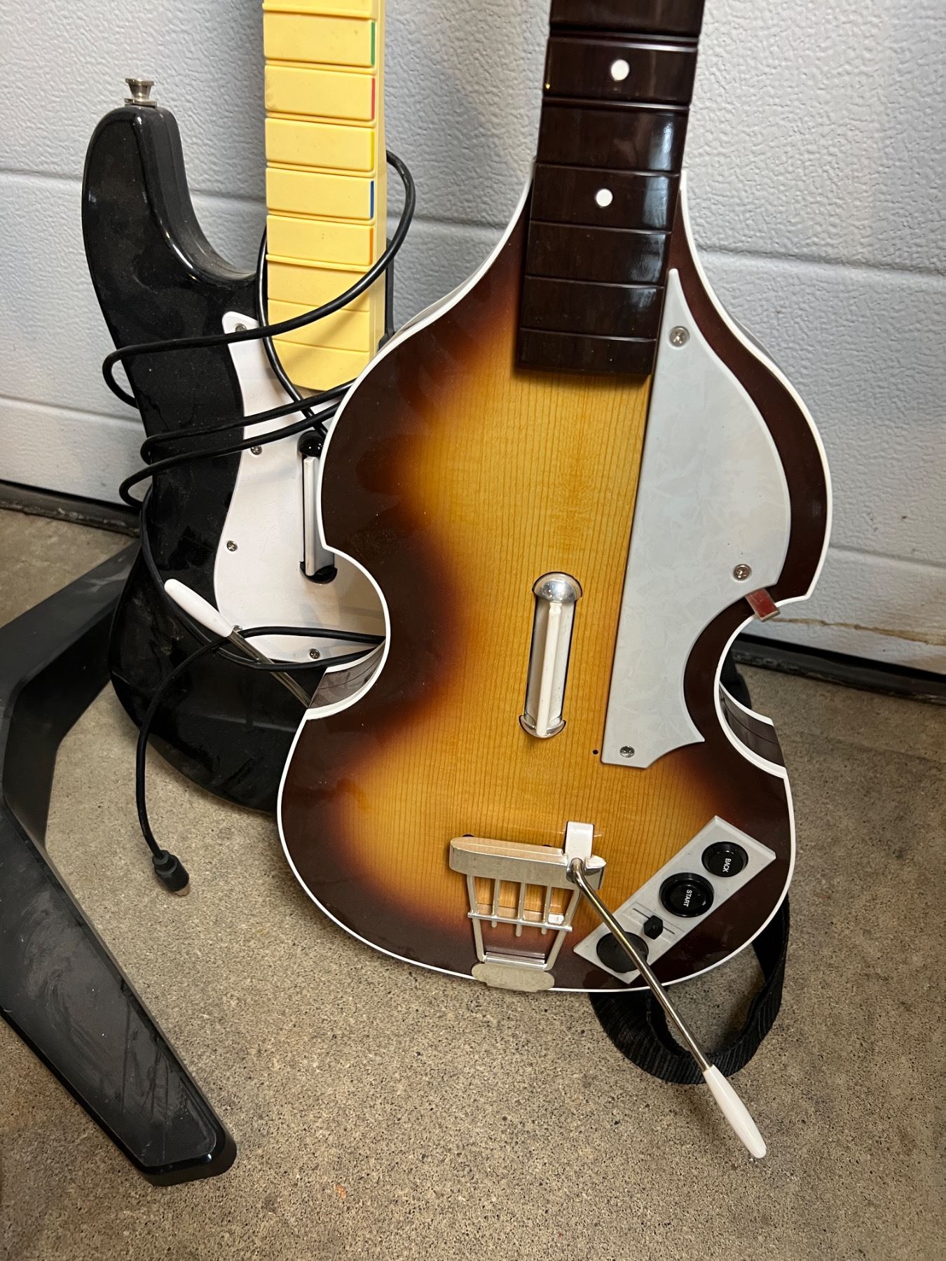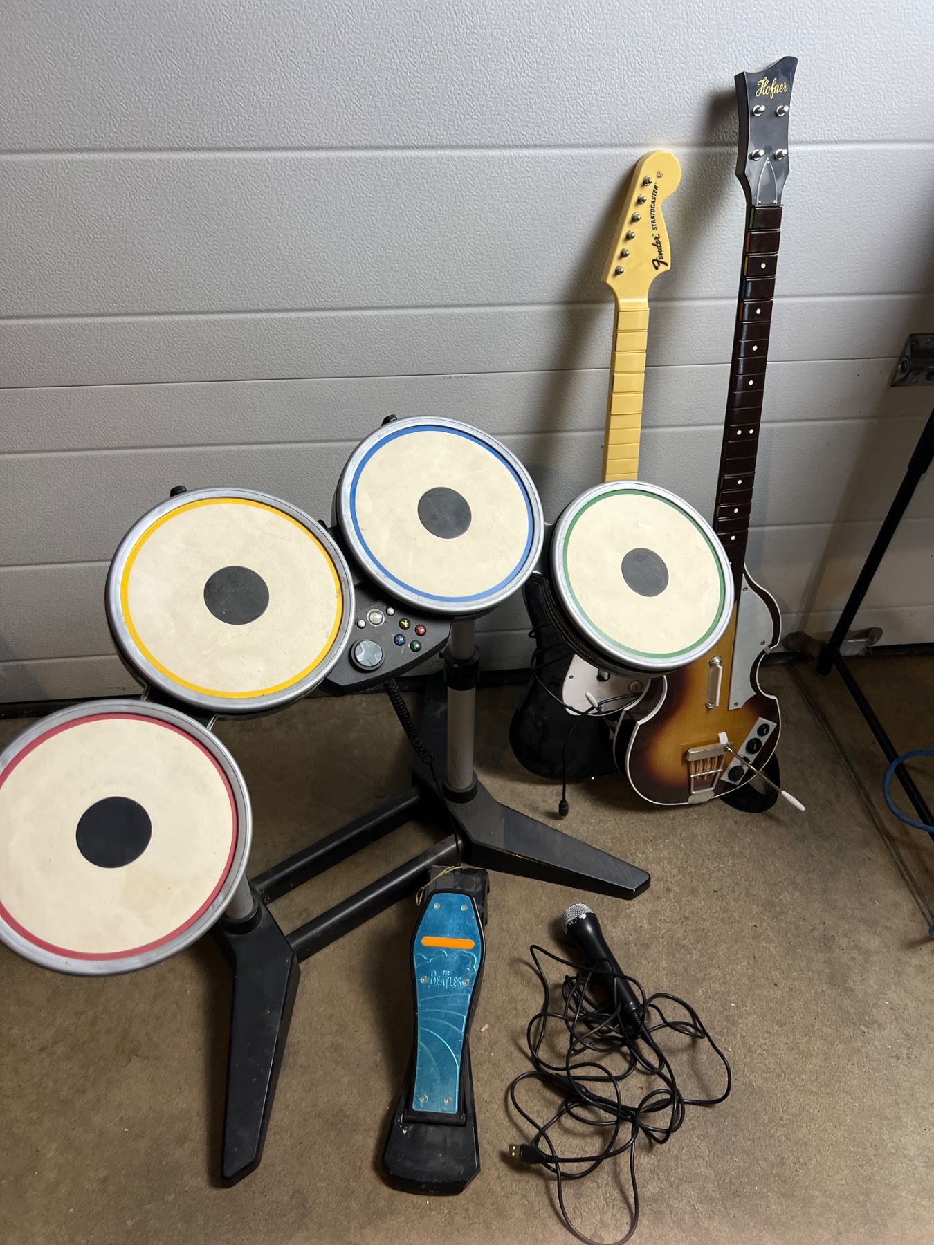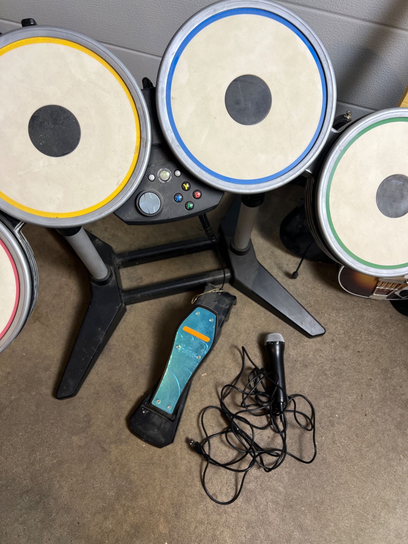 Includes, Rockband Drum Set, Rockband Guitar, Microphone, Harmonex quitar, All in unknown working condition
