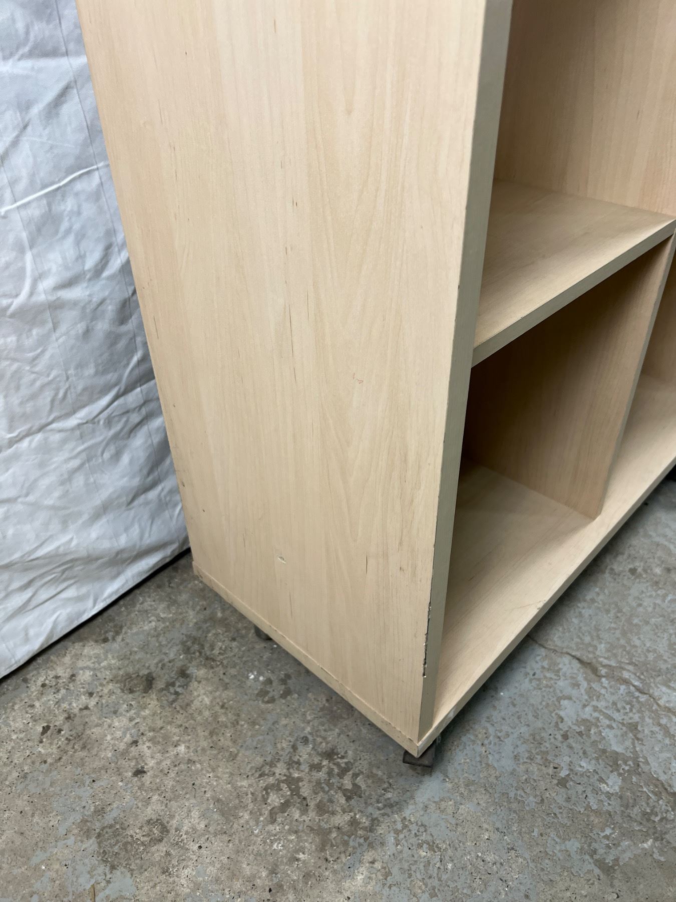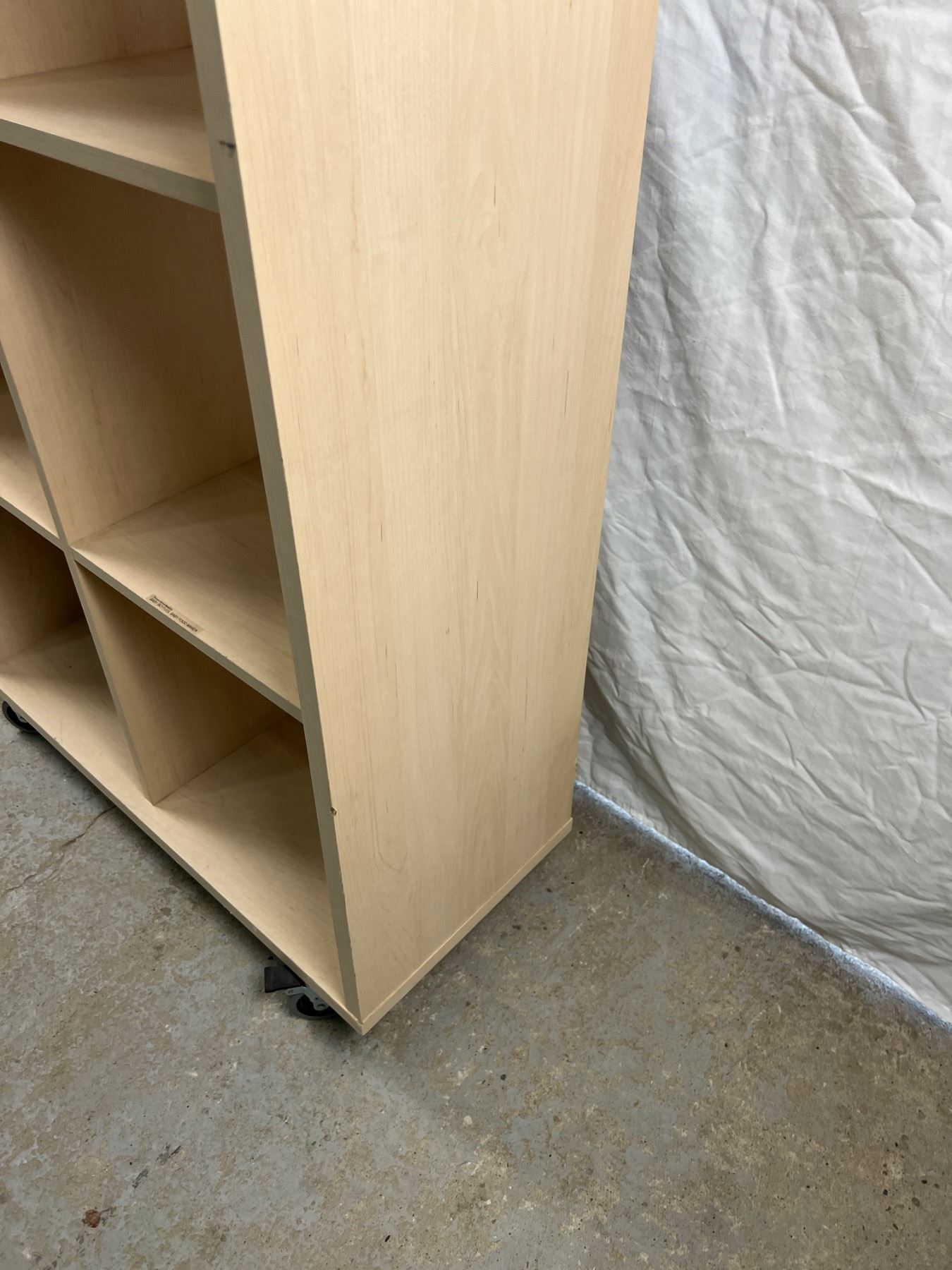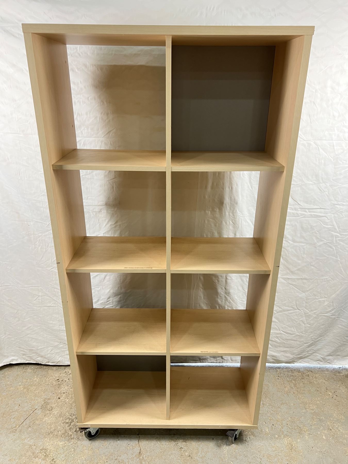 Two shelfs have stickers, on wheels, 65.5"H x 31.5"W x 13.5"D